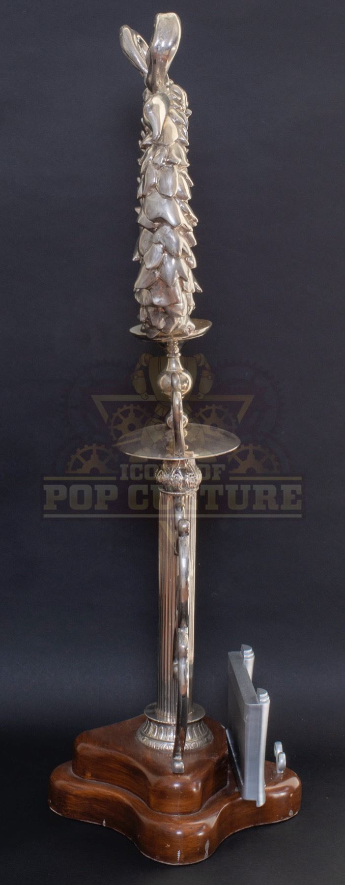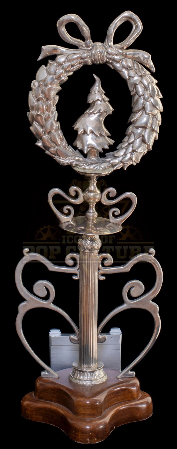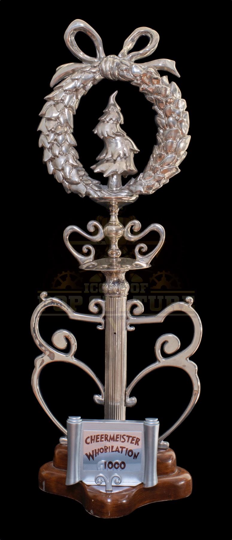 This prop trophy was custom-made by the production for use by various actors and as set dressing during filming of the Grinch’s Cheermeister ceremony during the 1000 Whobilation. The trophy stands an impressive 42” tall and features an attached plaque that reads “Cheermeister – Whobilation 1000”. The trophy is a very iconic prop from one of the most memorable scenes in the film. The hero prop trophy is made of cast metal wreath, with other metal and resin components with silver and wood finish and weighs over 16 pounds.