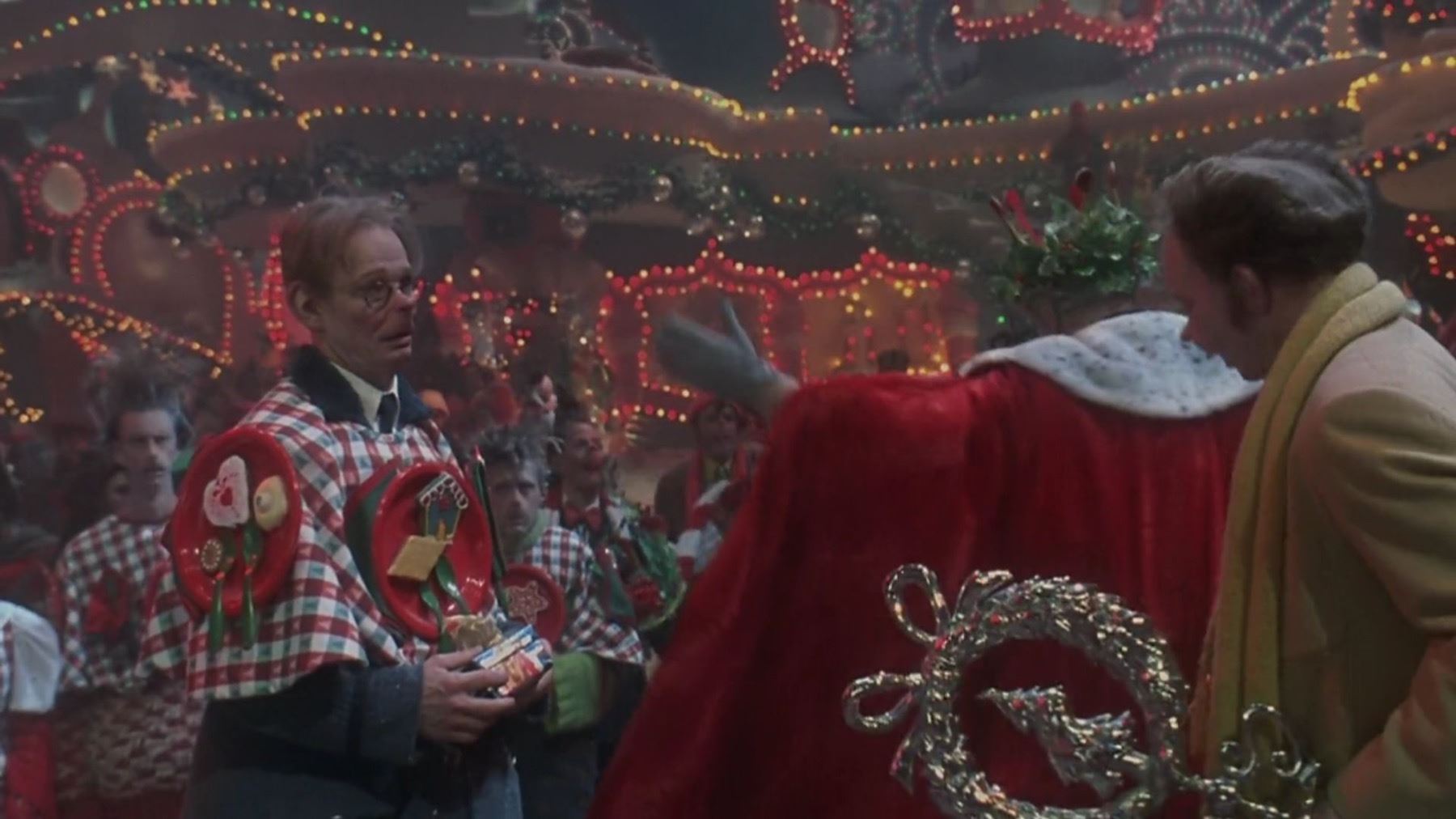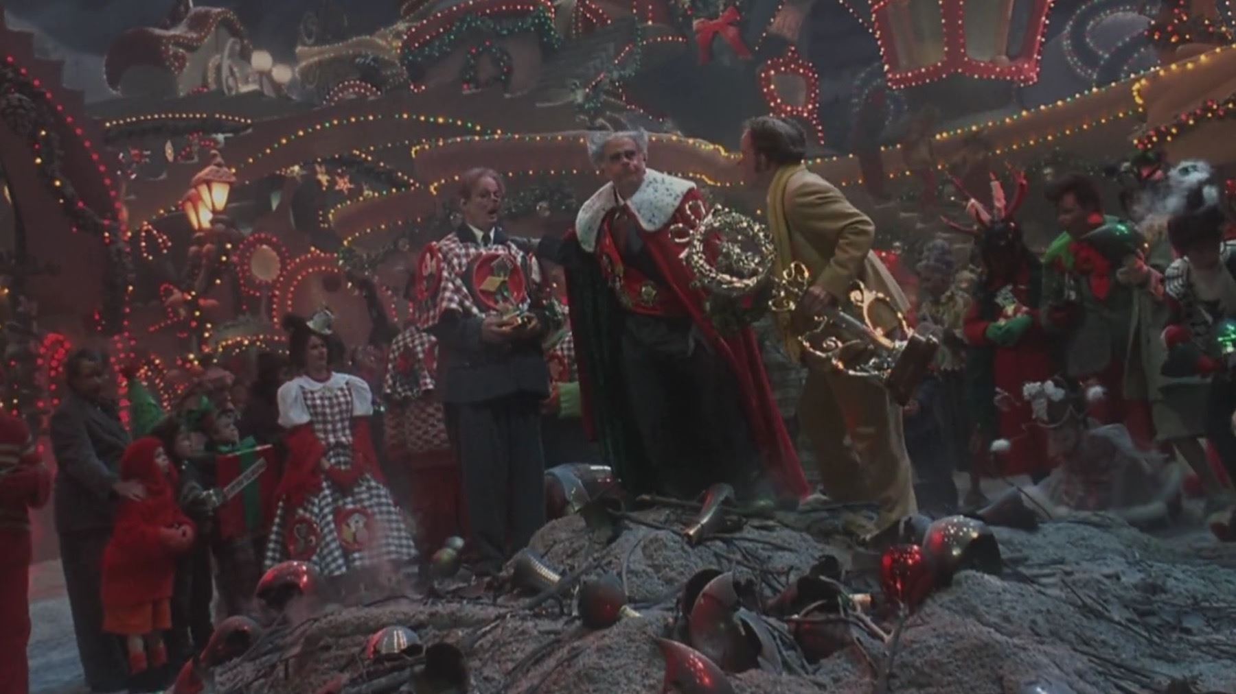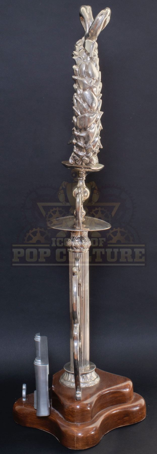This prop trophy was custom-made by the production for use by various actors and as set dressing during filming of the Grinch’s Cheermeister ceremony during the 1000 Whobilation. The trophy stands an impressive 42” tall and features an attached plaque that reads “Cheermeister – Whobilation 1000”. The trophy is a very iconic prop from one of the most memorable scenes in the film. The hero prop trophy is made of cast metal wreath, with other metal and resin components with silver and wood finish and weighs over 16 pounds.