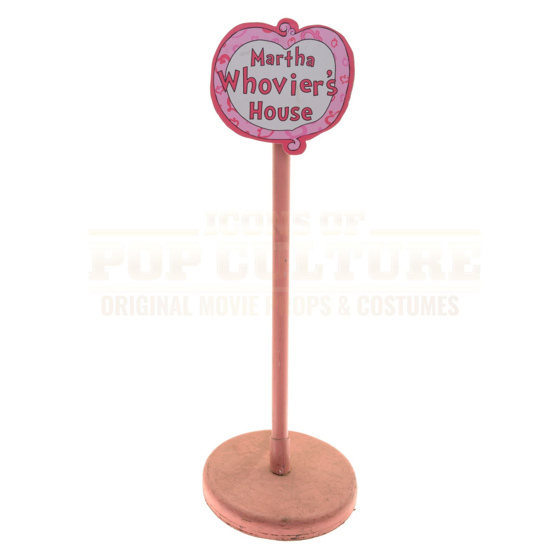 This free-standing sign was created by the studio for a prop and costume exhibition after the film’s release. The sign is constructed of a metal base, curved metal pole and custom shaped plastic sign with a “Martha Whovier’s House” graphic applied. The sign stands 53” tall.