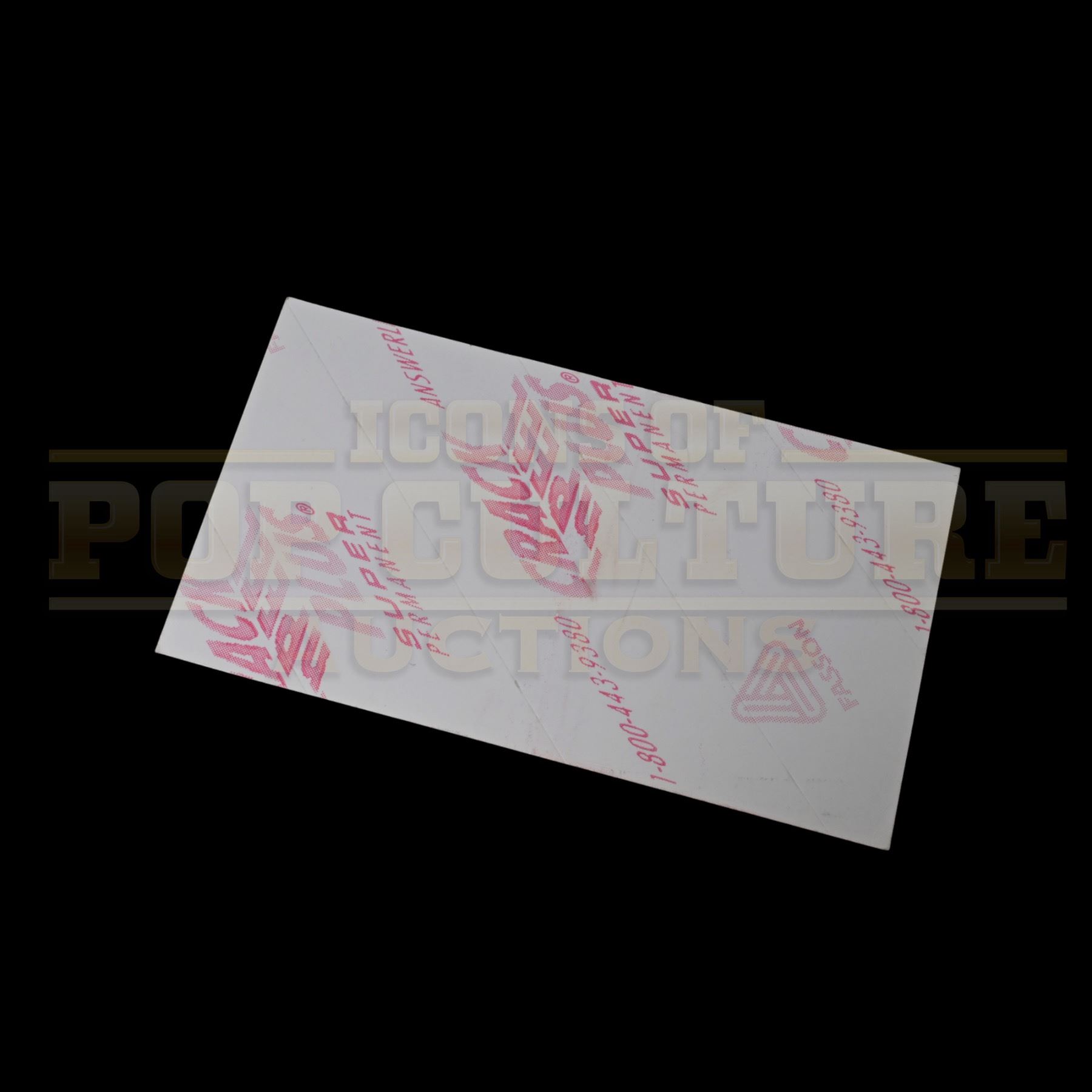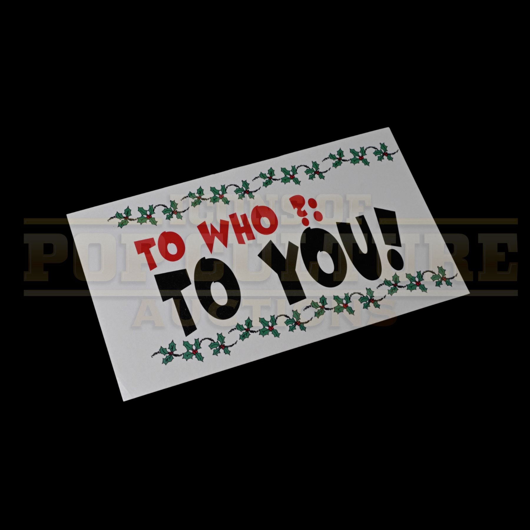 Measuring approximately 5" x 3", this unused production-made adhesive label features the bold, playful message “TO WHO? TO YOU!” in large red and black lettering, surrounded by a holly leaf border, a perfect representation of Whoville’s quirky, over-the-top holiday spirit. The reverse retains its original backing paper, marked with “Crack ‘n Peel” branding, showing that it was prepared for potential use on-screen or as part of the elaborate set dressing in the Whoville gift sequences.