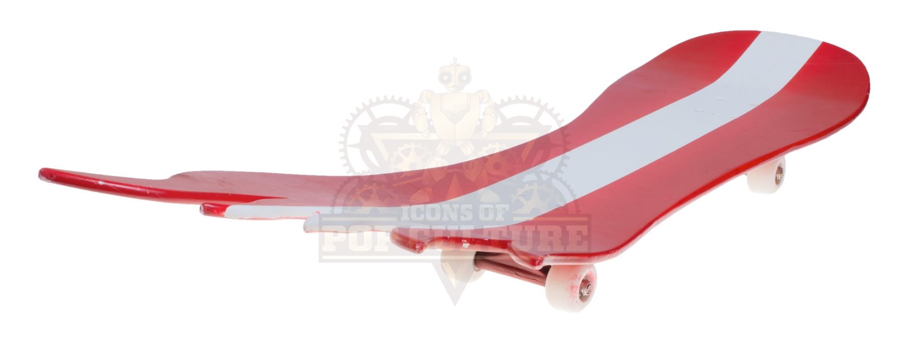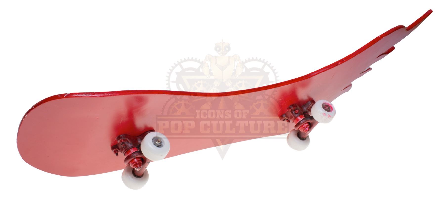 This prop skateboard was custom-made by the production for use by various actors and as set dressing. The red and white skateboard measures 39.5” x 13” and features a “flame” style cut in the back.