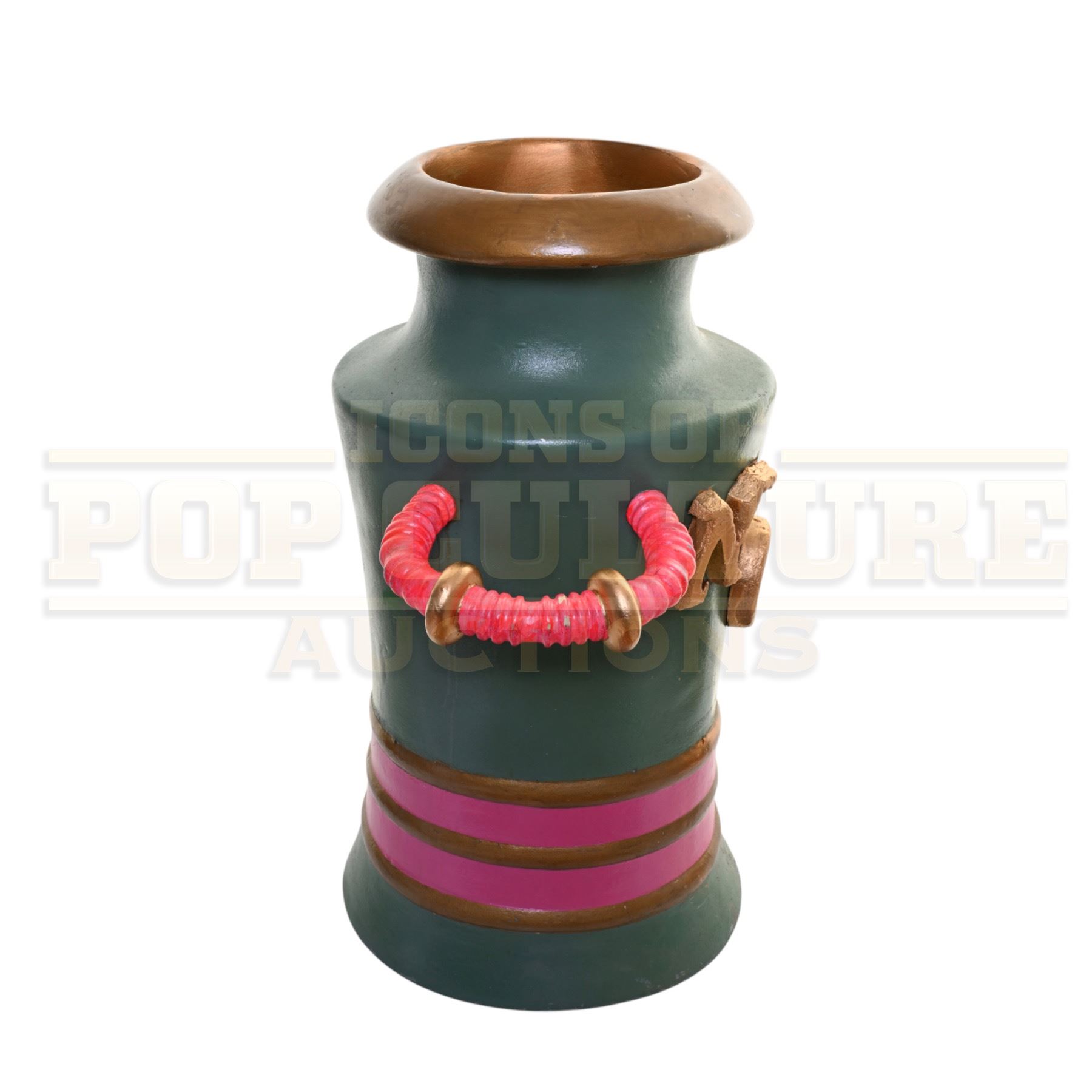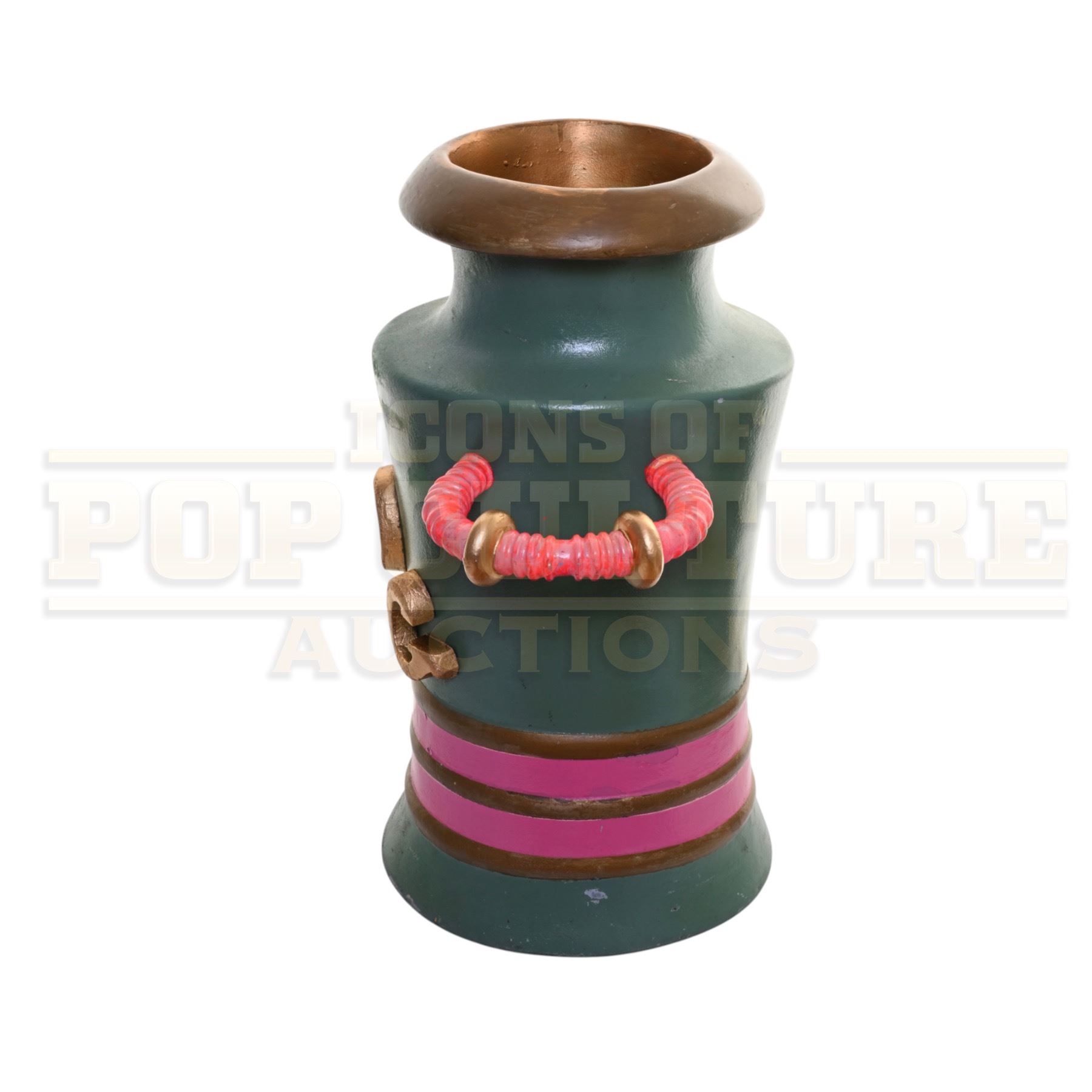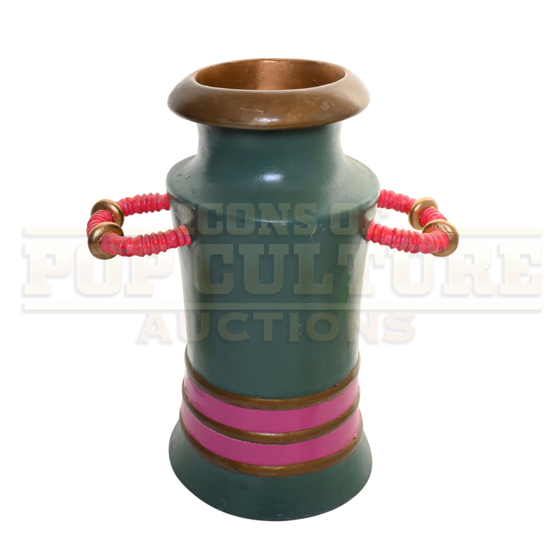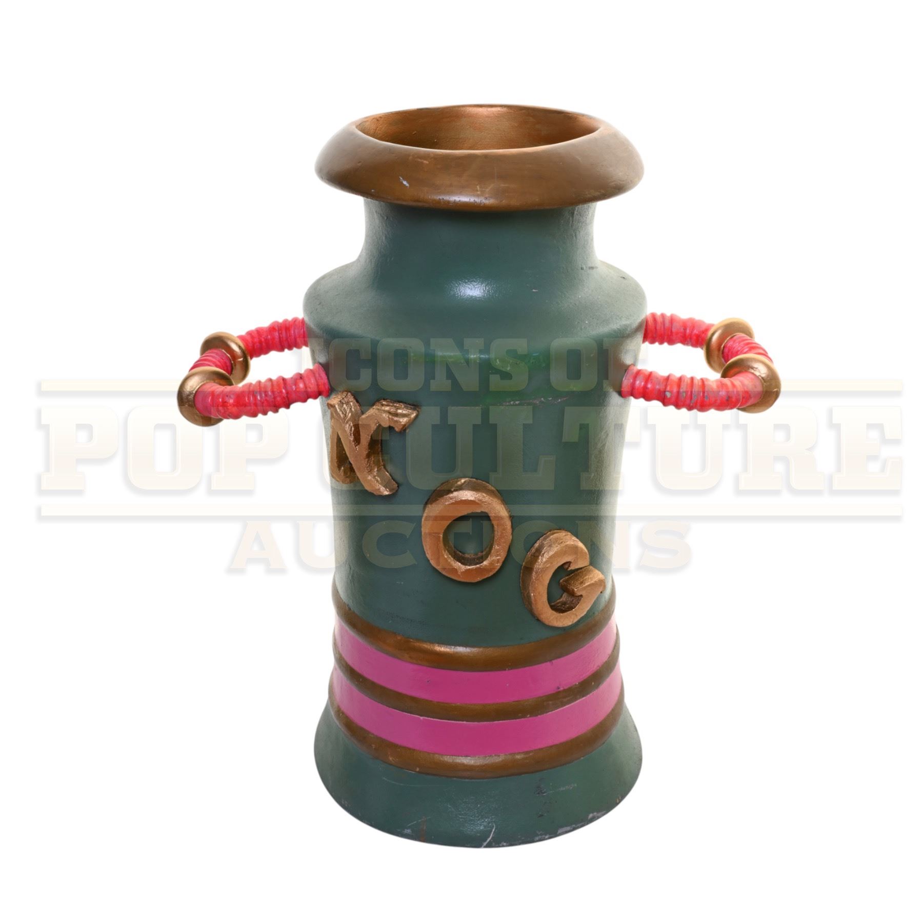Standing an impressive 31” tall x 27” x 16”, this Seussian creation perfectly embodies the eccentric and colorful world of Whoville. Constructed from various materials and finished in a rich green with metallic bronze accents, the container features raised gold-tone letters spelling “NOG” across the front and vibrant pink and red decorative detailing. The dual coiled handles and flared rim give it a playful, handcrafted quality characteristic of the film’s imaginative design aesthetic.
