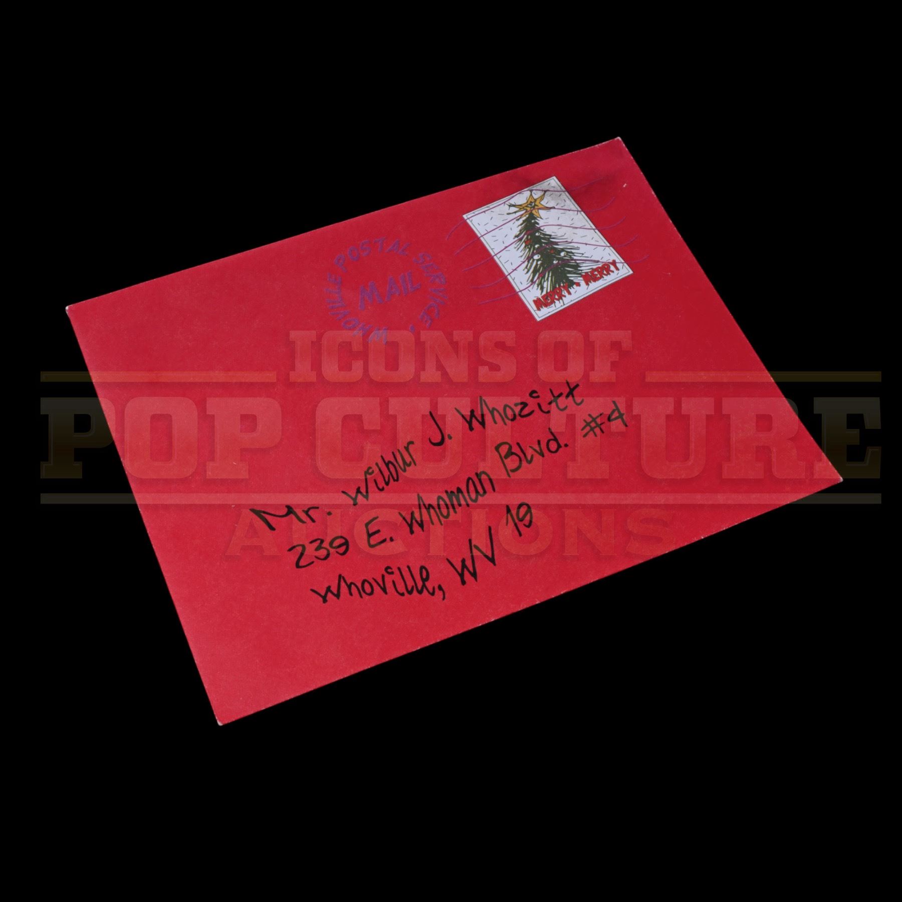 A festive production-made Whoville mail prop envelope from Ron Howard’s How the Grinch Stole Christmas (2000), the beloved holiday film starring Jim Carrey as the iconic Grinch.