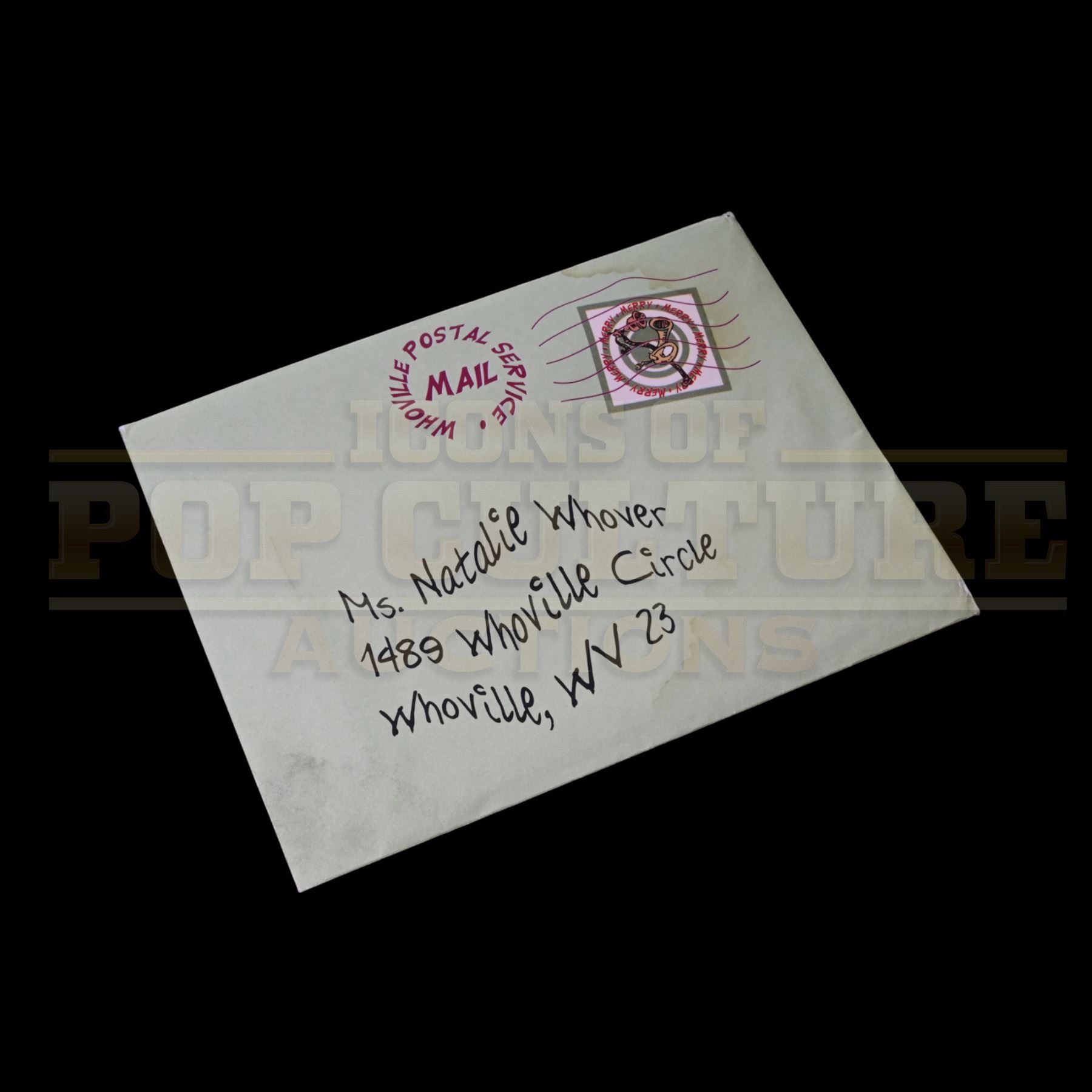 This production-made envelope, measuring approximately 4.75" x 6.5", was created for use in the film’s Whoville Post Office sequences, which feature the Grinch’s chaotic antics among mountains of Christmas mail. The envelope is addressed to “Ms. Natalie Whoever, 1489 Whoville Circle, Whoville, WV 23”, with a festive Whoville Postal Service stamp and postmark printed on the front, complete with a whimsical design of a sleigh-riding character.