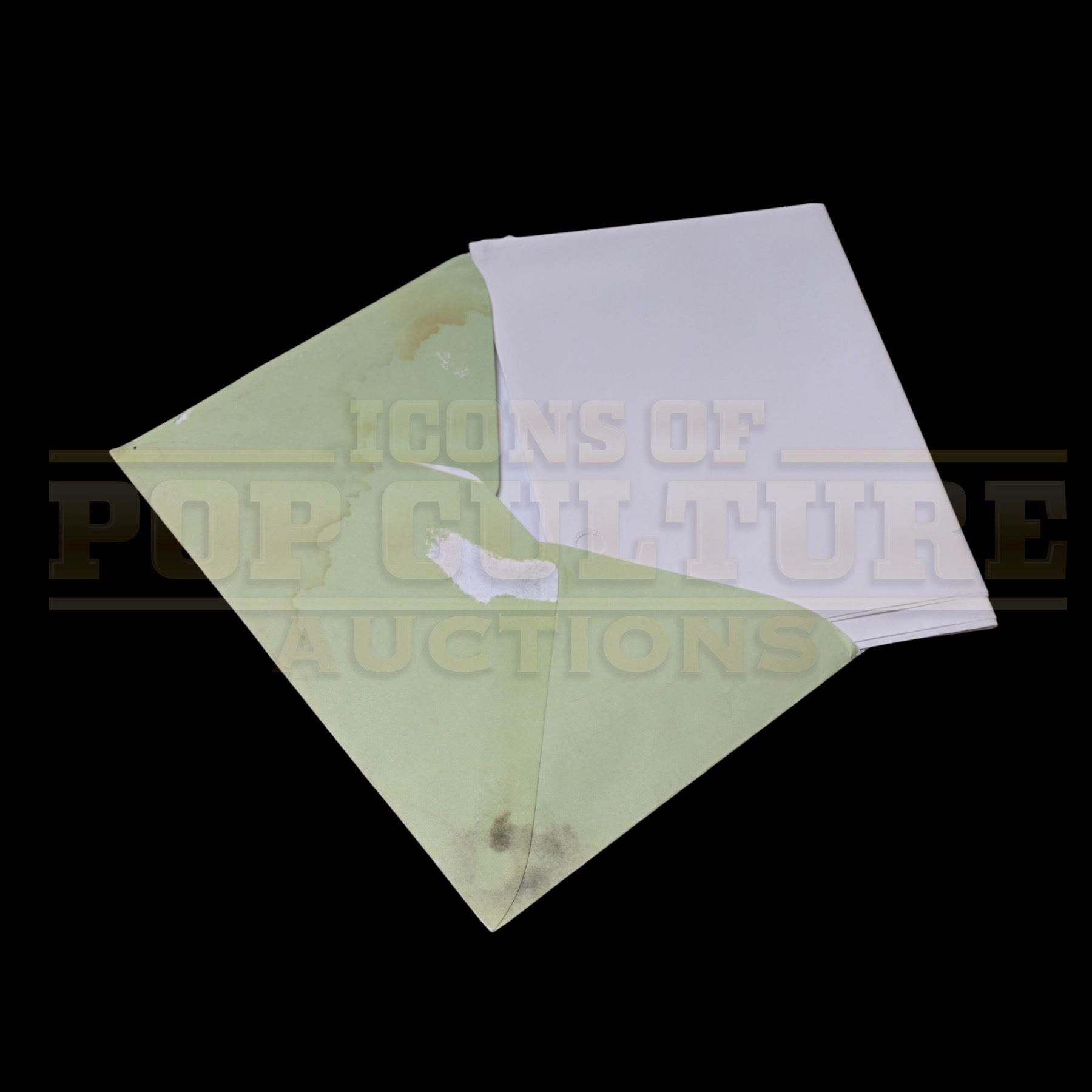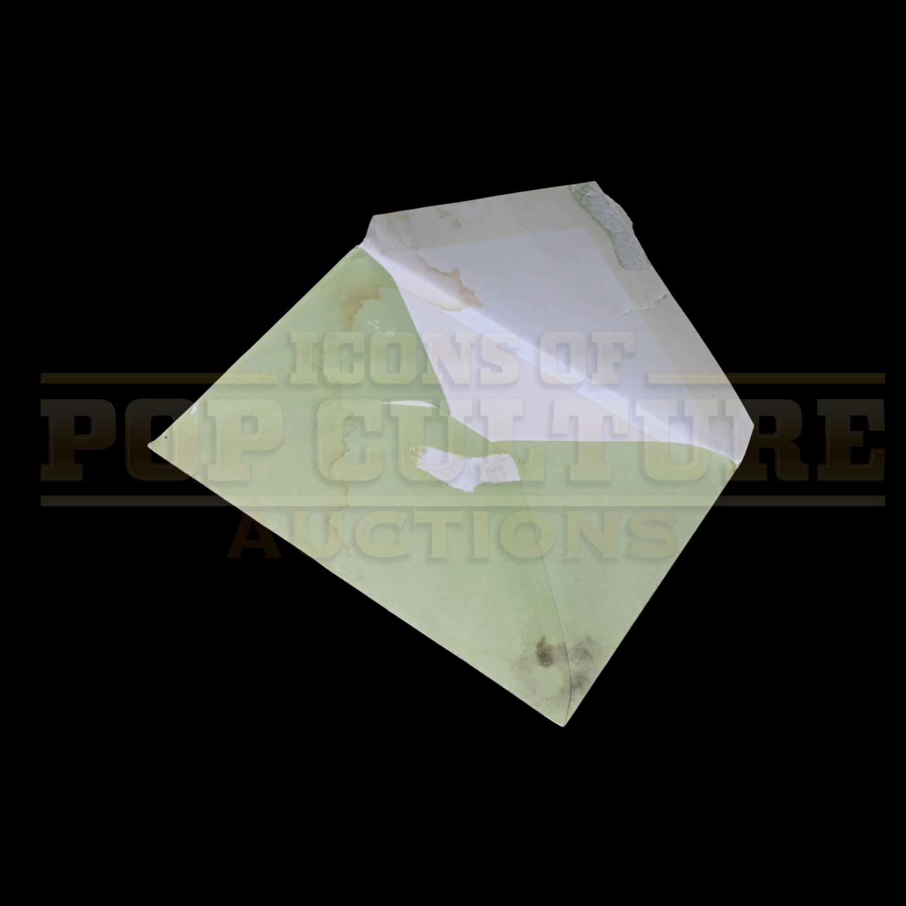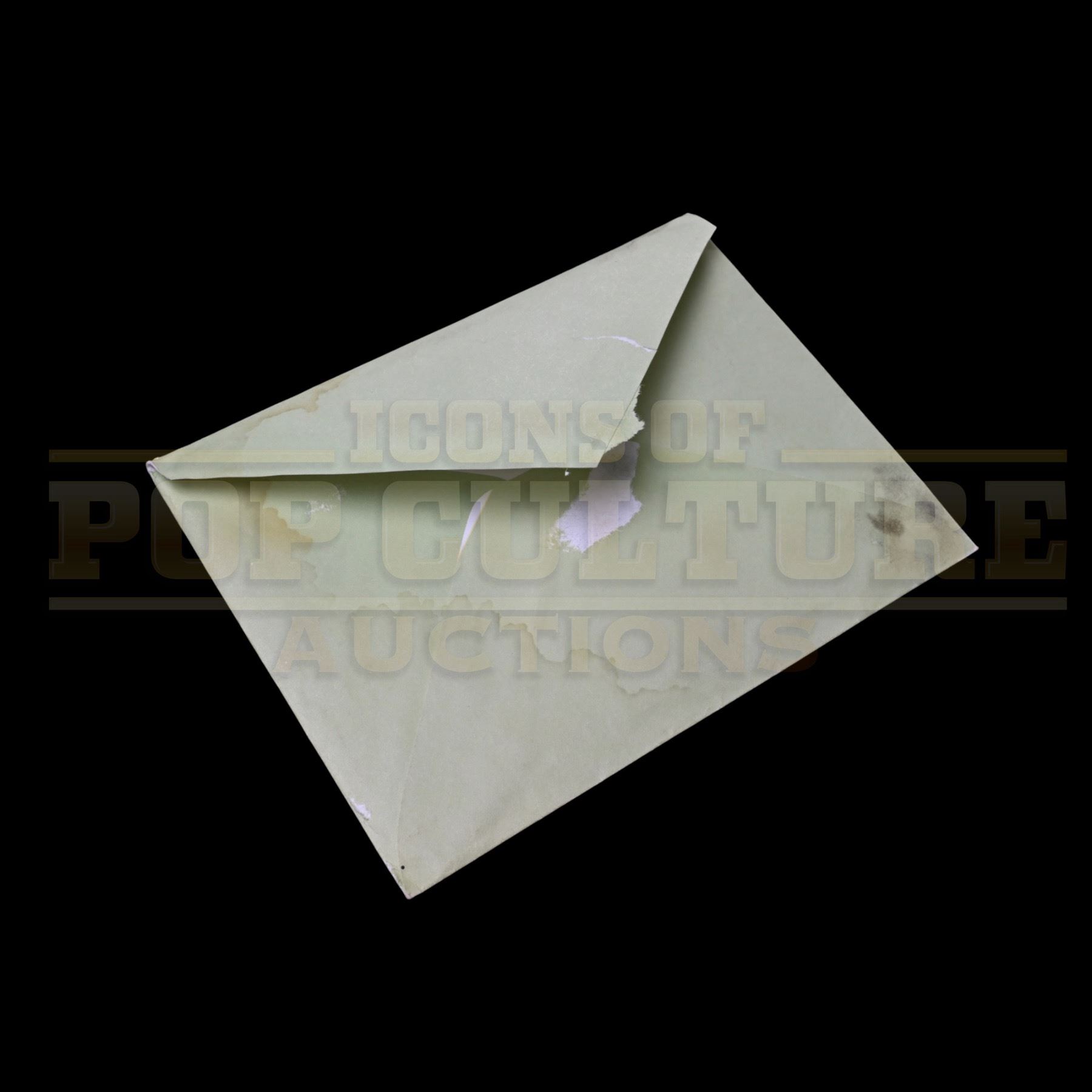 The envelope shows visible studio handling and artificial distressing. It even includes a folded insert to give it realistic weight on screen.