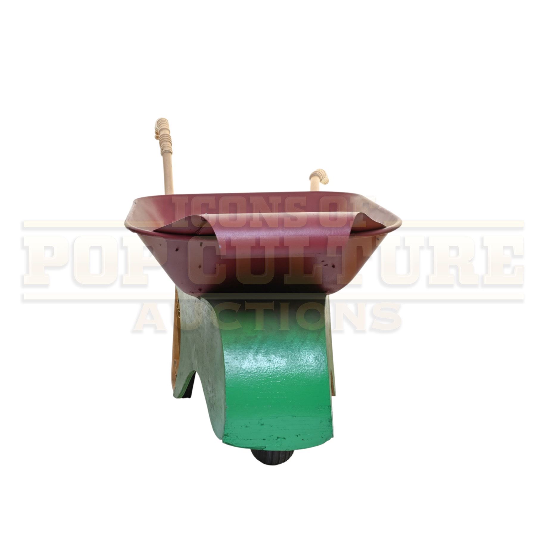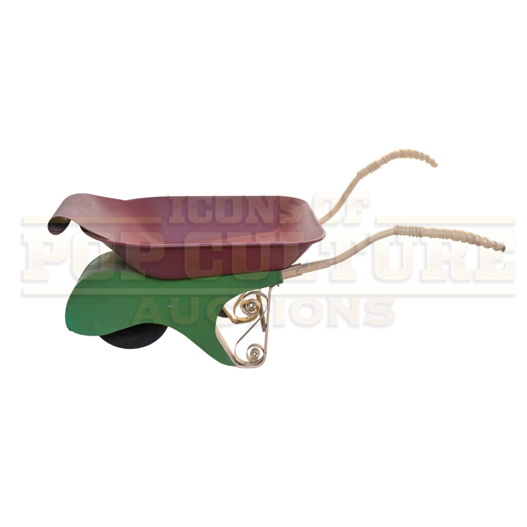 Measuring an impressive 67” x 27” x 30”, this prop wheelbarrow captures the unmistakable Seussian aesthetic with its curved, asymmetrical design, scrollwork metal accents, and playful color palette of deep red, green, and cream. The twisted handle grips and exaggerated contours embody the handcrafted, cartoon-like charm that defined the look of Whoville throughout the production.