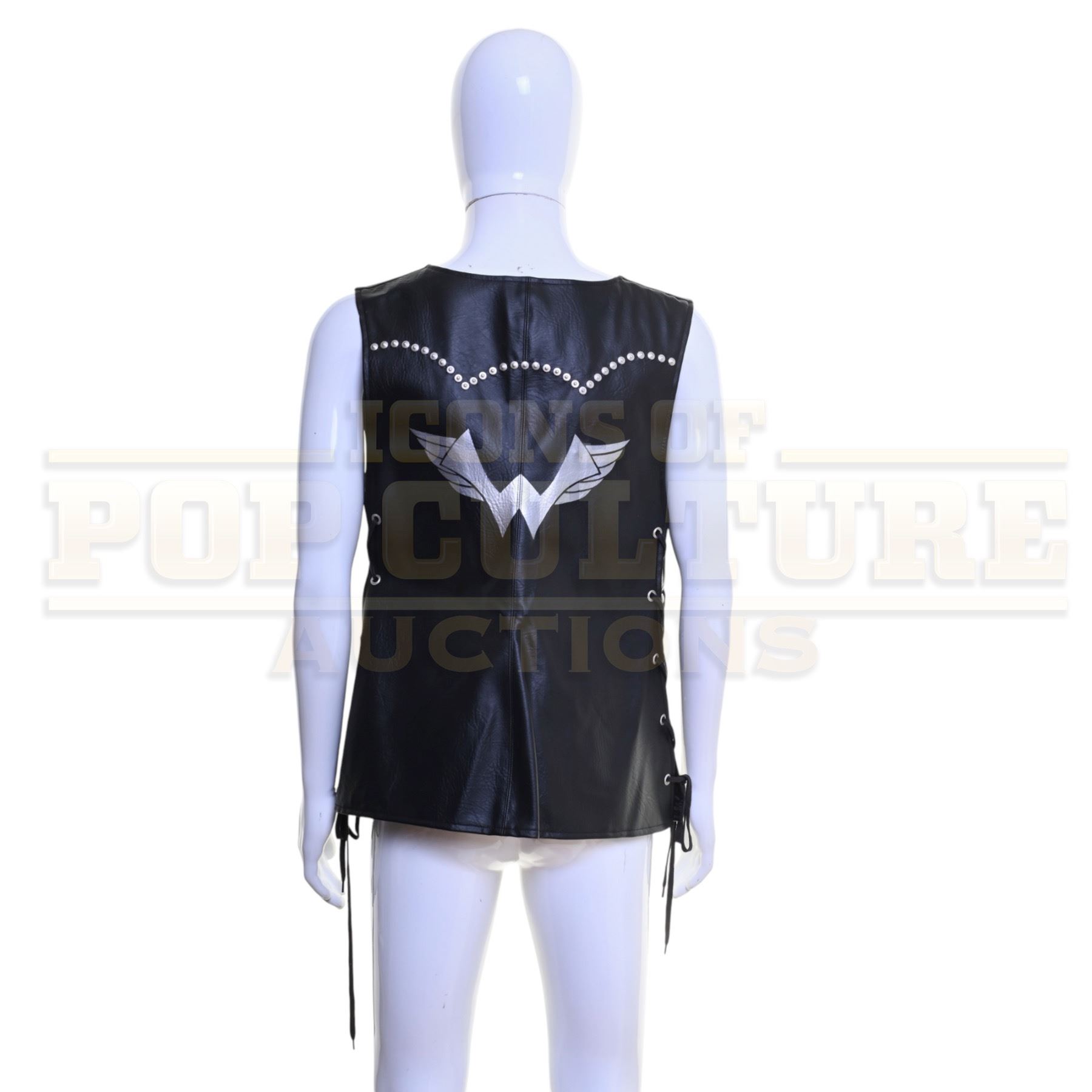 Made of black faux leather, the vest features pearlized stud detailing across the chest and shoulders and a striking silver “W” emblem with stylized wings on the back, representing Whoville or possibly a fictional “Who-Davidson” motorcycle club. The sides are fitted with lace-up adjustments, giving it a rugged yet whimsical look consistent with the film’s quirky tone.