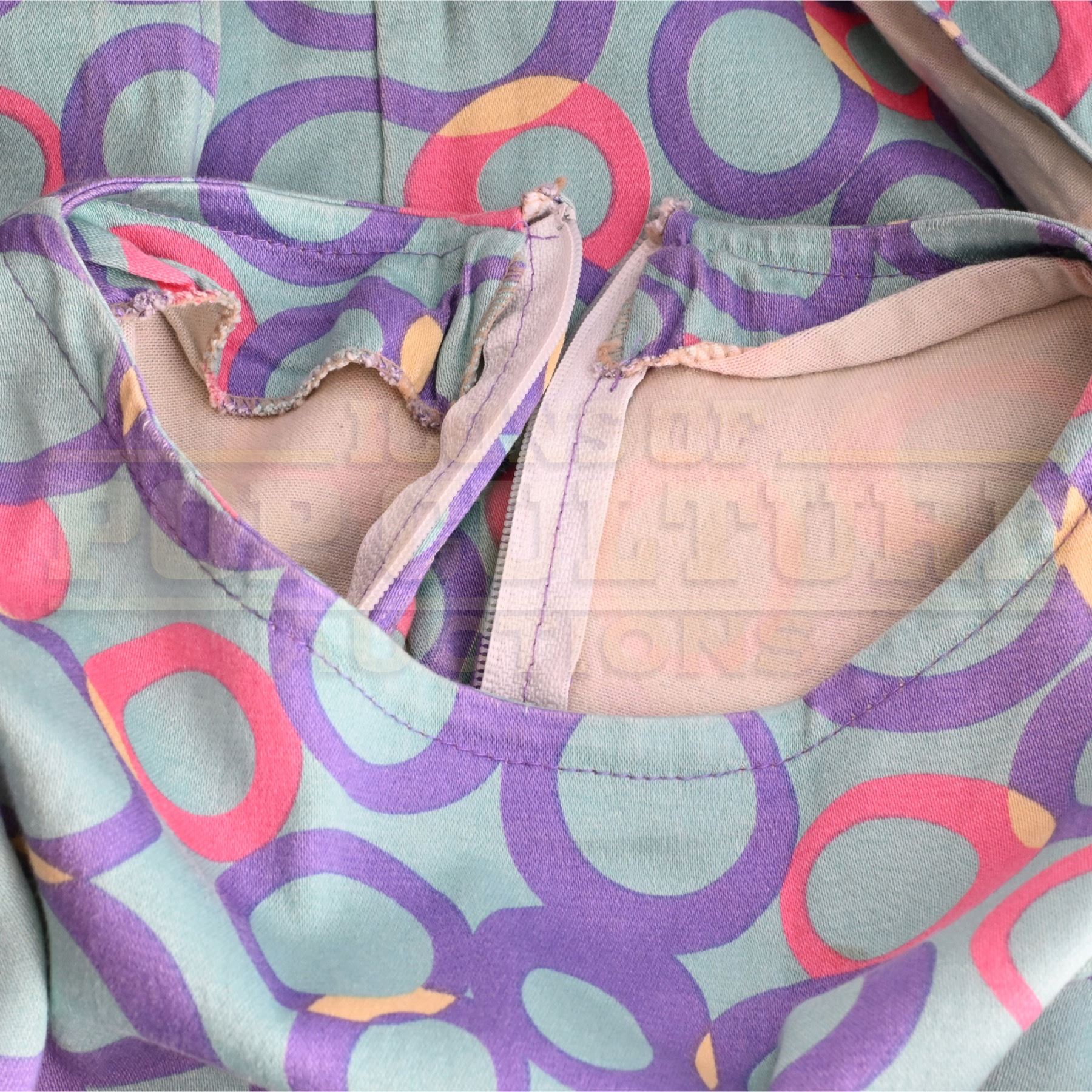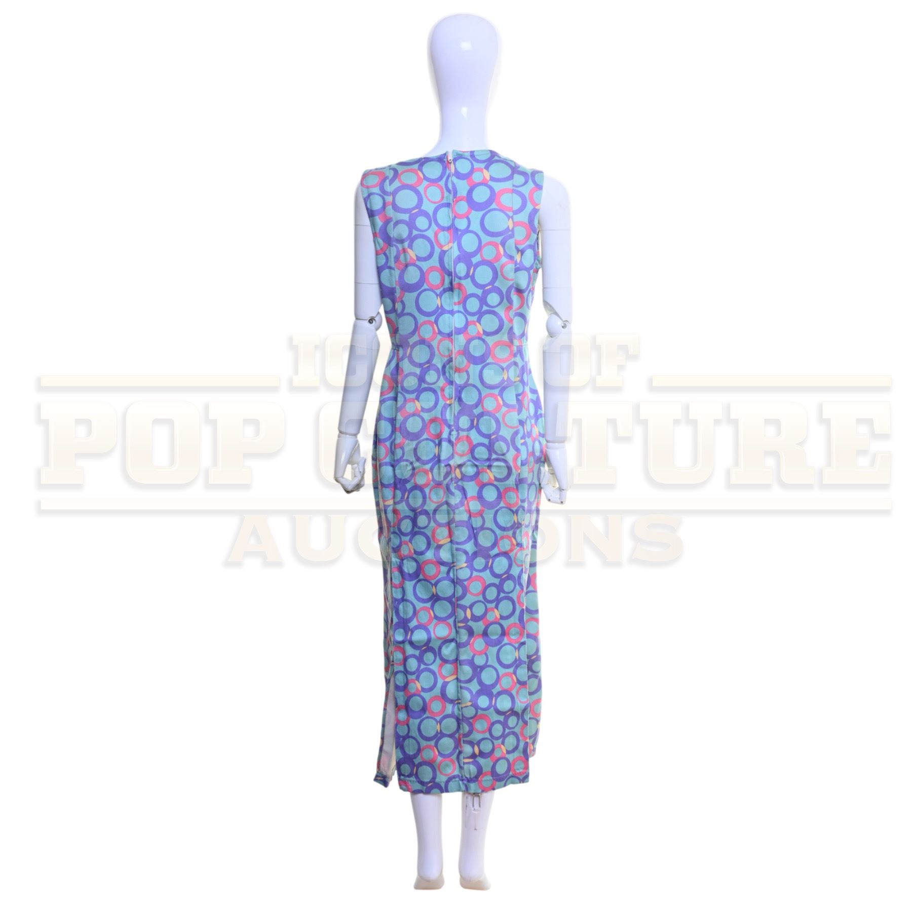This charming prototype dress captures the signature whimsy of Whoville through its bold circular pattern in shades of lavender, teal, magenta, and yellow, printed on lightweight fabric. The sleeveless, ankle-length design features a tailored waist, back zipper closure, and side slits for ease of movement, embodying the eccentric yet elegant aesthetic that became a hallmark of the Whoville wardrobe.