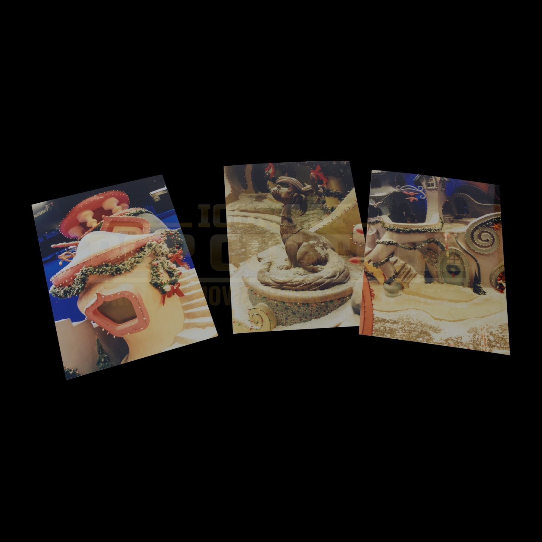 A rare set of three original printed 4” x 6” images of the Whoville town set, featuring Christmas décor and unique set detailing. The images were taken during the film’s production and are unpublished images, offering a rare look at the set design details.