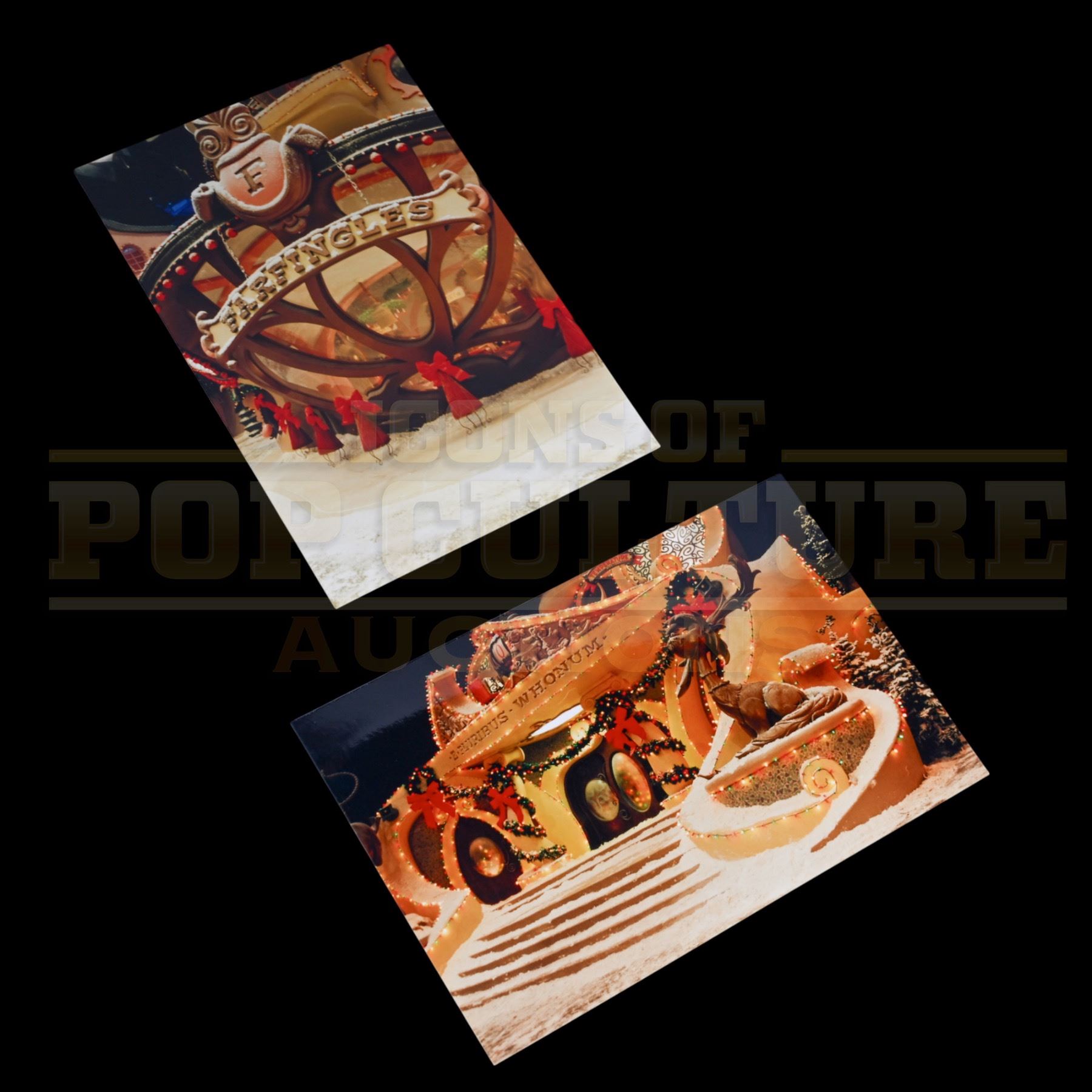 A rare set of two original printed 4” x 6” images of the Whoville town set, featuring City Hall and Farfingle’s Department Store. The images were taken during the film’s production and are unpublished images, offering a rare look at the set design details.