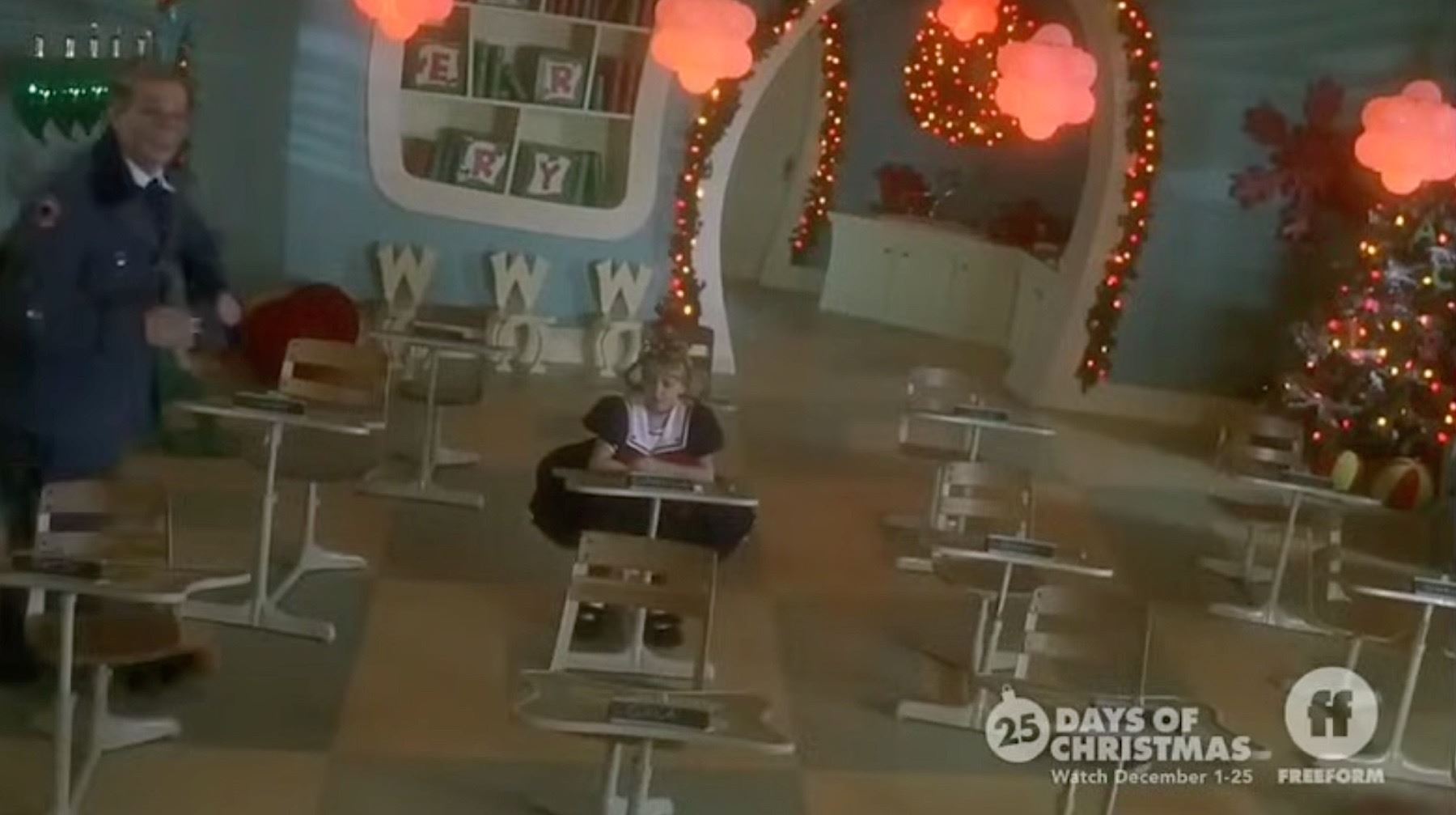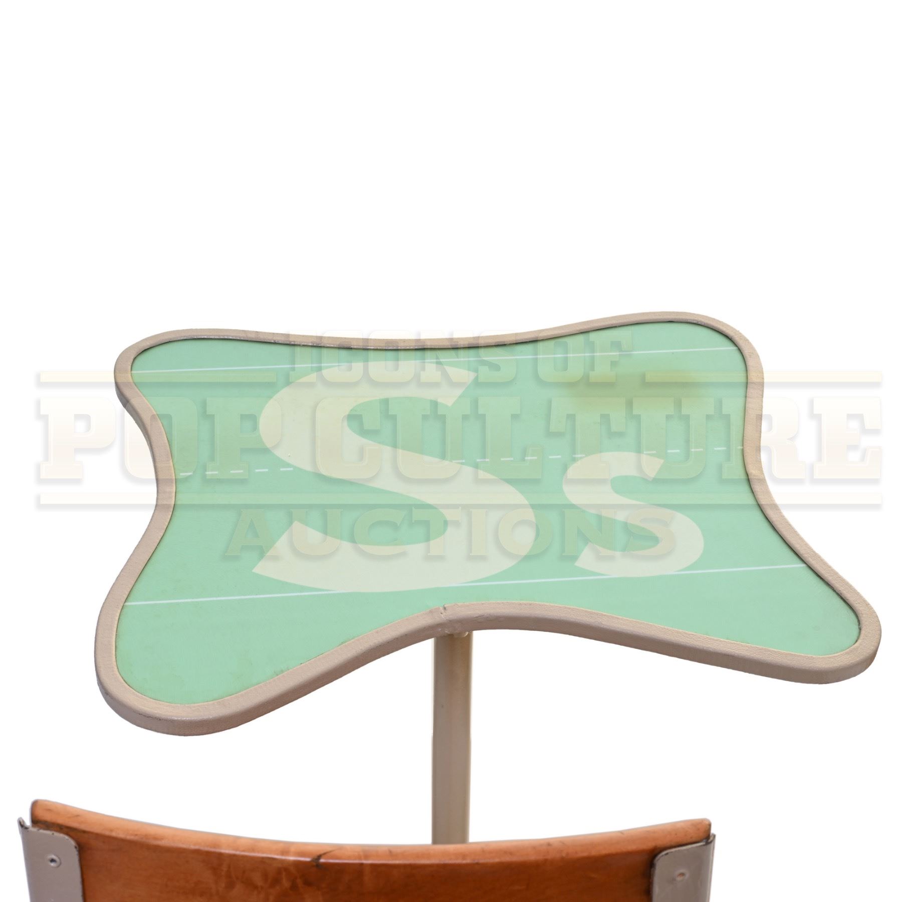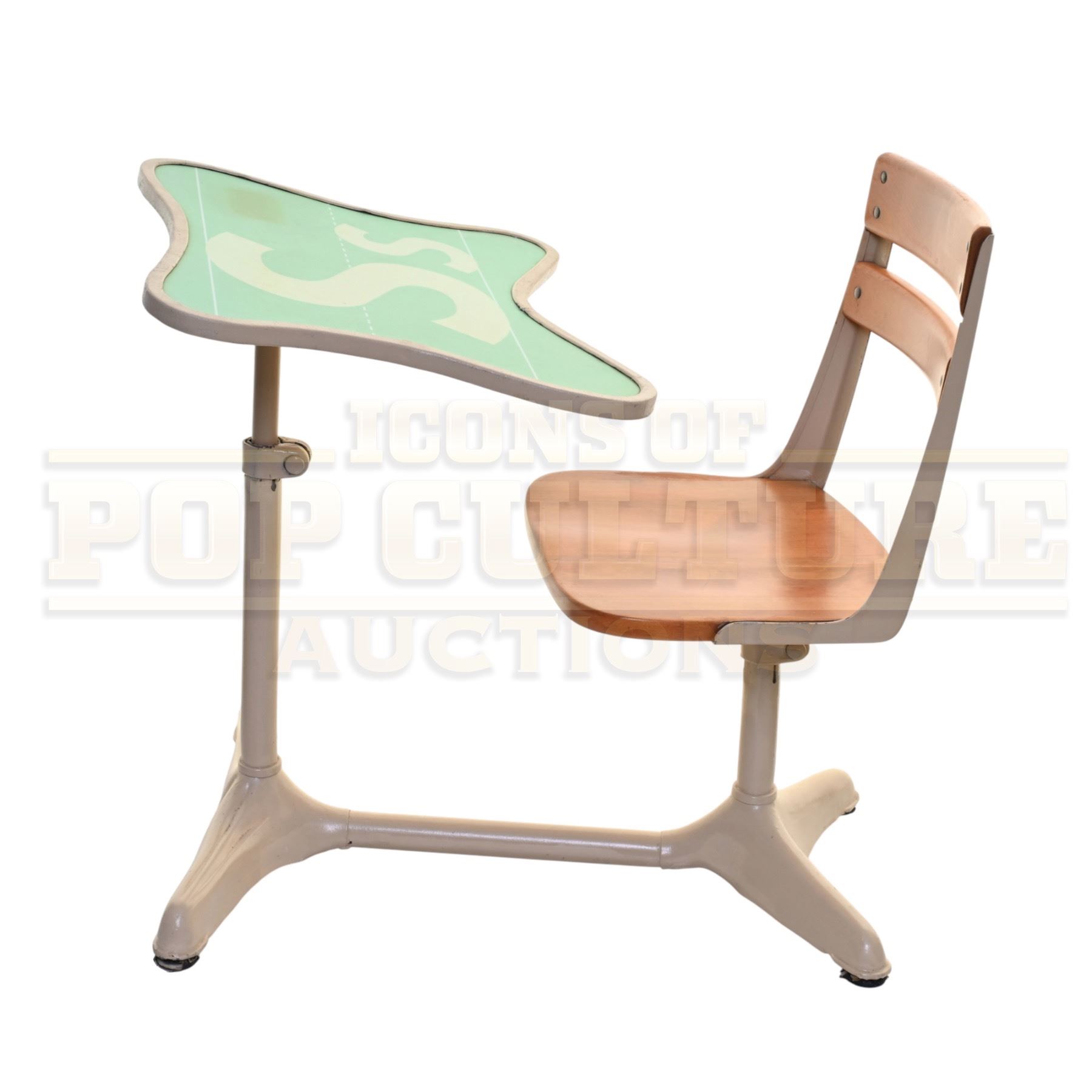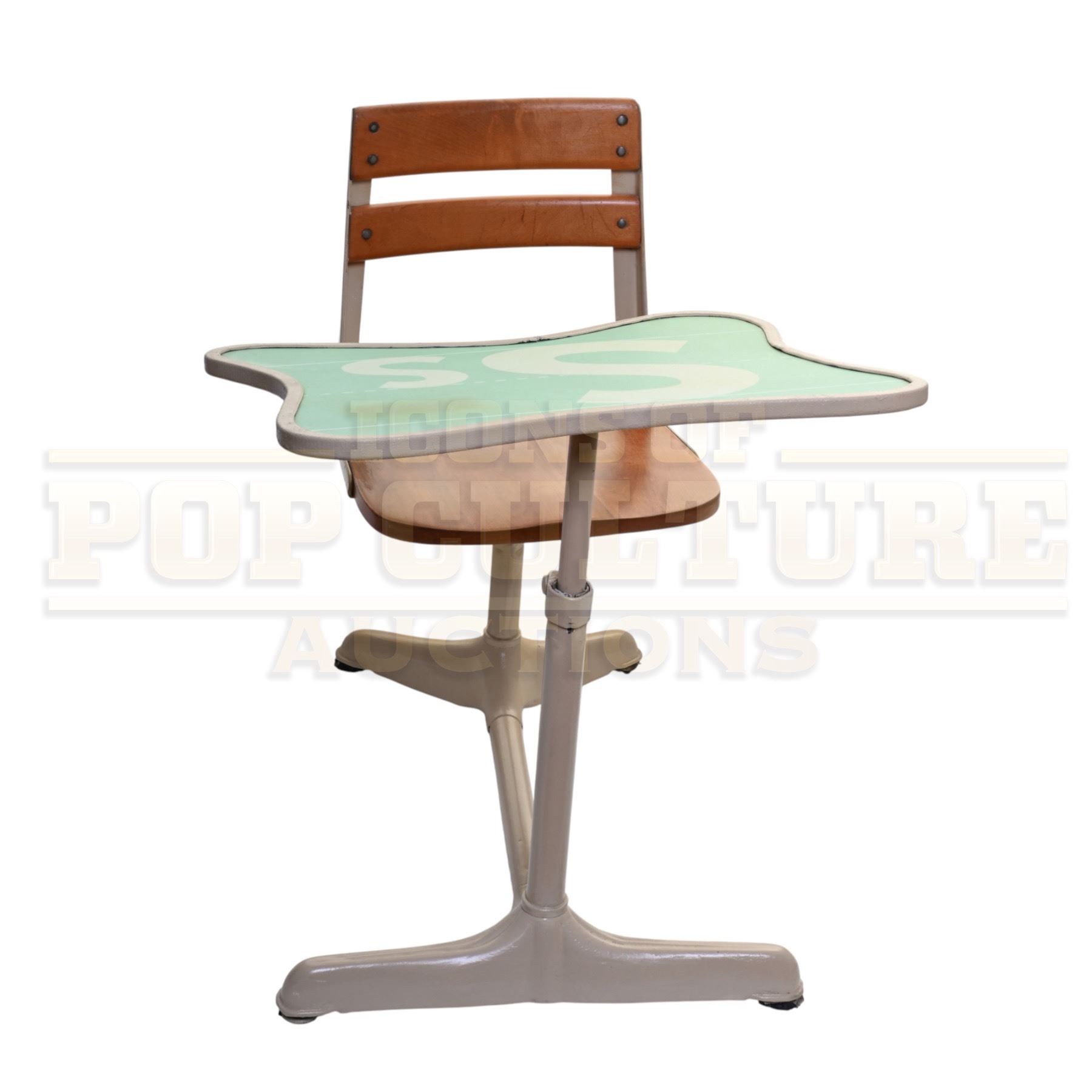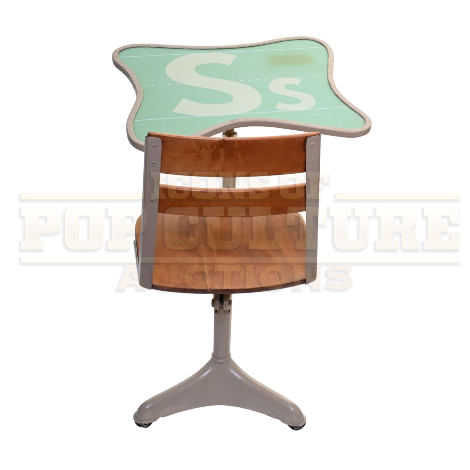 Measuring approximately 32" x 27" x 24", this desk began as a genuine vintage school desk and was artistically modified by the film’s production design team to fit the film’s distinctive Seussian aesthetic. The tabletop features a mint green laminate surface with whimsical curved edges and oversized printed letters “S s,” adding to the playful, cartoon-like style of Whoville. The wooden seat and backrest are supported by a sturdy cream-colored metal frame with tripod-style feet, completing the quirky, handcrafted look that made the film’s sets so memorable.