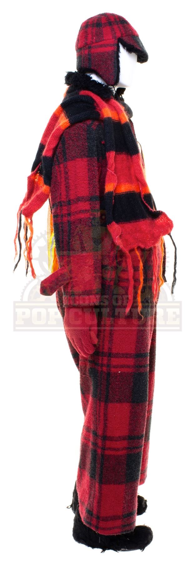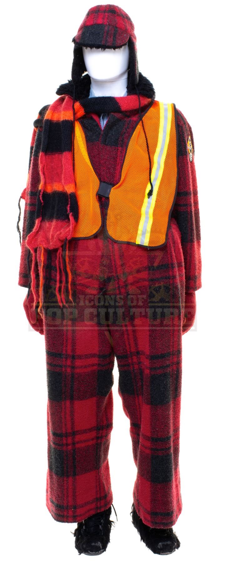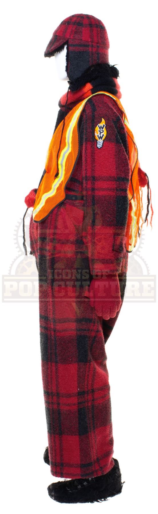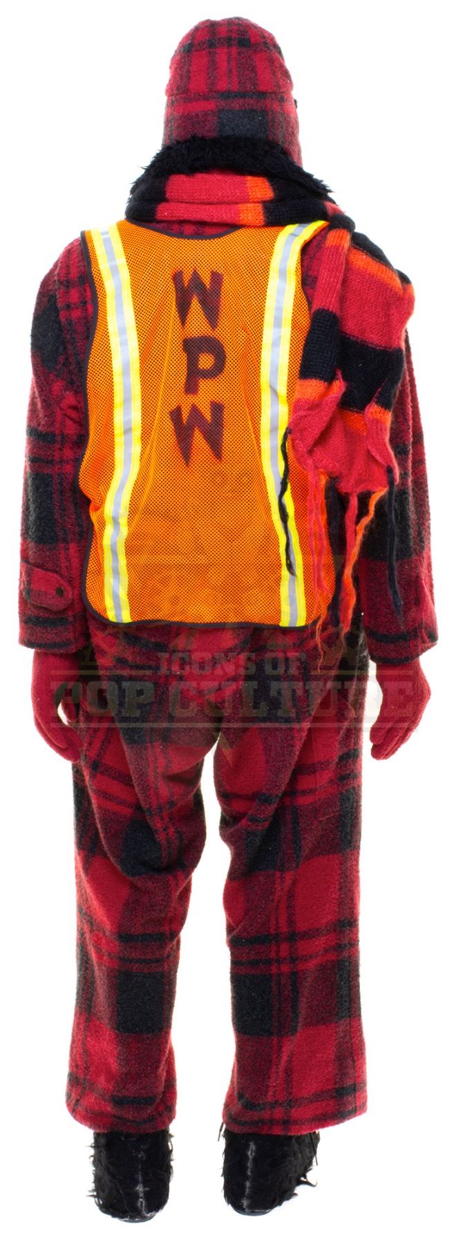 This costume was acquired by the production for use by Kevin Isola as the “Tree Trimmer”. The outfit consists of a vintage plaid jumpsuit with the original “Western Costume” tag still attached inside the collar, a sleeveless blue button front shirt with a cut in the back for use with a wire harness, a plaid hat, an orange and black knit scarf, a mesh safety vest that features “WPW” (Whoville Public Works) in black letters on the back, a pair of black fur covered shoes and a pair of gloves. The costume is seen early in the film as the large Whoville Christmas Tree is being decorated by the “Tree Trimmer” and placing the star atop the tree.