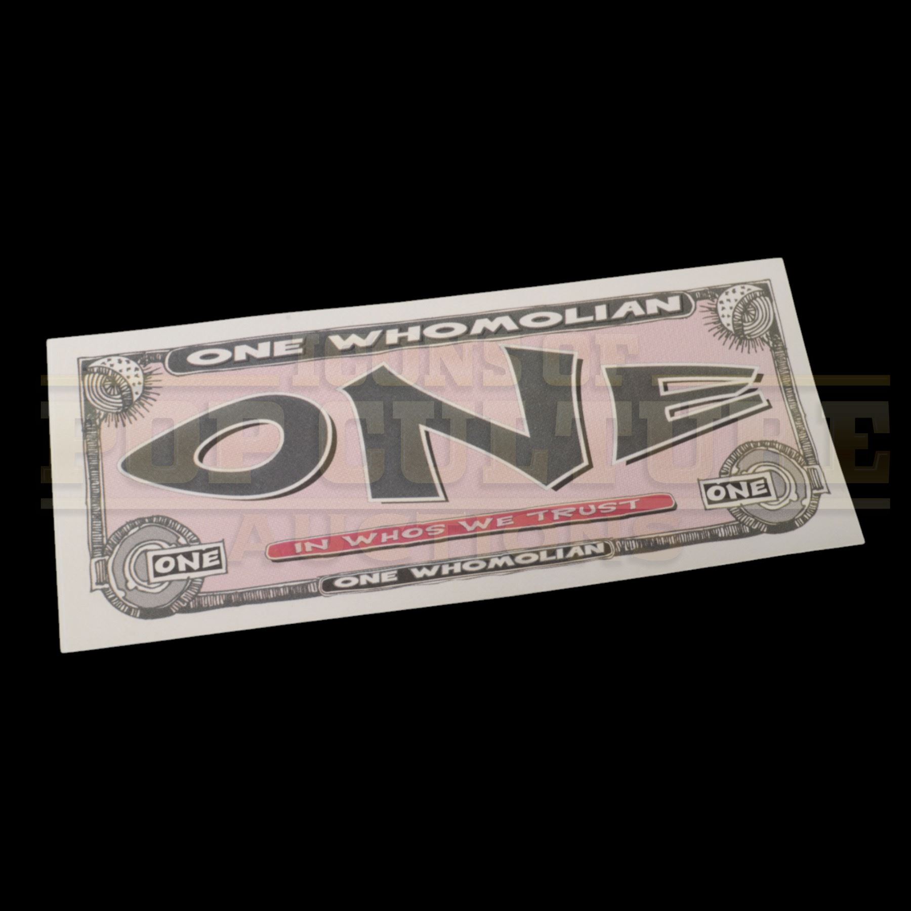 This First Edition "One Whomolian" Prop Bill is a rare and authentic production-made piece from How the Grinch Stole Christmas (2000). Measuring 6" x 2.5", this whimsical bill features the unmistakable Dr. Seuss-style graphics that bring the magical world of Whoville to life. Designed as legal tender exclusively for the Whos, it boasts vibrant colors, intricate details, and a playful design emblematic of Seussian charm.