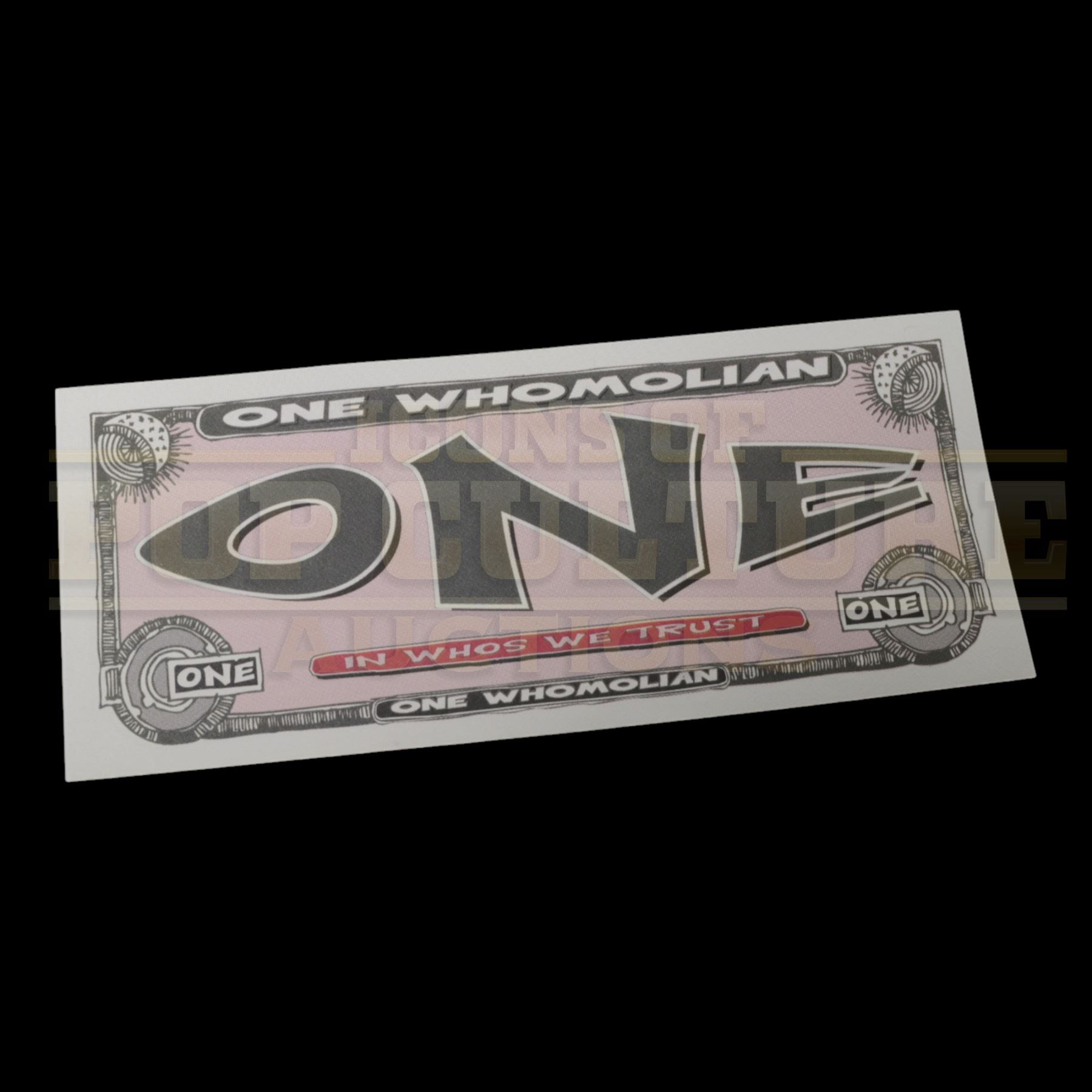 This First Edition "One Whomolian" Prop Bill is a rare and authentic production-made piece from How the Grinch Stole Christmas (2000). Measuring 6" x 2.5", this whimsical bill features the unmistakable Dr. Seuss-style graphics that bring the magical world of Whoville to life. Designed as legal tender exclusively for the Whos, it boasts vibrant colors, intricate details, and a playful design emblematic of Seussian charm.