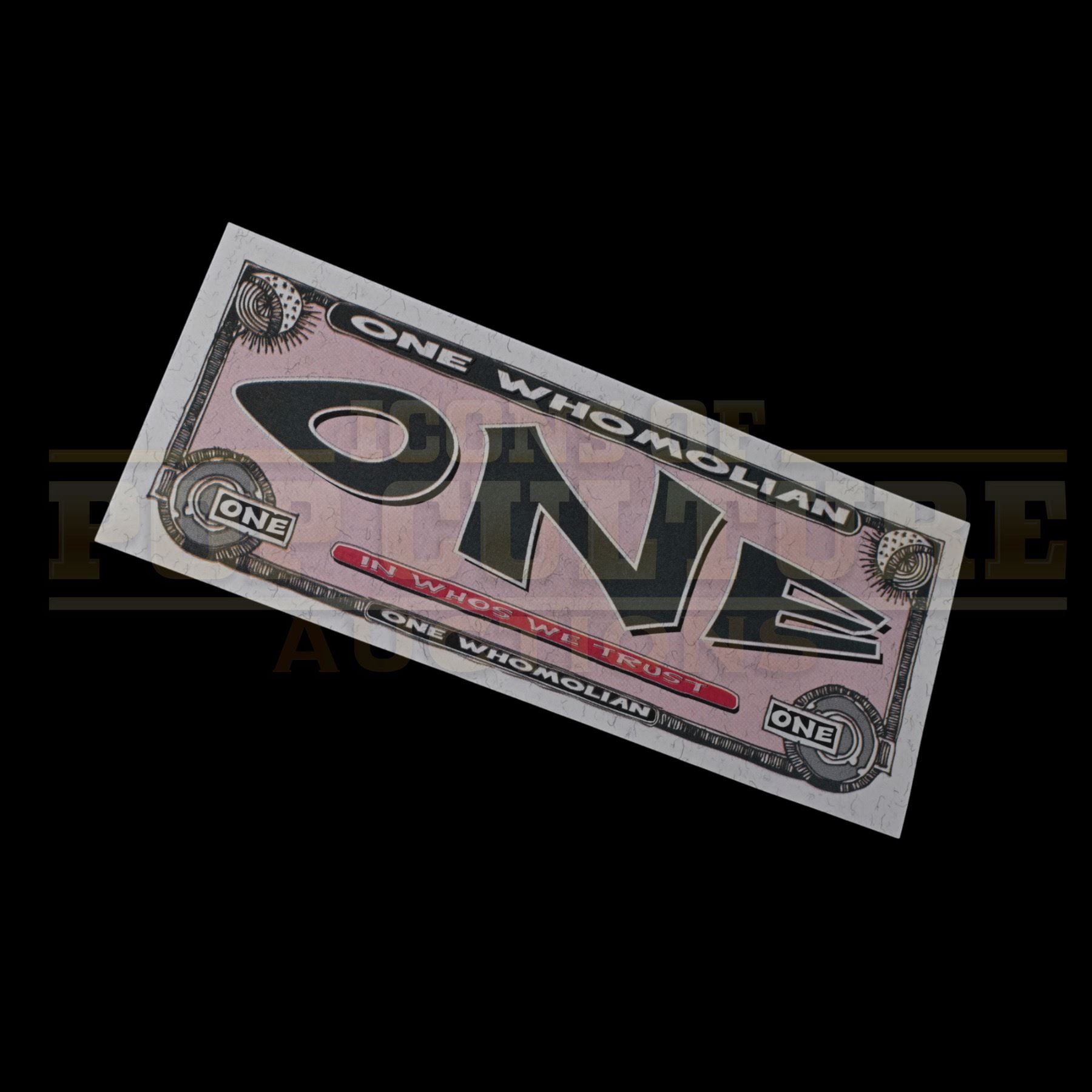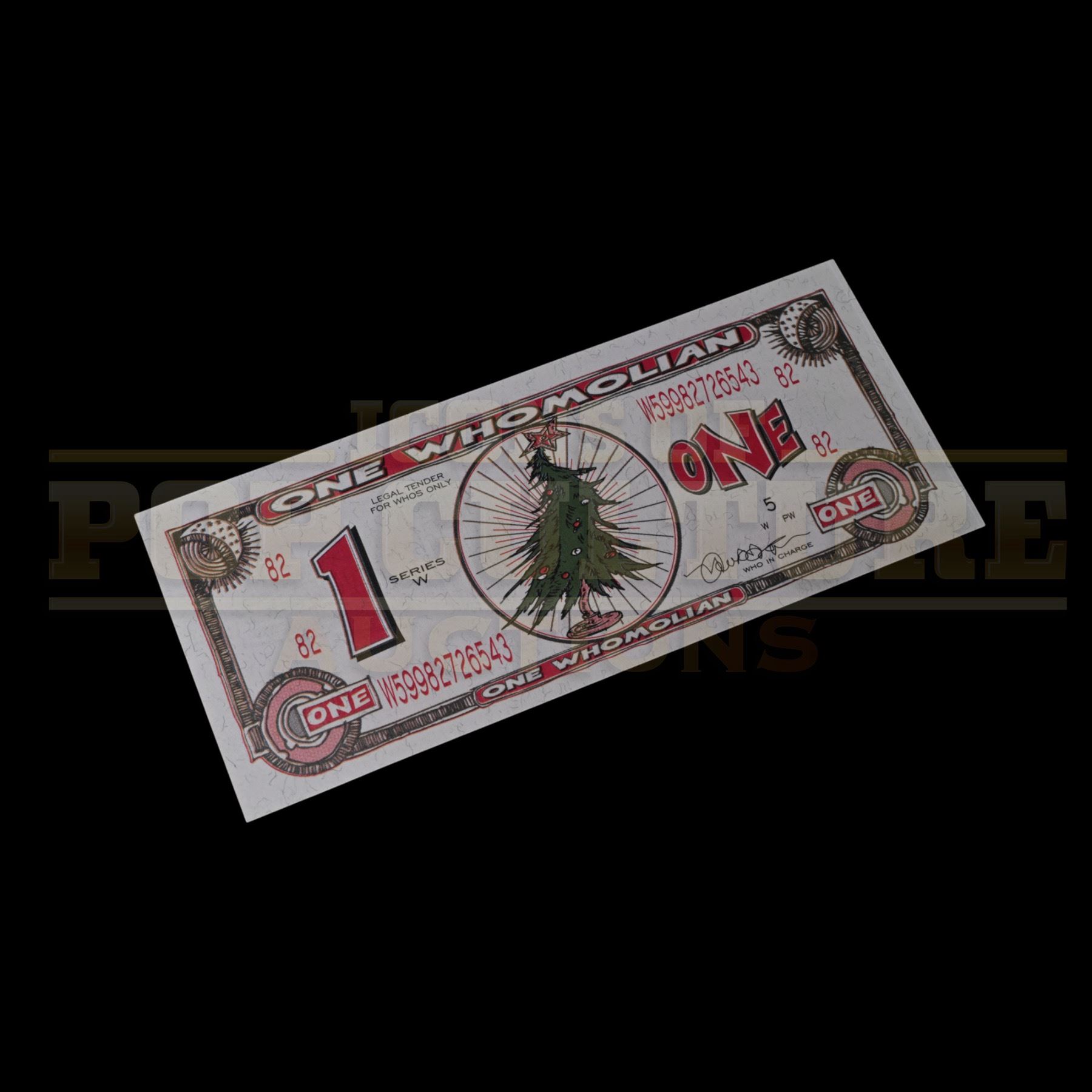 Expertly designed to capture the quirky charm of Dr. Seuss’s Whoville, this double-sided prop measures approximately 6" x 2.5" and features intricate, custom-printed details. One side displays the denomination “ONE WHOMOLIAN” along with a festive Christmas tree illustration at the center, while the reverse proudly reads “IN WHOS WE TRUST” in bold red lettering, a playful Seussian twist on traditional currency design.