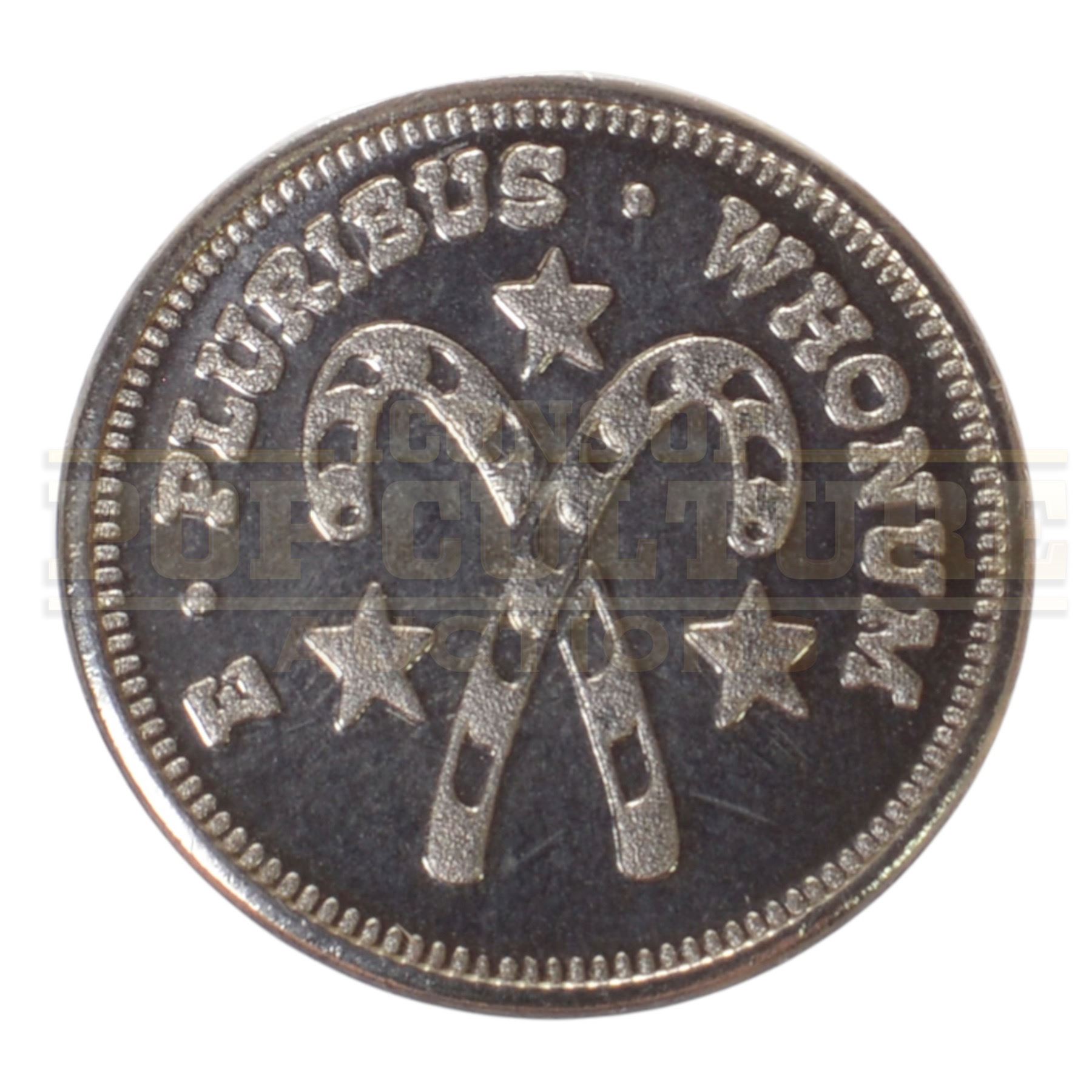 This whimsical 1-cent coin was custom-made for use during the production of Ron Howard’s How the Grinch Stole Christmas (2000). Cast in metal and measuring approximately 0.75" in diameter, the coin features a playful design of crossed candy canes flanked by stars and the phrase “E Pluribus Whonum” — a clever Seussian twist on the traditional motto. The reverse displays an ornate number “1” encircled by decorative scrollwork, reinforcing its role as a unique Whoville denomination.