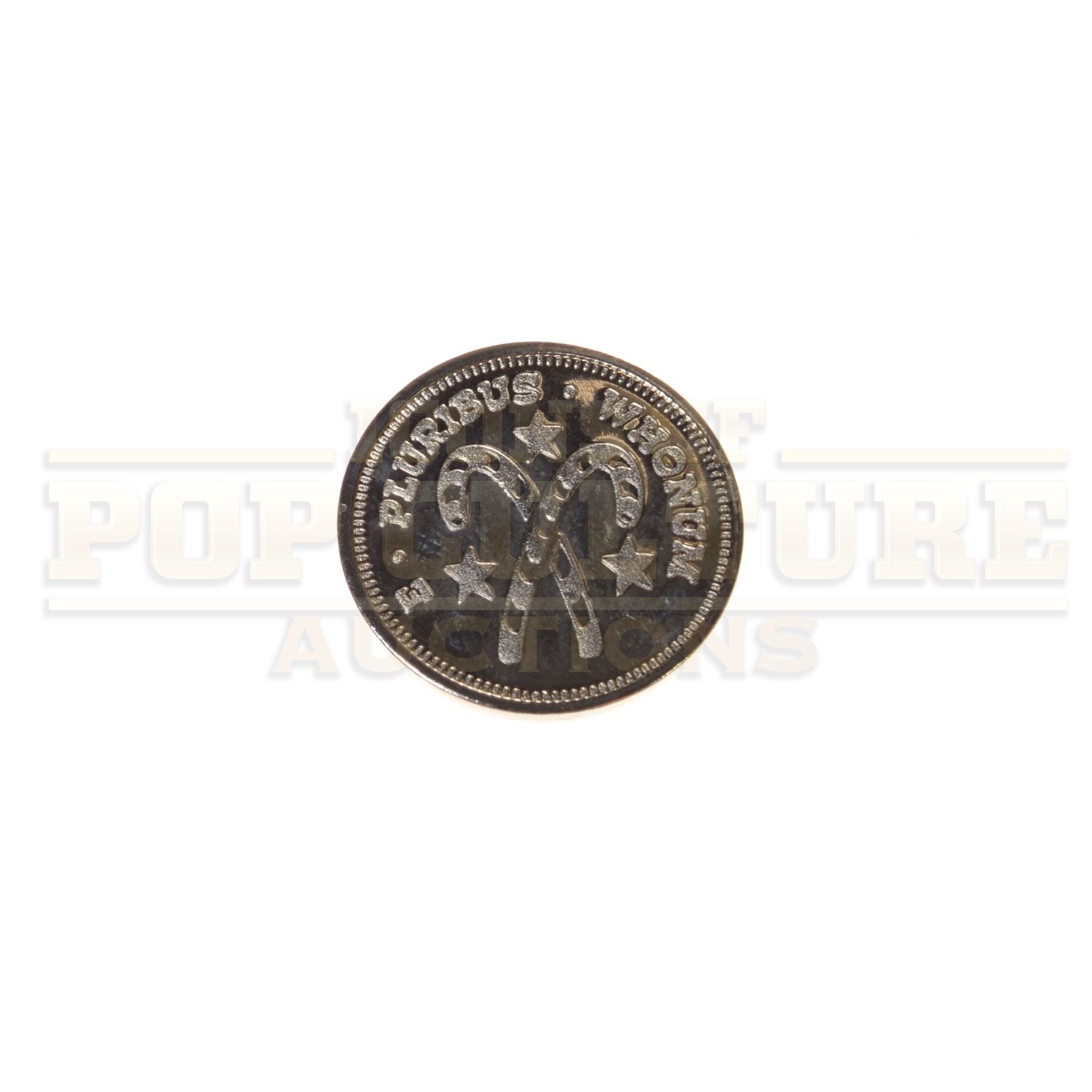 This whimsical 1-cent coin was custom-made for use during the production of Ron Howard’s How the Grinch Stole Christmas (2000). Cast in metal and measuring approximately 0.75" in diameter, the coin features a playful design of crossed candy canes flanked by stars and the phrase “E Pluribus Whonum” — a clever Seussian twist on the traditional motto. The reverse displays an ornate number “1” encircled by decorative scrollwork, reinforcing its role as a unique Whoville denomination.