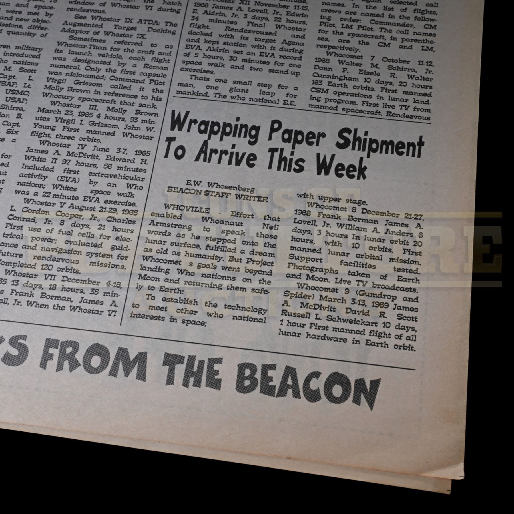 This prop newspaper was custom printed by the production for use by various actors and as set dressing in Whoville. The newspaper features the main headline “Christmas Spirit In Good Supply” with the image of a downtown Whoville toy store. Other various headlines include “Whobilation Plans Are Finally In Place”, “Holiday Home Lighting Contest To Be Judged” and “City Council Ok’s More Christmas Decorations”. Also, if you look closely many of the articles feature various space exploration missions, including the “Whoanaut” Neil Armstrong stepping onto the lunar surface. A very cool prop, with interesting attention to detail.