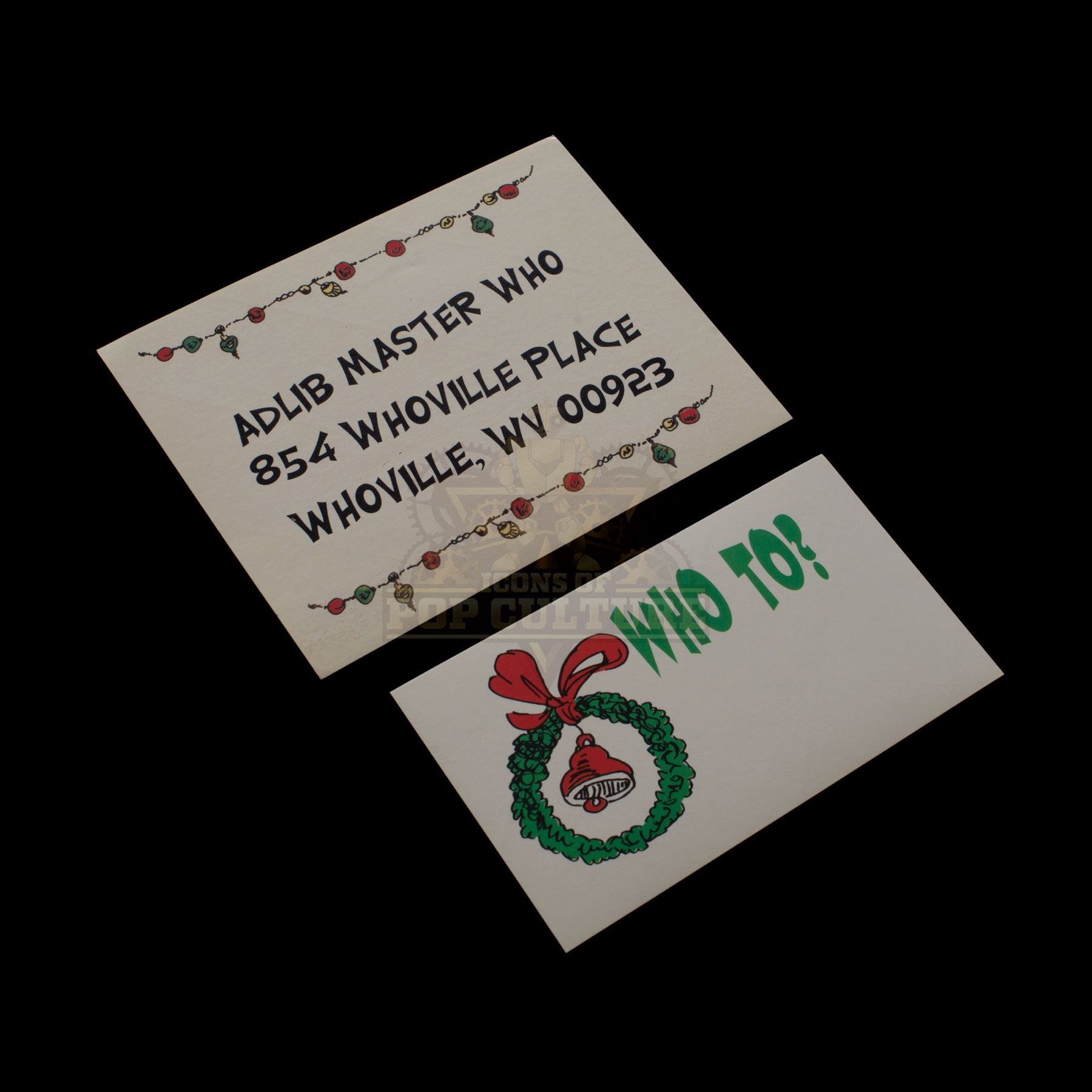 This set of “Whoville” props were custom printed by the production for use by various actors and as set dressing during filming. The set consists of a gift tag sticker and an address label sticker, both featuring Christmas graphics and remain in good, unused condition. Measuring 5” x 2.75” and 5.5” x 4.25”.
