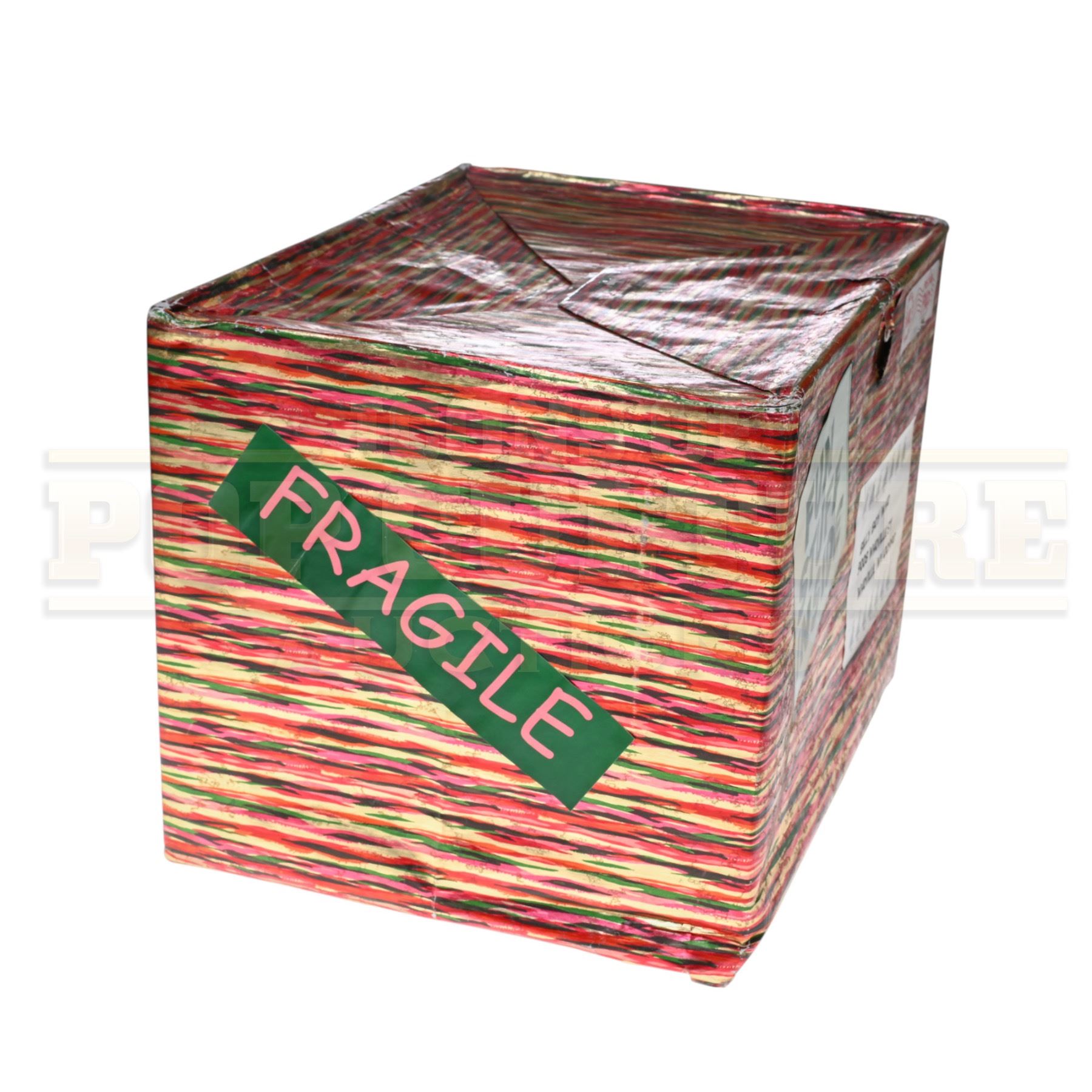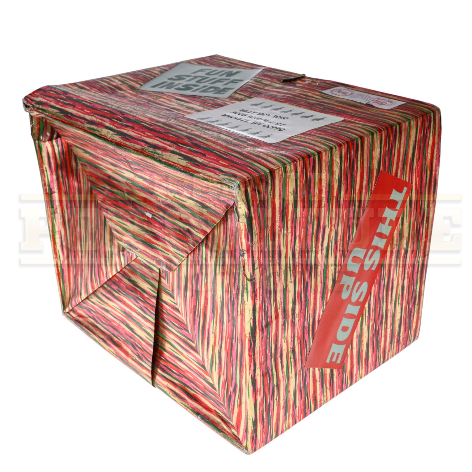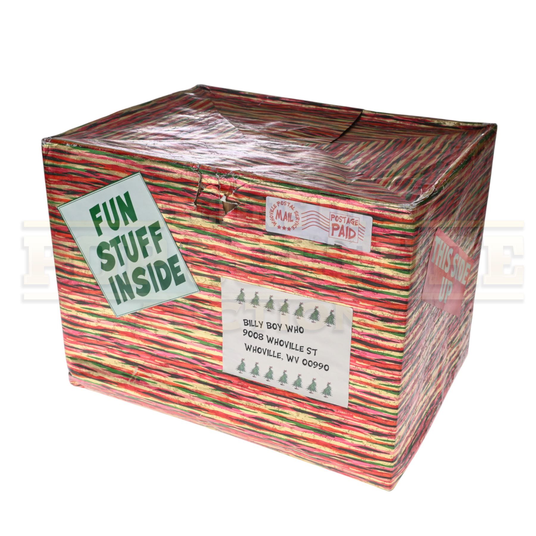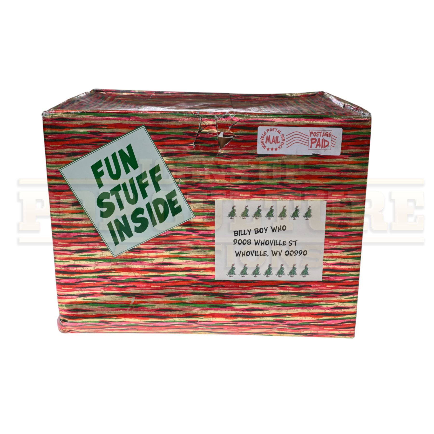 Expertly designed in the colorful, exaggerated Seussian style of the film, the large box measures 15.5" x 12" x 12" and is wrapped in vibrant red, green, and yellow striped paper with a glossy finish. Several custom-made production stickers are applied to the surface, including playful Whoville-style shipping labels such as “FUN STUFF INSIDE,” “FRAGILE,” and “TAKEYURTIME,” along with an address label to Billy Boy Who, 9008 Whoville St, Whoville, WV 00990.