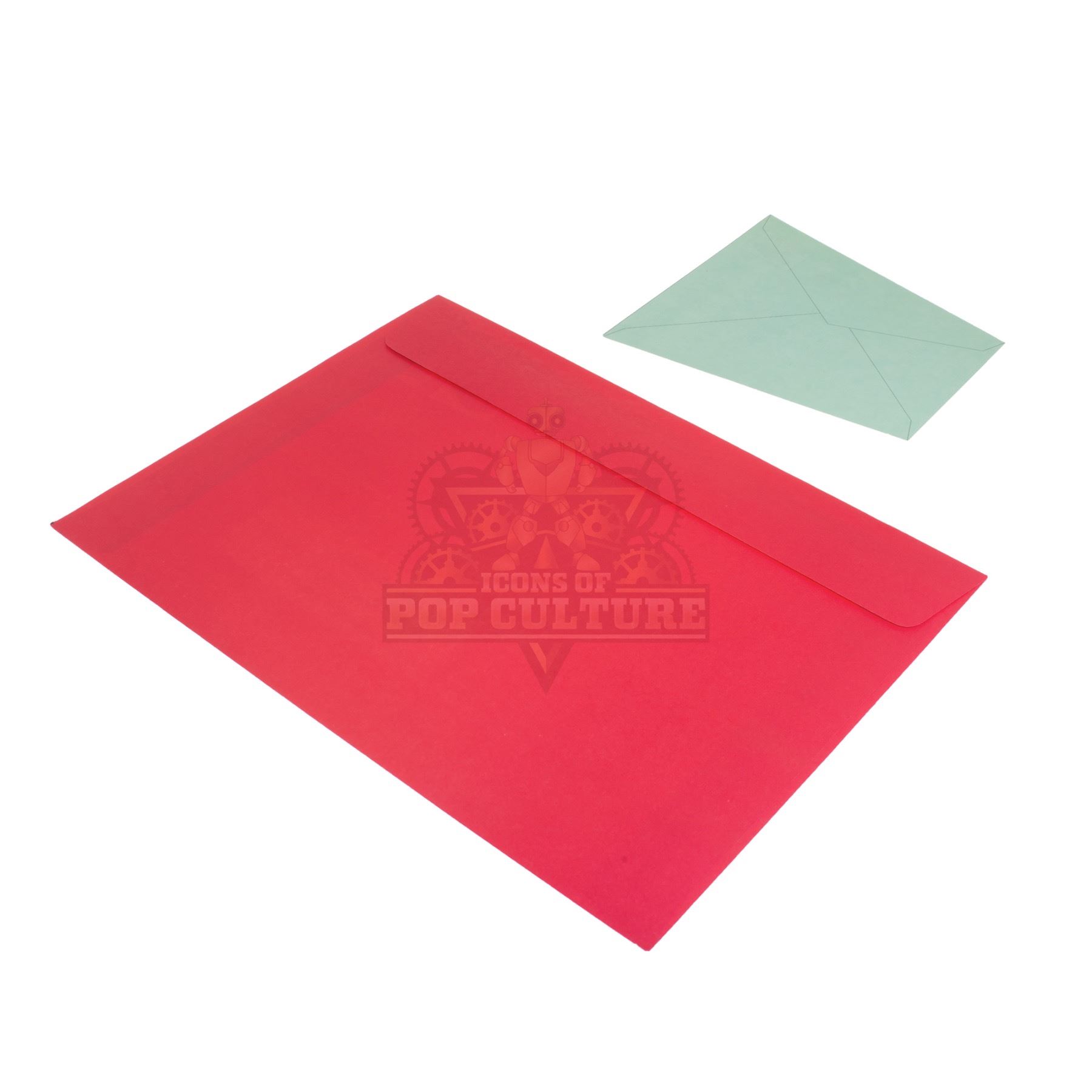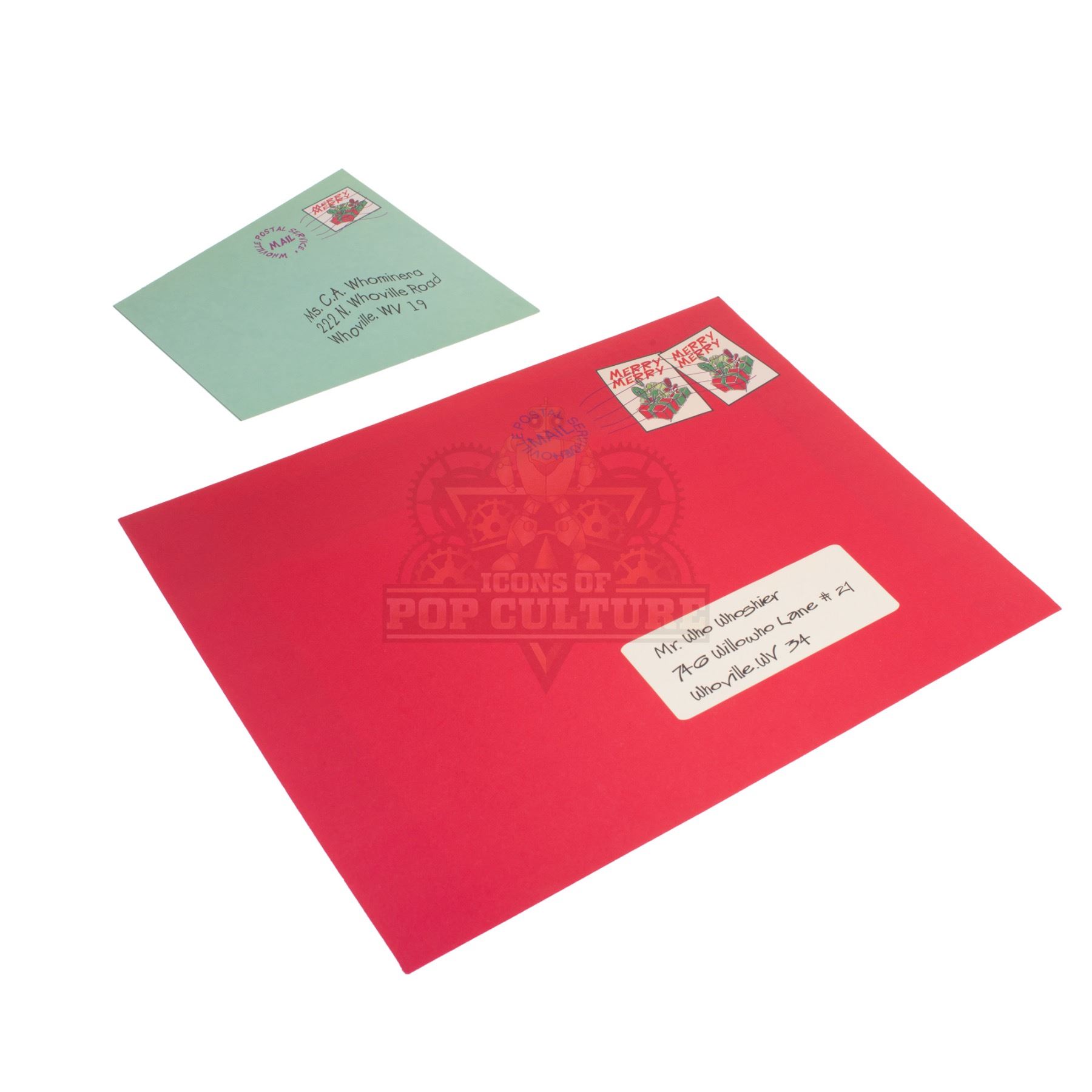 This prop “Whoville” mail was custom printed by the production for use by various actors and as set dressing during filming. The large piece of mail features a “Whoville” resident address and stamps printed on one side. The large envelope measures 12" x 9". The small piece of mail is made of a sheet of card stock paper with “Whoville” resident address and stamp printed on one side and measures 6” x 6”.