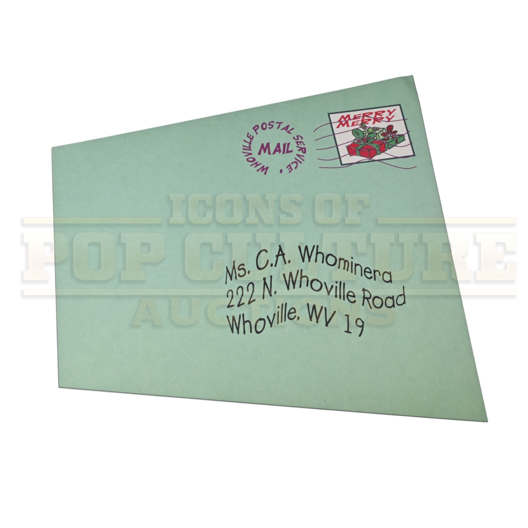 This whimsical prop represents the quirky design aesthetic that brought the world of Dr. Seuss to life on screen. Measuring approximately 6" x 6", the mint-green envelope features printed details including the recipient’s name, “Ms. C.A. Whominera”, and a fanciful address on N. Whoville Road. It’s adorned with a custom “Whoville Postal Service” postmark and a colorful “Merry Merry” Christmas stamp, designed in the Seussian spirit of curved lines and exaggerated forms that defined the film’s art direction.