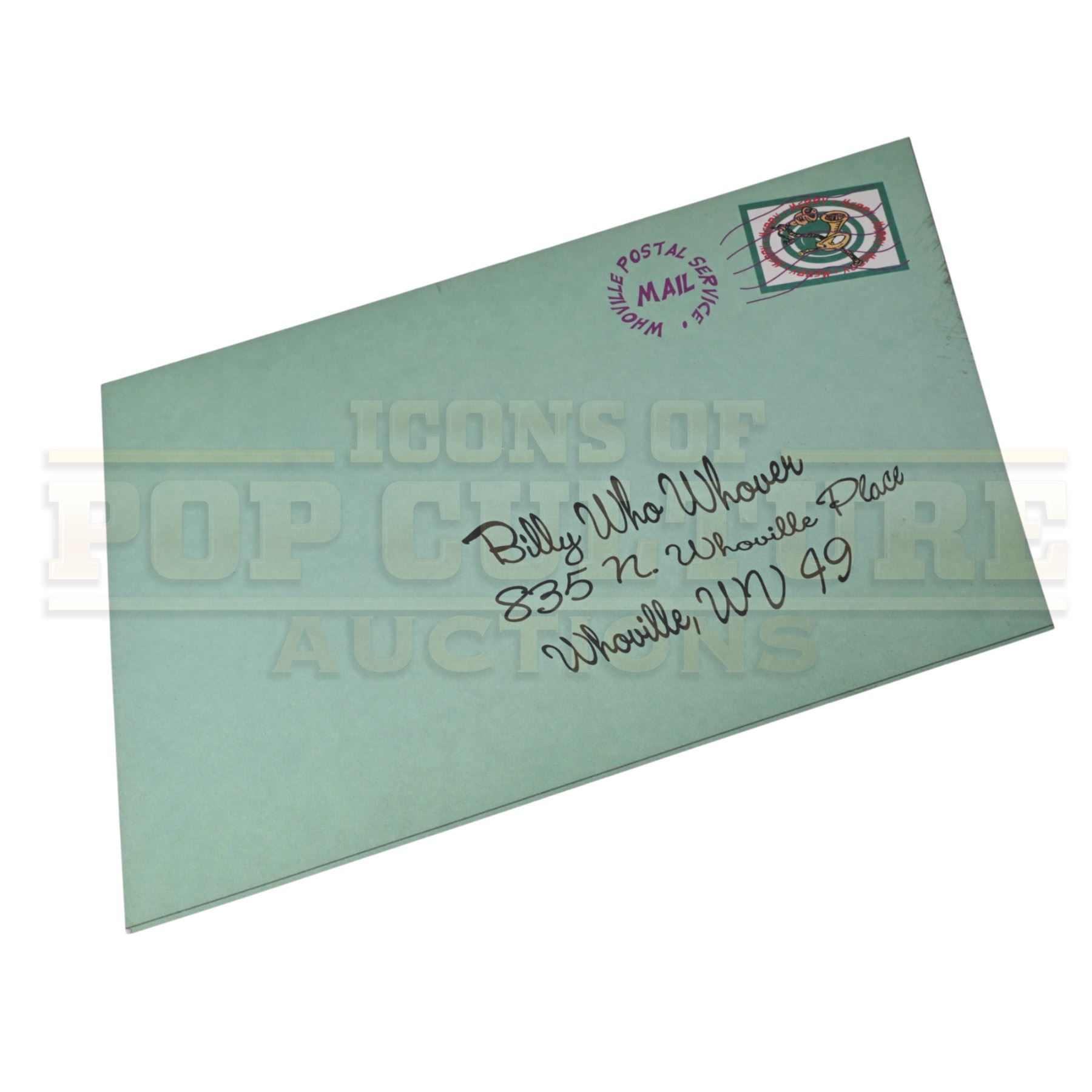 A whimsical “Whoville Postal Service” prop envelope created for use in Ron Howard’s 2000 holiday classic How the Grinch Stole Christmas, starring Jim Carrey.