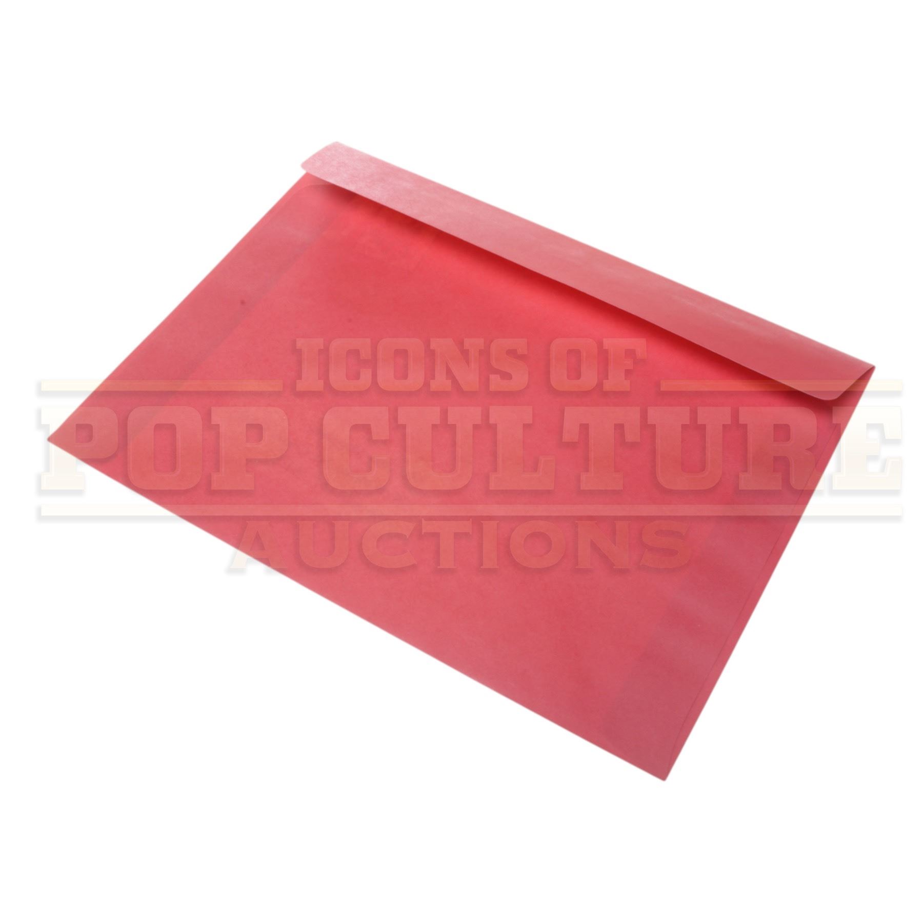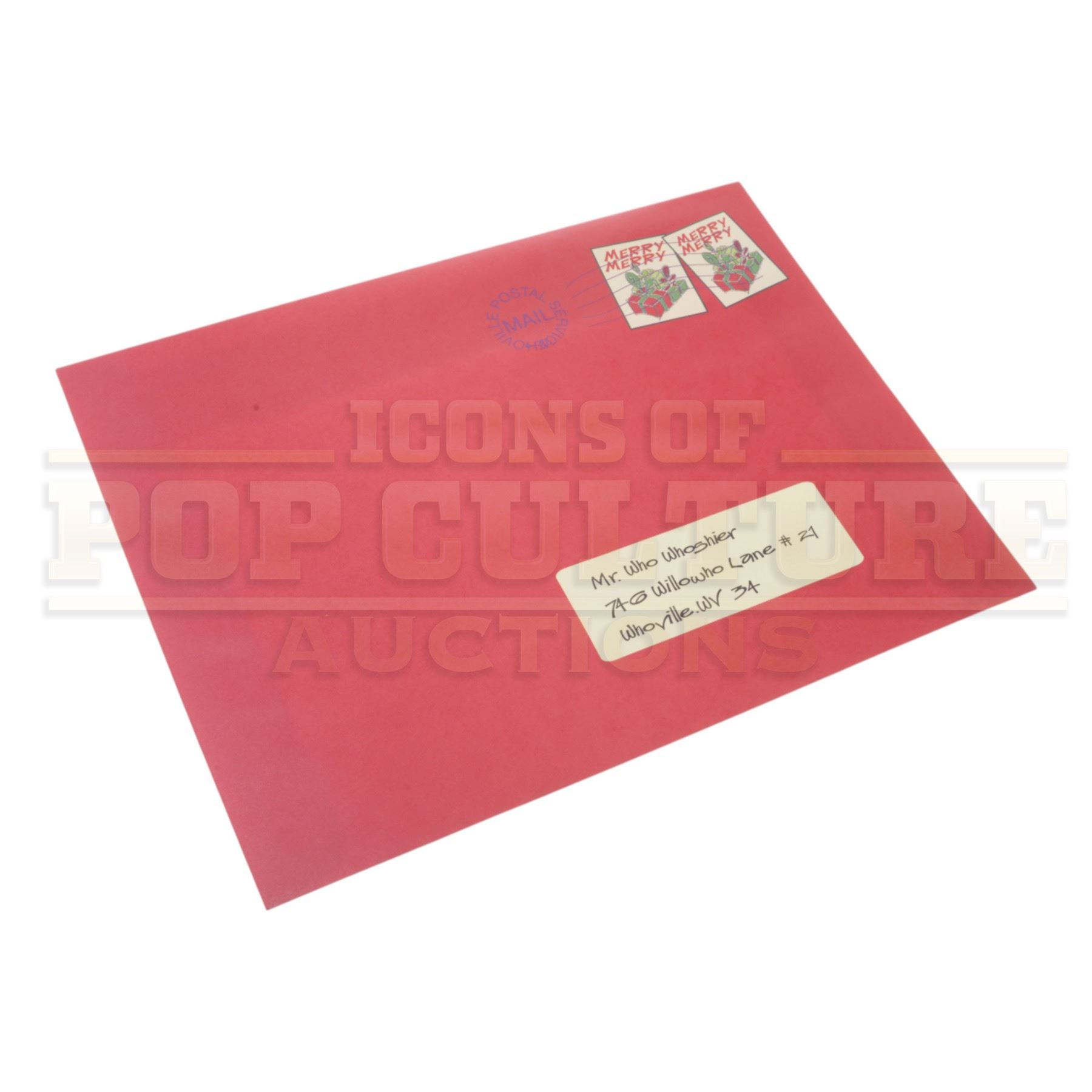 Straight from the whimsical world of Whoville comes this custom-made envelope used on screen in "How the Grinch Stole Christmas" (2000), directed by Ron Howard. Measuring a festive 12" x 9", the bold red envelope features two custom "Merry Merry" Whoville stamps, a “Whoville Postal Service” mark, and is addressed to the delightfully named Mr. Who Whoshier at 74-G WillowWho Lane #21.