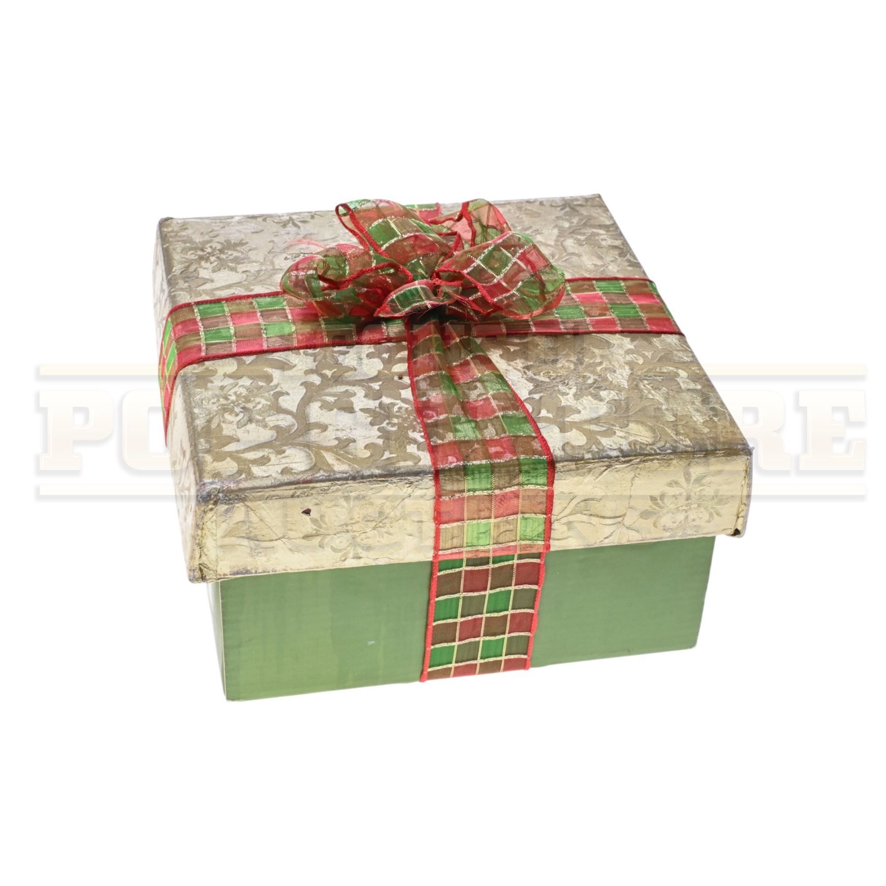 The box is constructed from sturdy cardboard and wrapped in elegant embossed gold paper on the lid with a soft green base, complete with a red and green plaid ribbon and matching decorative bow on top. Measuring 7” x 7” x 3.75”, it perfectly embodies the rich, handcrafted style of Whoville’s set design, both whimsical and sophisticated.