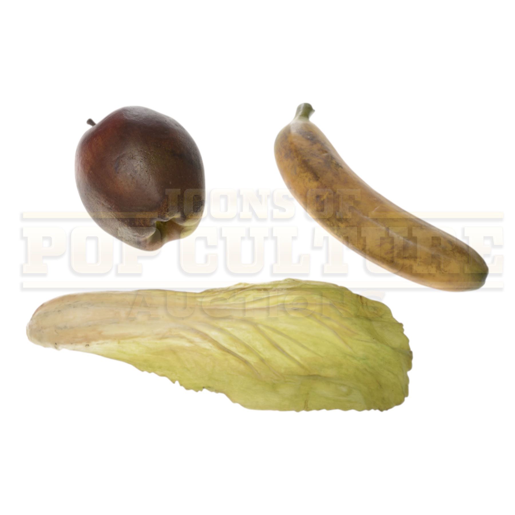 This collection includes a fake head of lettuce, a faux apple, and a banana, each hand-painted for a realistic yet exaggerated look befitting Dr. Seuss’s topsy-turvy world. These items were part of the detailed set dressing that transformed the Grinch’s lair into a mountain of festive chaos and forgotten Whoville castoffs.