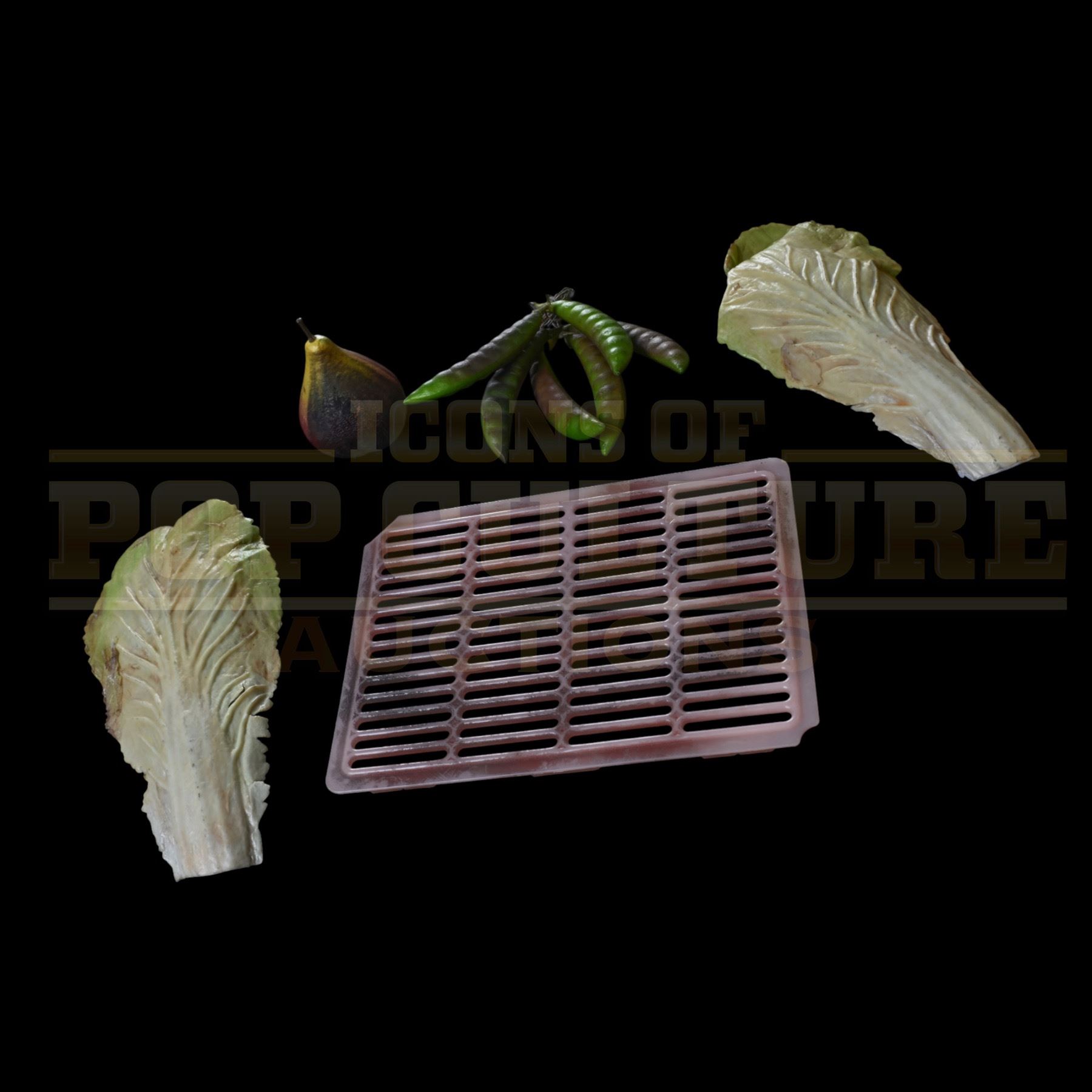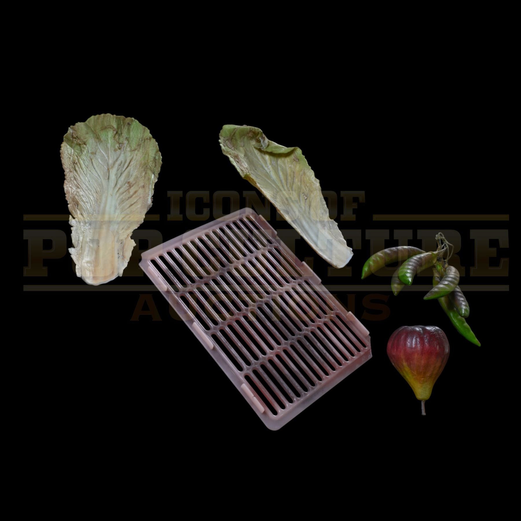 This fun production-made set includes a plastic vent cover (measuring approximately 7.75" x 5.5") and a selection of Whoville refuse, such as fabricated faux vegetables and fruit, each carefully designed to fit the exaggerated, whimsical aesthetic of Whoville. These distinctive pieces were used to dress the landfill and the Grinch’s cluttered lair, helping bring to life the film’s imaginative world where even garbage had a Seussian flair.