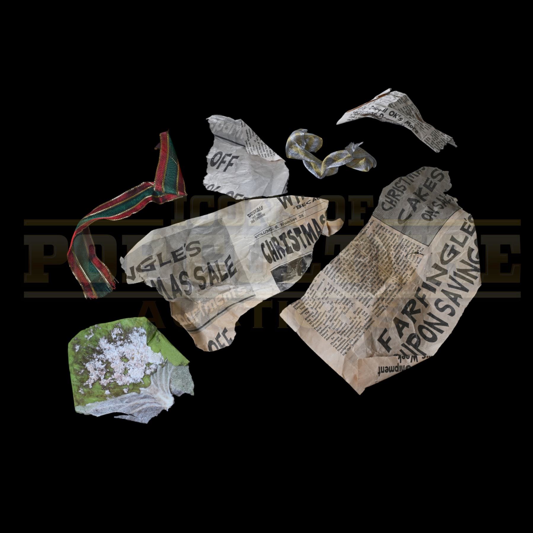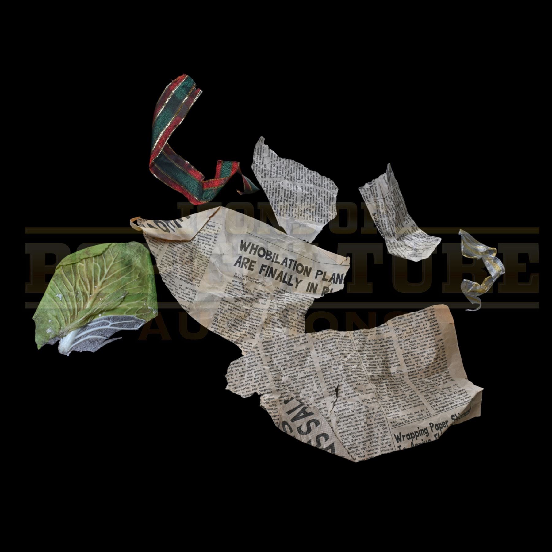 This whimsical set includes custom-printed “Whoville Gazette” newspaper fragments, a strip of festive red-and-green ribbon, a gold metallic ribbon, and a particularly memorable touch, a piece of “snow-covered lettuce” crafted for the film’s intricately detailed garbage heaps. The newspaper headlines feature humorous Seussian flair, including “Whobilation Plans Are Finally in Place” and “Farfingle’s Coupon Savings Sale,” capturing the consumer-driven chaos of Whoville life that so perfectly fueled the Grinch’s disdain for the season.