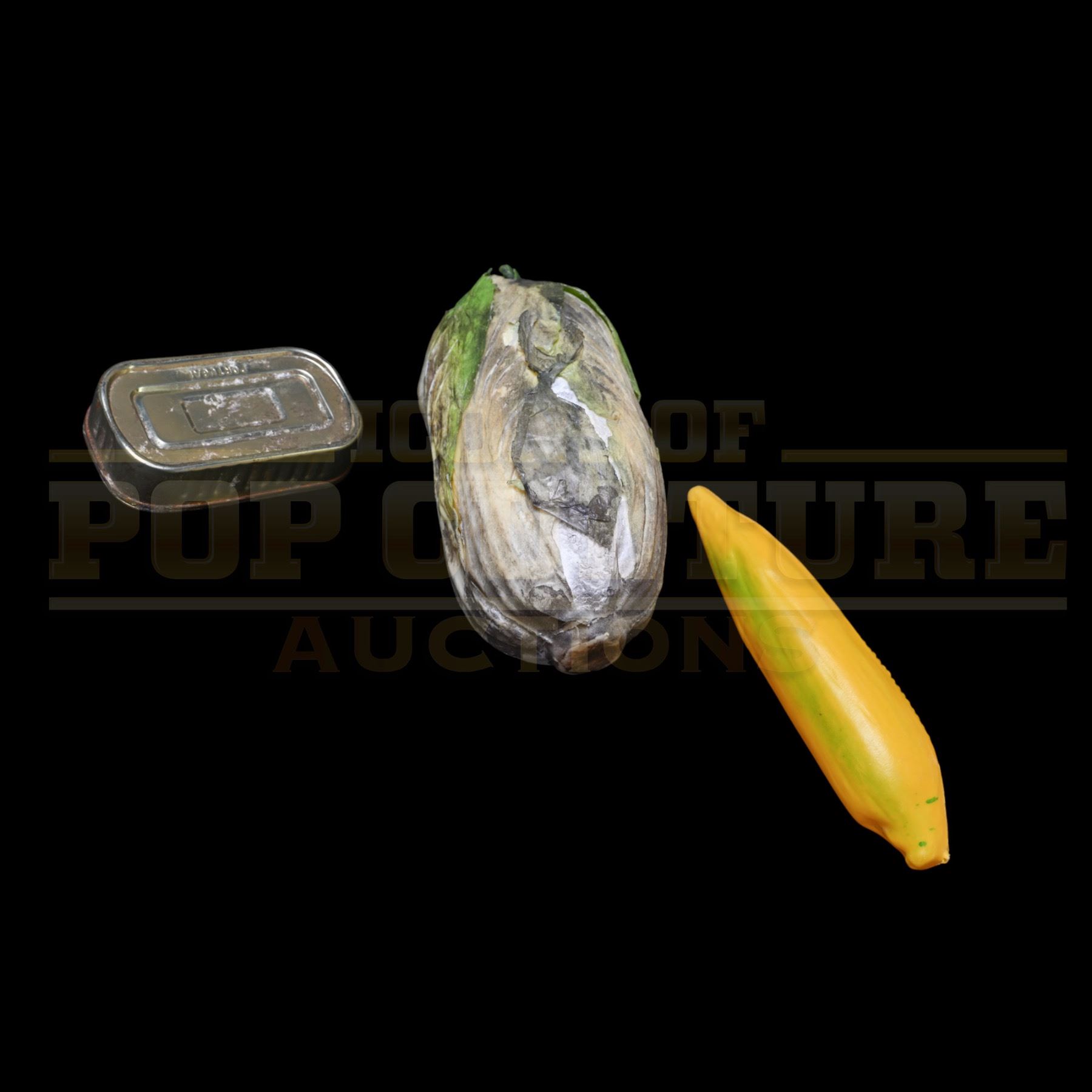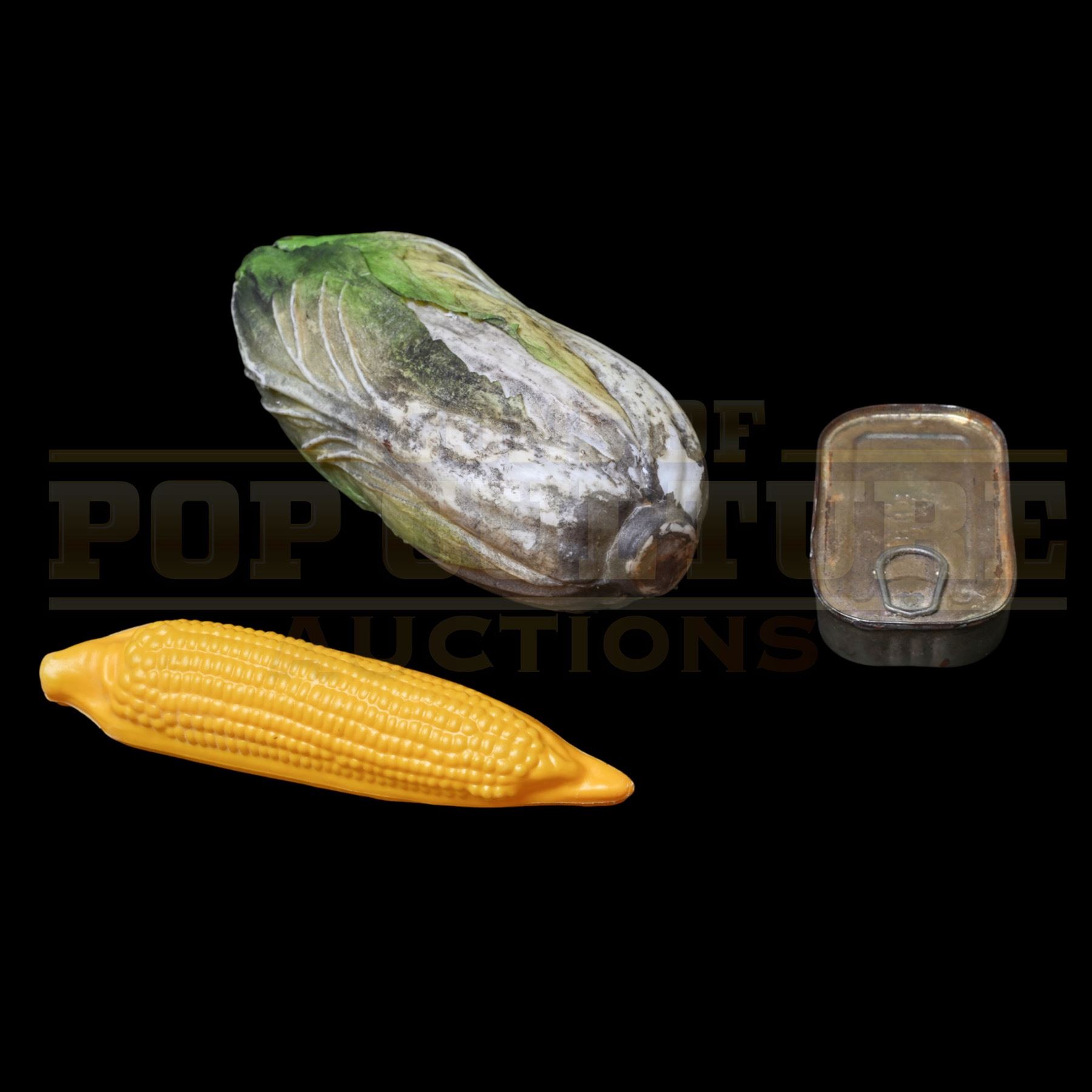 This production-made set includes a plastic ear of corn, a metal tin can, and a faux cabbage constructed from plastic over styrofoam, all custom-weathered by the film’s prop department to achieve the worn, lived-in aesthetic seen on screen. Each item reflects the playful, Seussian design language of the film’s art direction, blending realism with exaggerated whimsy.