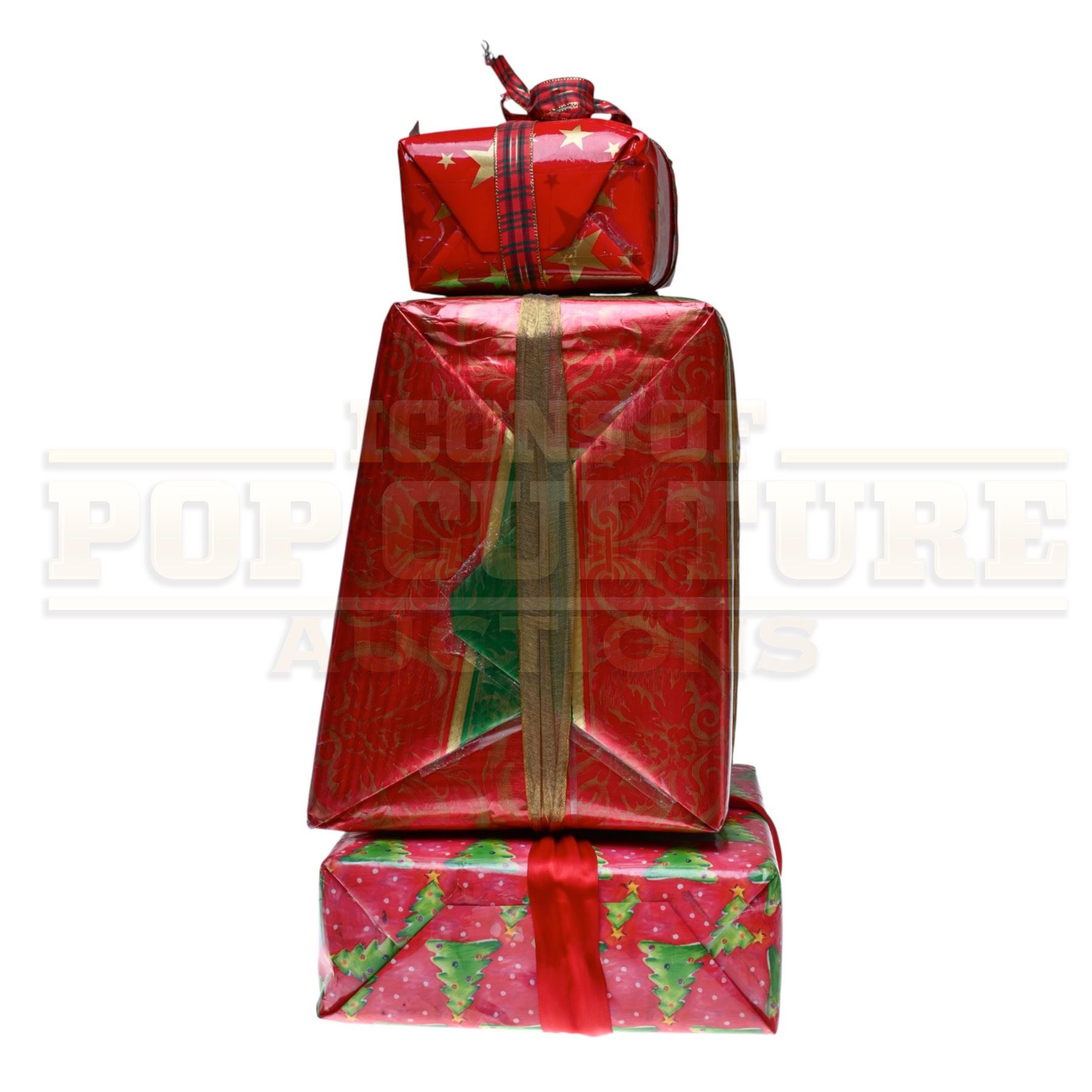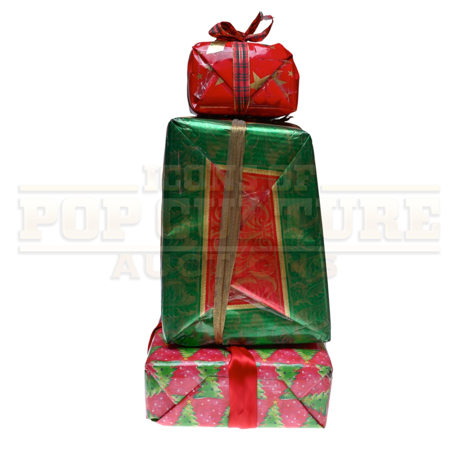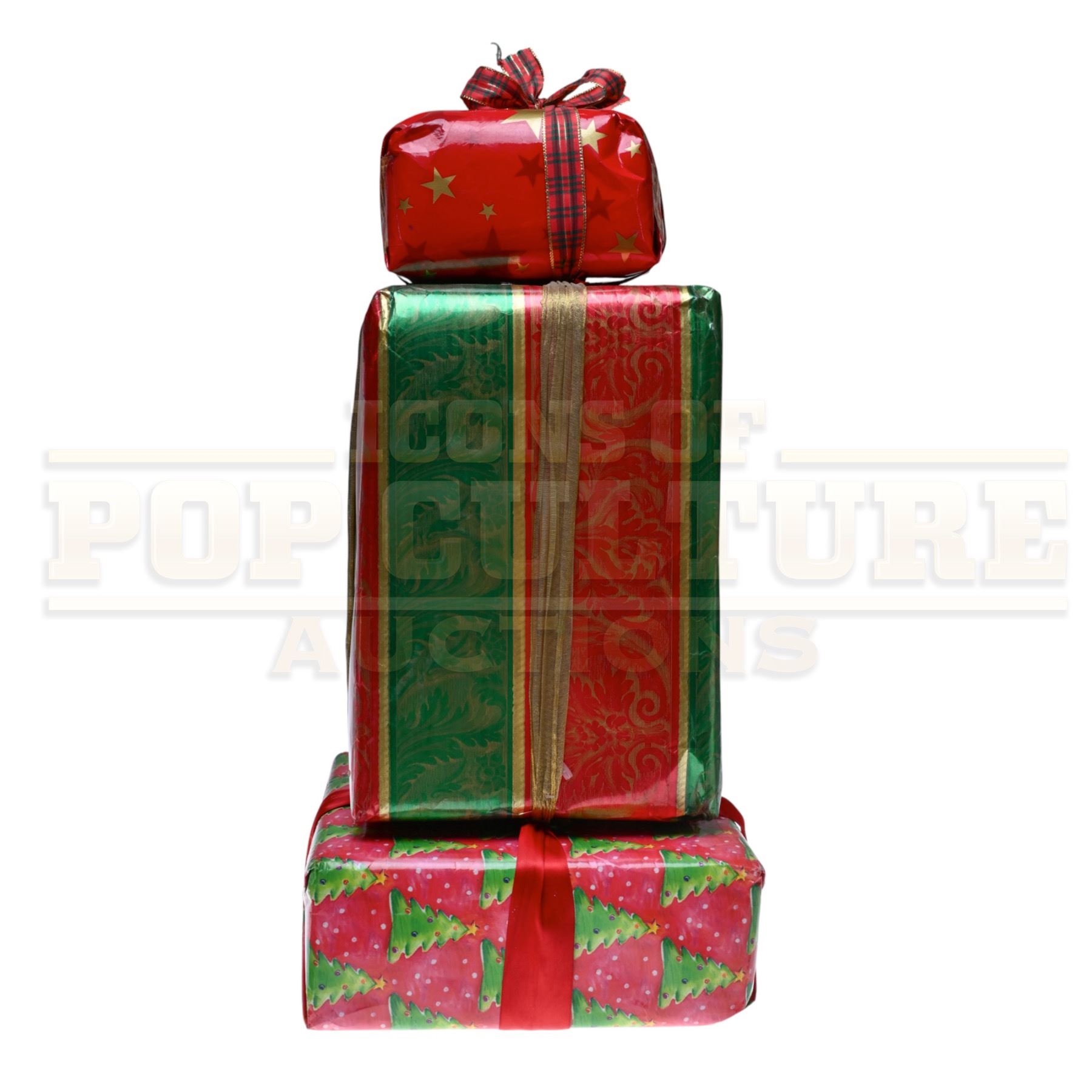 A delightfully topsy-turvy piece of Whoville magic, this screen-used trio of unbalanced gift-wrapped presents was custom-made by the production of How the Grinch Stole Christmas (2000) for use by the quirky residents of Whoville. Designed to embody the charmingly chaotic holiday spirit of the film, the stack features three brightly wrapped faux gifts, each decorated in bold, festive paper and ribbon, secured together by an internal rope or wire system.