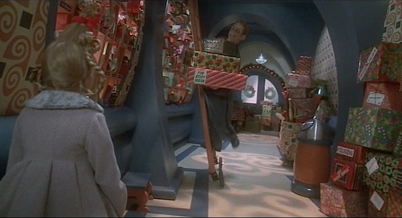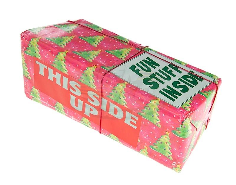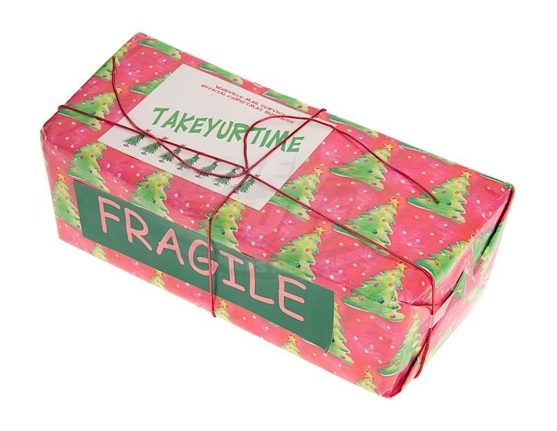 (Universal, 2000) This prop wrapped Christmas present was custom-made by the production for use by various actors and as set dressing in the various Whoville homes. The present features Christmas tree wrapping paper with Whoville Mail Service stickers applied and decorative red rope tied around to give it the finishing touch. A great display piece for collectors of the film. Measures 13" x 6" x 4" and is in good condition with only minor wear.