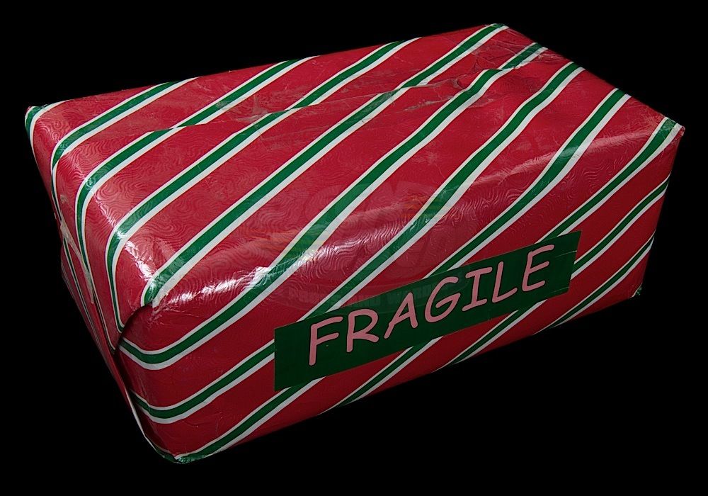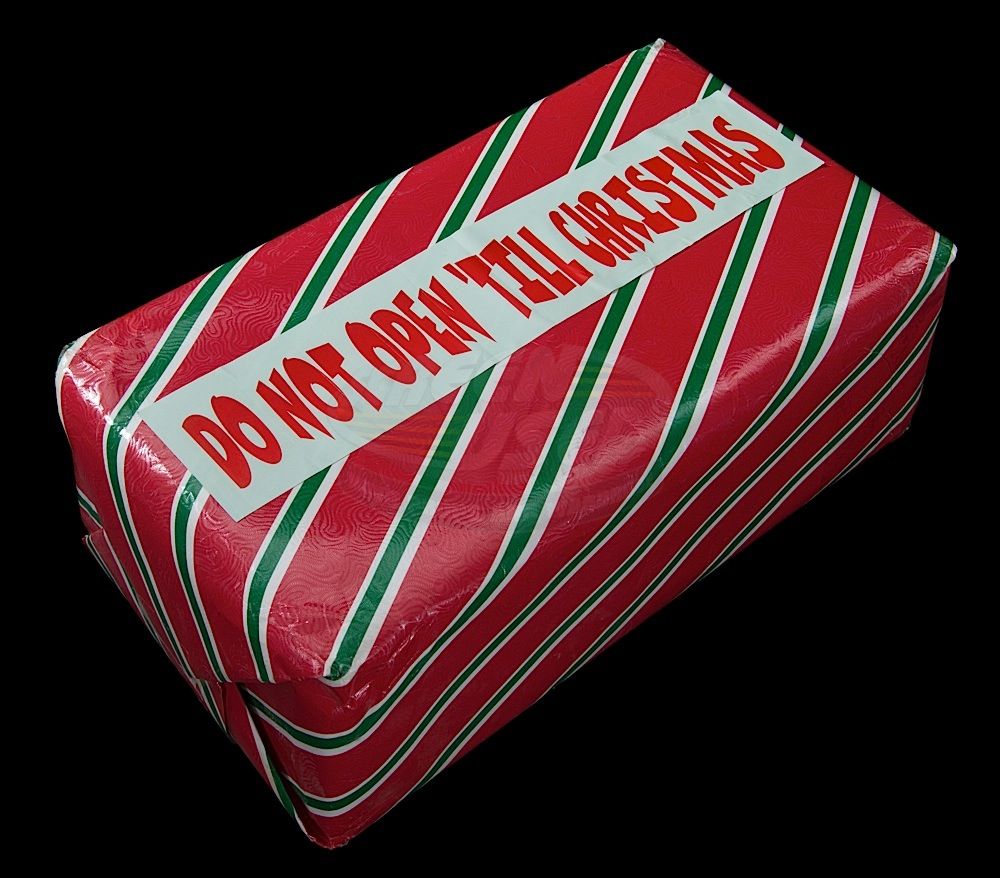 (Universal, 2000) This prop wrapped Christmas present was custom-made by the production for use by various actors and as set dressing in the various Whoville homes. The present features red wrapping paper with green and white stripes and a "Do Not Open 'Till Christmas" sticker applied. A great display piece for collectors of the film. Measures 15" x 8.5" x 6" and is in good condition with only minor wear.