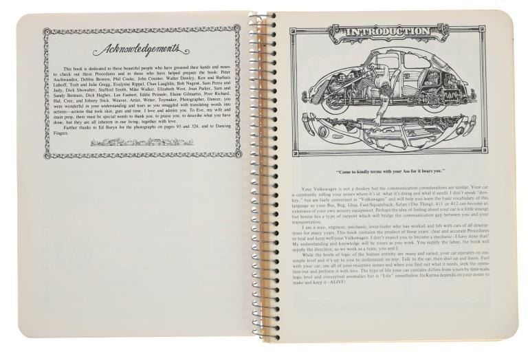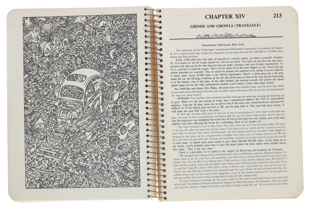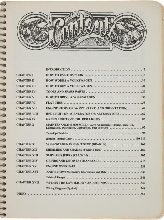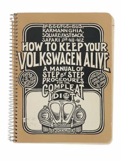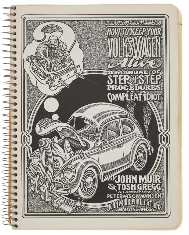 For your consideration is this 1987 edition of "How to Keep Your Volkswagen Alive: A Manual of Step by Step Procedures for the Compleat Idiot" by John Muir & Tosh Gregg and illustrated by Peter Aschwanden in Santa Fe, New Mexico. This book is spiral bound and features a tan / beige front cover with the title, the models its for, the author and a black and white graphic of a Volkswagen Beetle. The book gives extensive information on how to work on and keep your Volkswagen up and running including sections on Types I, II, III, IV, fuel injections, Beetles, Buses, Karmannghia, Square/Fastback Safari and 411 & 412. The book includes various black and white diagrams and illustrations with detailed descriptions throughout. The spiral bound book shows good condition overall with some wear from its age and use over the years but no signs of obvious damage are present. The interior pages show good condition as well with no foxing present. The book measures 10 7/8" L x 8 7/8" W x 3/4" D and weighs approximately 1 pound and 10 ounces.
