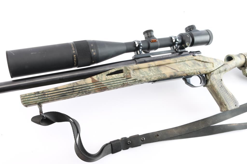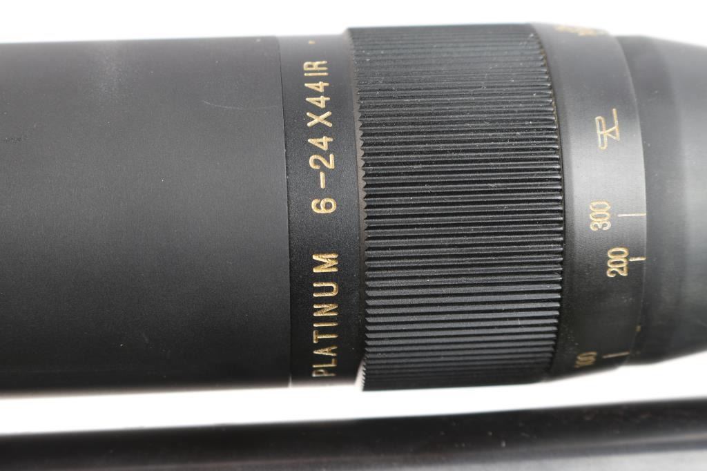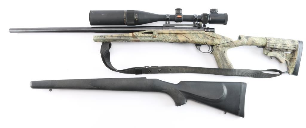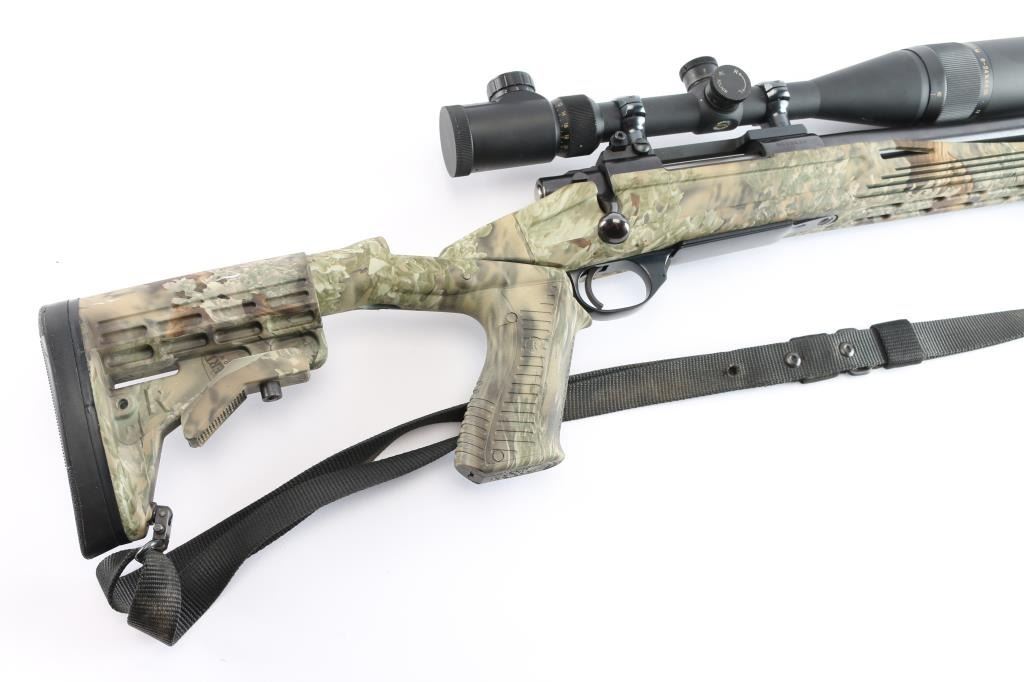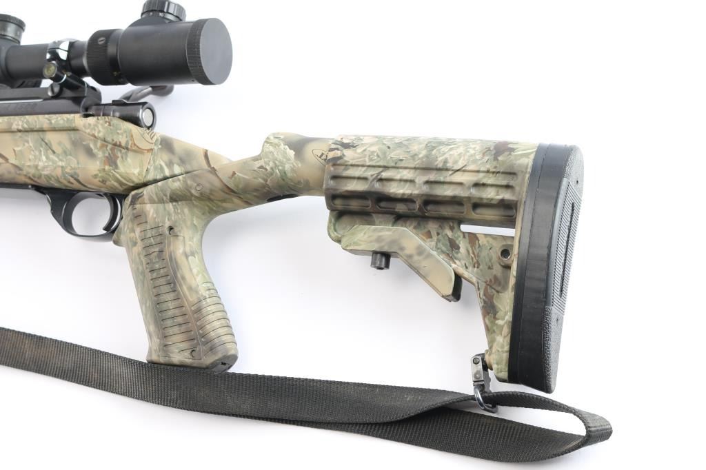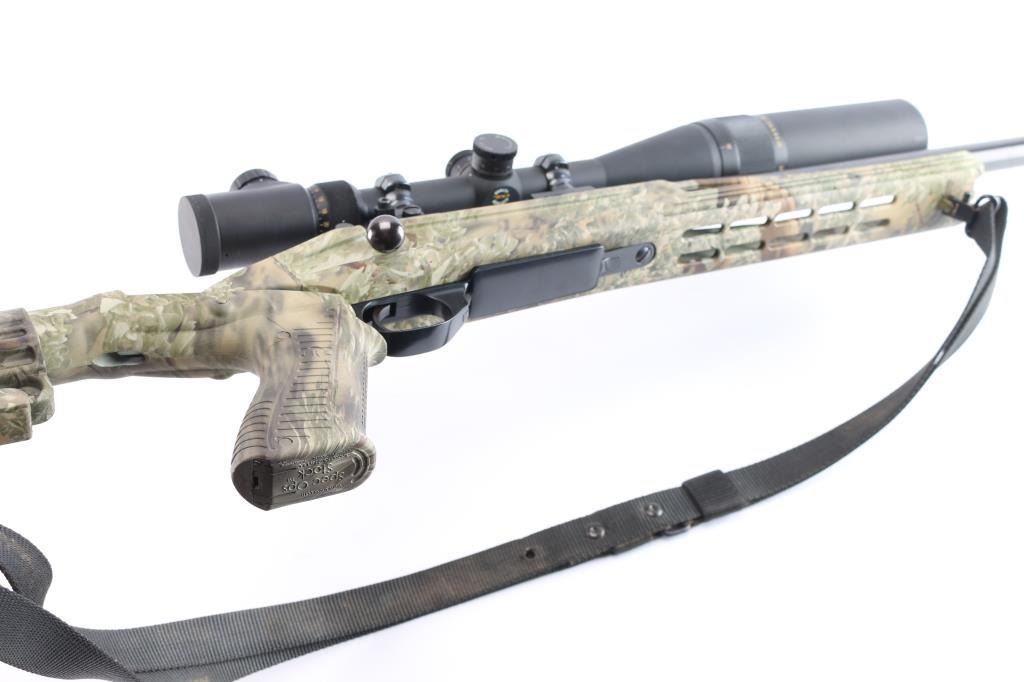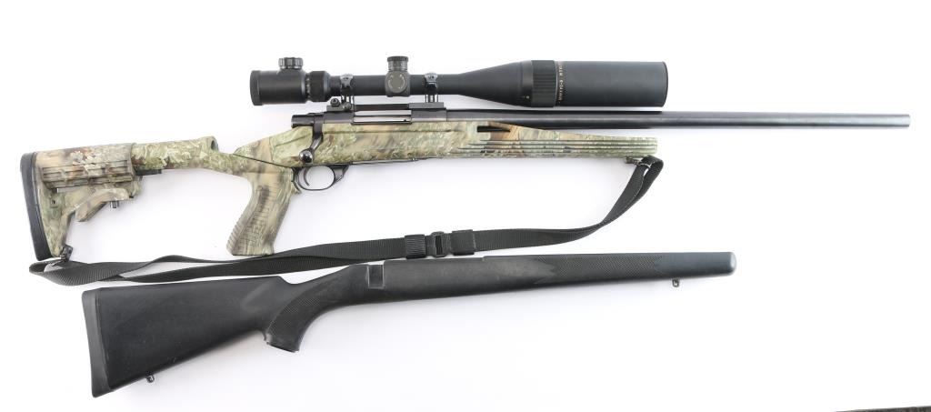 polymer stock, 24" heavy contour barrel with recessed crown, thumb safety, hinged floorplate, serrated trigger, swept back bolt handle. Stock features free float forend, adjustable length of pull, pistol grip. Bore is excellent, bright. Metal surfaces retain 98% blue with some miner rubs. Stock is excellent condition. Mounted with a excellent condition BSA Platinum 6-24X44 IR scope, adjustable objective Mil-Dot Reticle. sun shade & prism. Black nylon sling attached. Comes with black polymer short-action stock with factory solid recoil pad, sling studs.