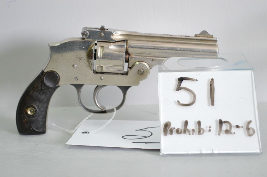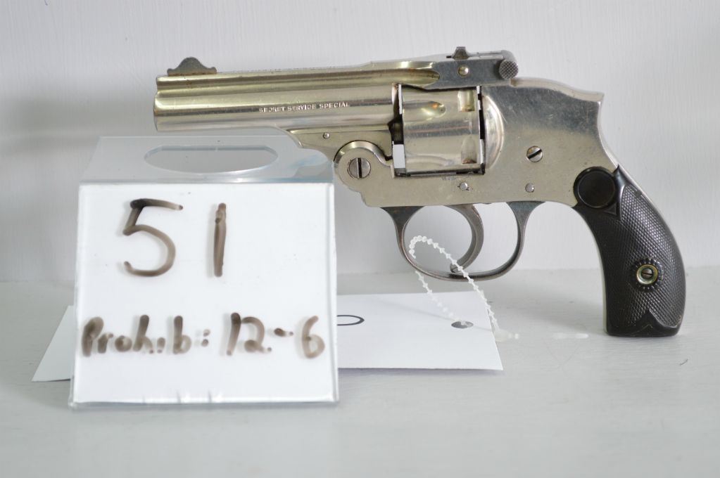 Howard Arms by Iver Johnson Mod Secret Service Special . 32 S & W cal 5 shot Revolver w/ 73 mm bbl [ nickel finish just strarting to flake in a few areas, good grips , appears to function well ] Ser # 123941 Prohib 12-6 Cert # TCI