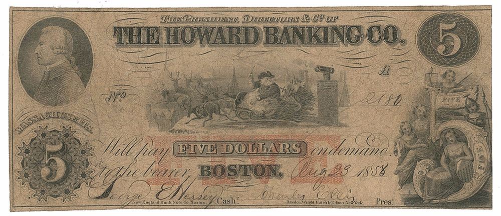 Extremely rare five-dollar bank note from The Howard Banking Company of Boston, Massachusetts, 6.75 x 2.75, issued on August 23, 1858, which features a vignette of Santa Claus and his sleigh of eight reindeer preparing to ascend from a snow-covered rooftop. Signed below by Charles Ellis and George E. Hersey. In fine condition, with moderate overall soiling.