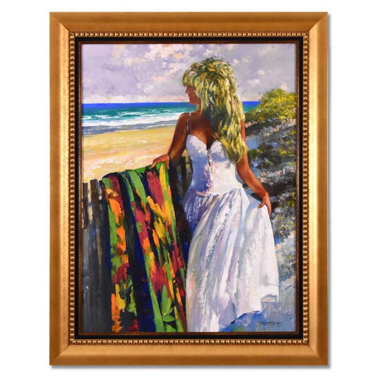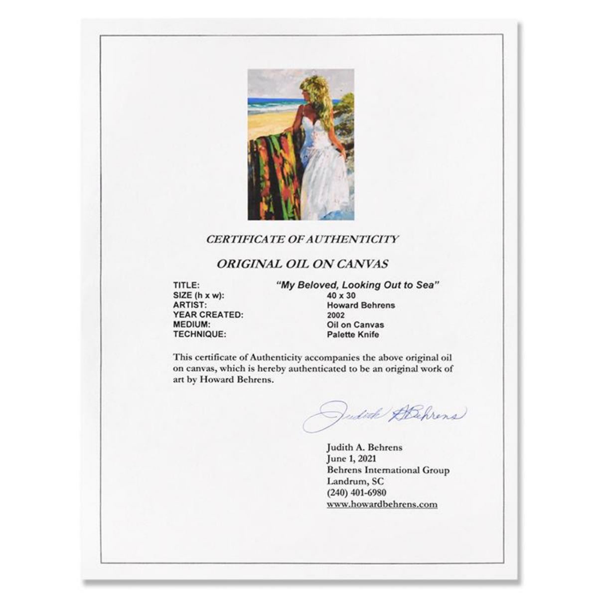 "Memories of Santorini I" is an original oil painting , on canvas, by Howard Behrens (1933-2014). This piece is hand signed by the artist and comes from the personal collection of Judi Behrens, the late artist's wife and includes a Certificate of Authenticity. This piece is framed. Measures approx. 45.5" x 33.5" (frame), 35.5" x 23.5" (image). ** Please note: there is minor wear on the corners and edges of the frame but the piece is still presentable. ** Reference #: 251023