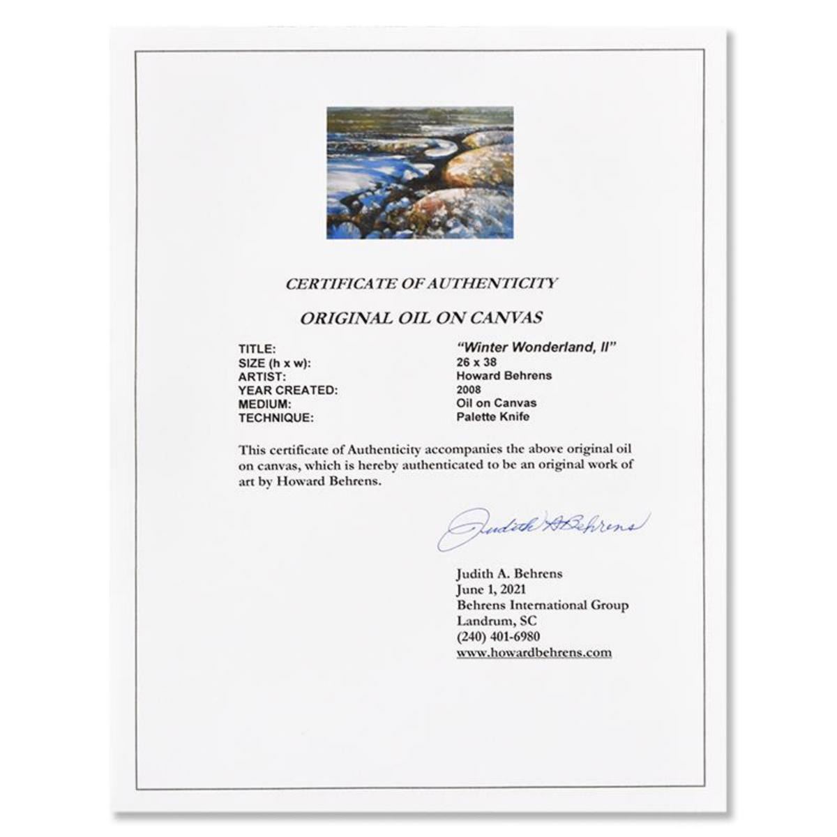 "Winter Wonderland II" is an original oil painting , on canvas, by Howard Behrens (1933-2014). This piece is hand signed by the artist and comes from the personal collection of Judi Behrens, the late artist's wife and includes a Certificate of Authenticity. This piece is custom framed. Measures approx. 42.5" x 33" (frame), 35.5" x 25.5" (image). Reference #: 251018
