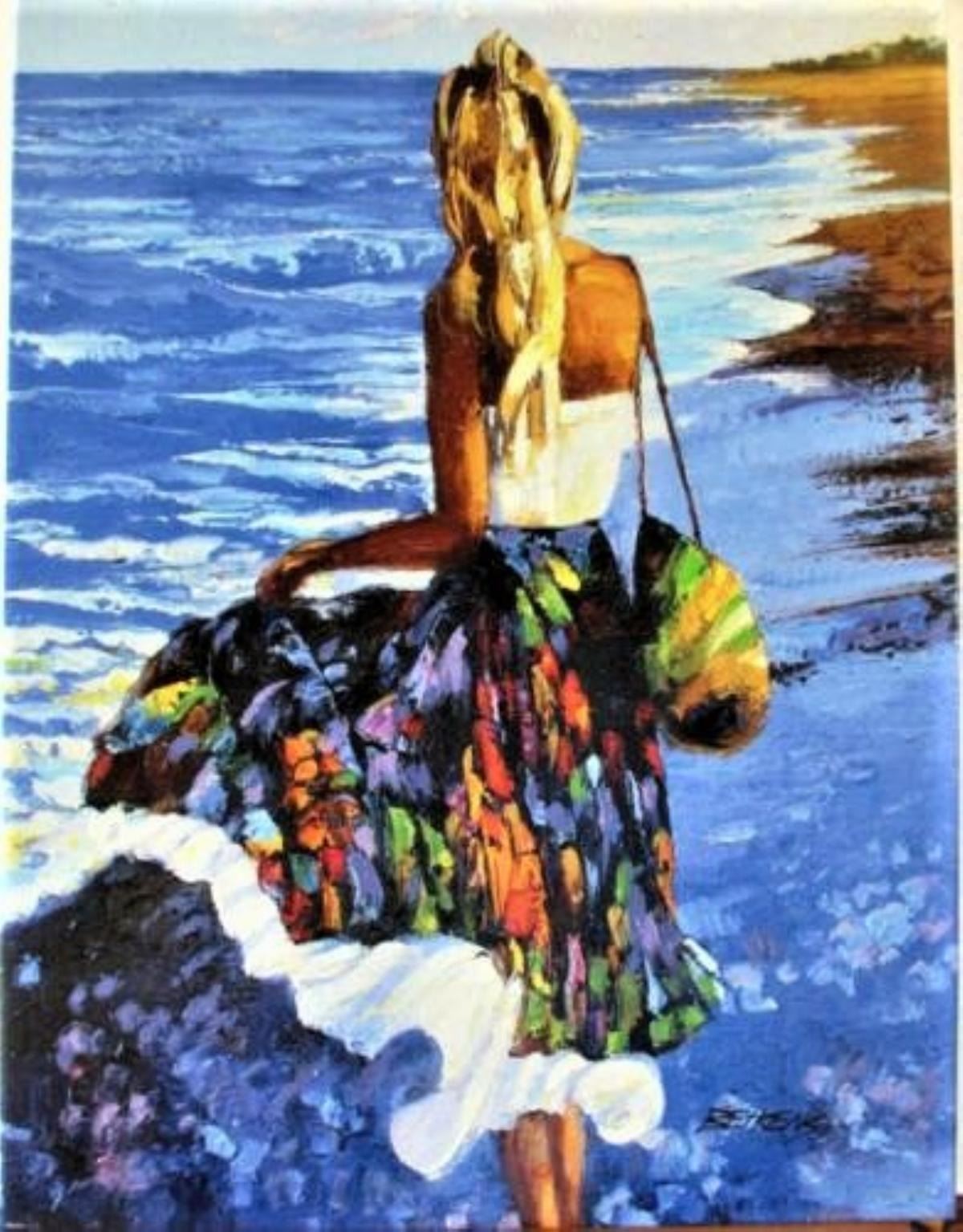 Howard Behrens "MY BELOVED BY THE SEA (from "MY BELOVED" COLLECTION)" Heavily Embellished Hand Signed and Numbered LE Stretched Canvas Giclee, Howard Behren's painted three images to honor his wife, Judy Behrens, which is know as the "My Beloved series". "My Beloved series" is the best selling Behrens edition that was every published. Publisher's Certificate of Authenticity Dimensions: 32 x 24 inches (Note: edition number received may differ from photo)