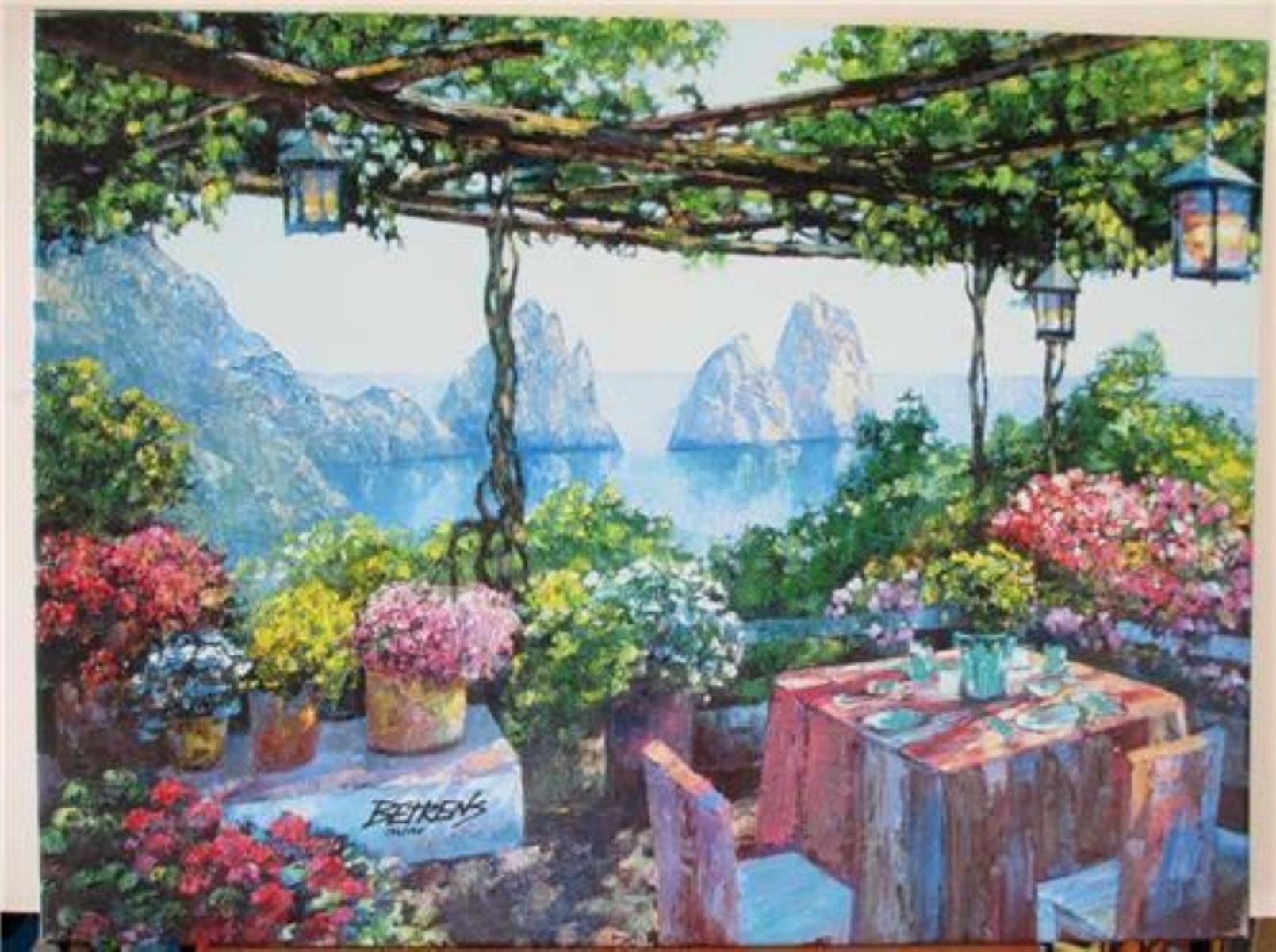 Howard Behrens TABLE FOR TWO - CAPRI. This particular piece is from the 2010 "Five Carat Diamond" collection and was a special edition for an Art Connoisseur cruise. The Five Carat Diamond Collection is considered by far the top and highest value of any of the Behrens embellished Giclees. Please note that other listings with the same title may have not come from this particular and highly sought after edition. Intensely texturized/embellished, almost looks 3-D. It is almost indistinguishable from the original oil (except for the edition number) Medium: Hand Signed Limited Edition Heavily Embellished Giclee on Stretched Canvas Dimensions: 24 x 32 inches NOTE: Edition number may differ from the one pictured.