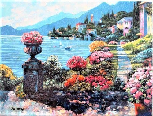 Howard Behrens "VARENNA MORNING" Heavily Embellished Hand Signed and Numbered LE Stretched Canvas Giclee, Publisher's Certificate of Authenticity Dimensions: 24 x 32 inches (Note: edition number received may differ from photo)