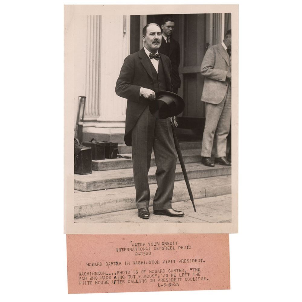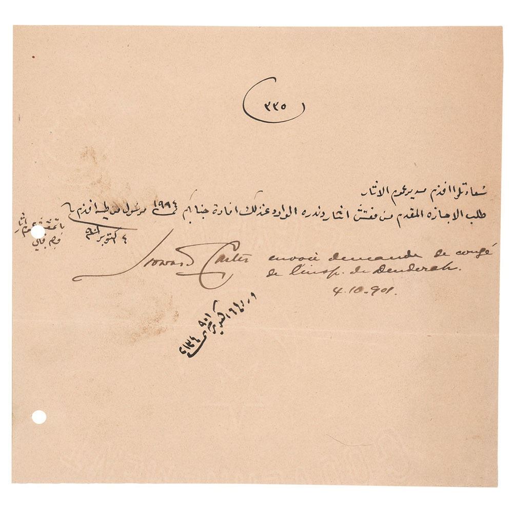 Manuscript DS in Arabic, signed “Howard Carter,†one page, 8.25 x 7.75, October 4, 1901. Untranslated document concerning the Inspector of Dendera. In very good to fine condition, with light soiling, two file holes, and two tiny pin holes. Accompanied by an original press photo of Carter, stamp-dated 1924 on the reverse. At this time, Carter was serving as Chief Inspector of Antiquities for Upper Egypt; while supervising excavations in the Valley of the Kings in 1902, he discovered the tombs of Hatshepsut and Thutmose IV. About fifty miles north of Luxor, Dendera is home to perhaps the most well preserved temple complex in all of Egypt.