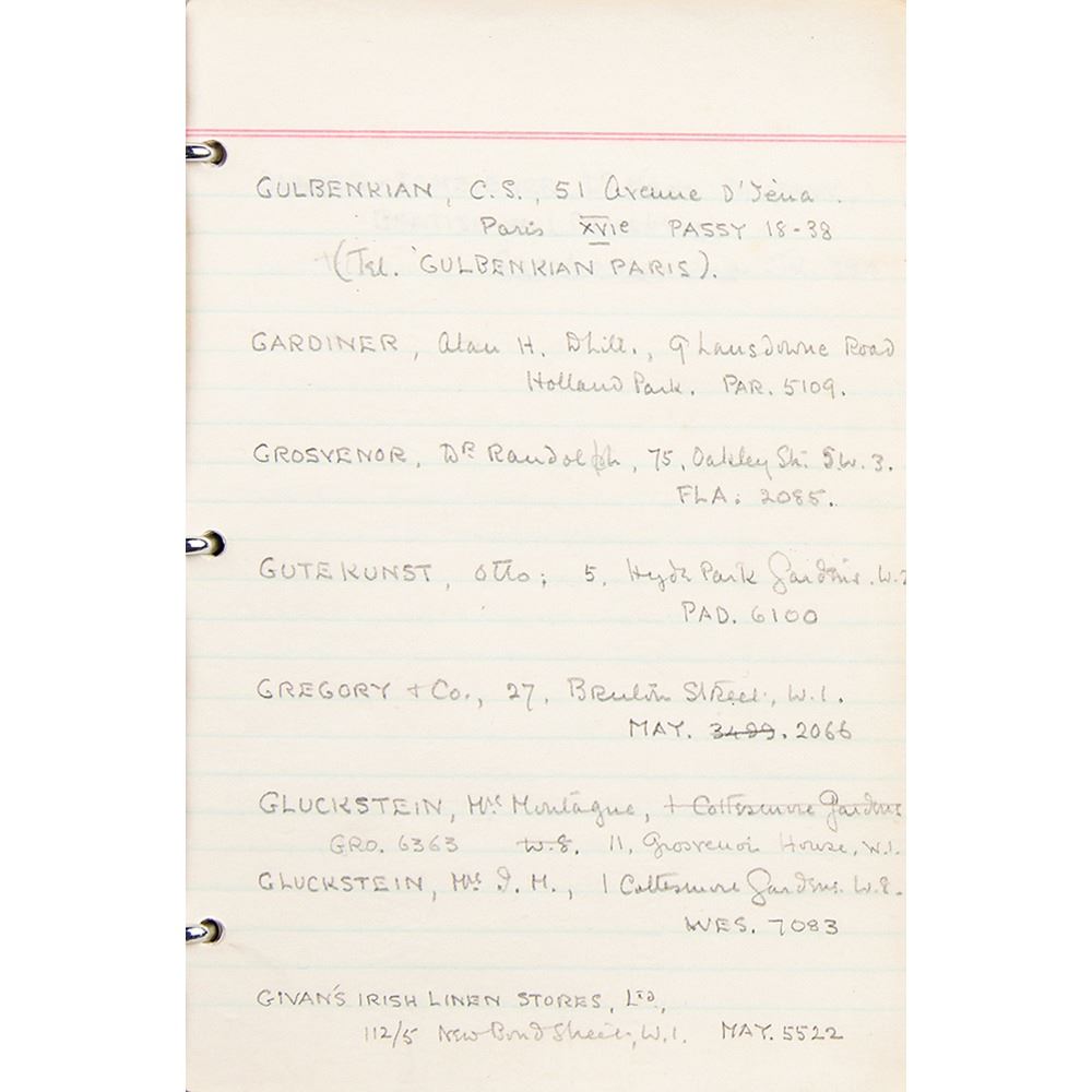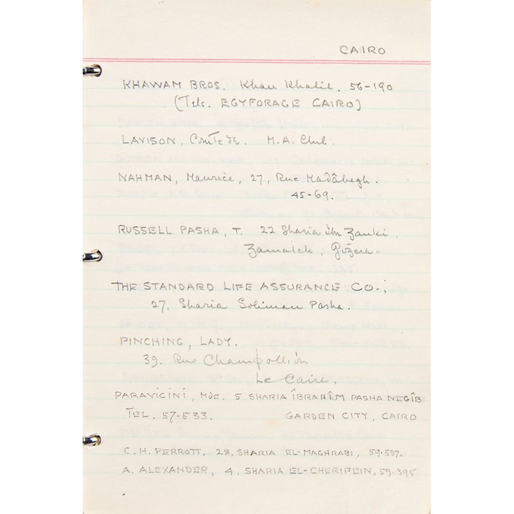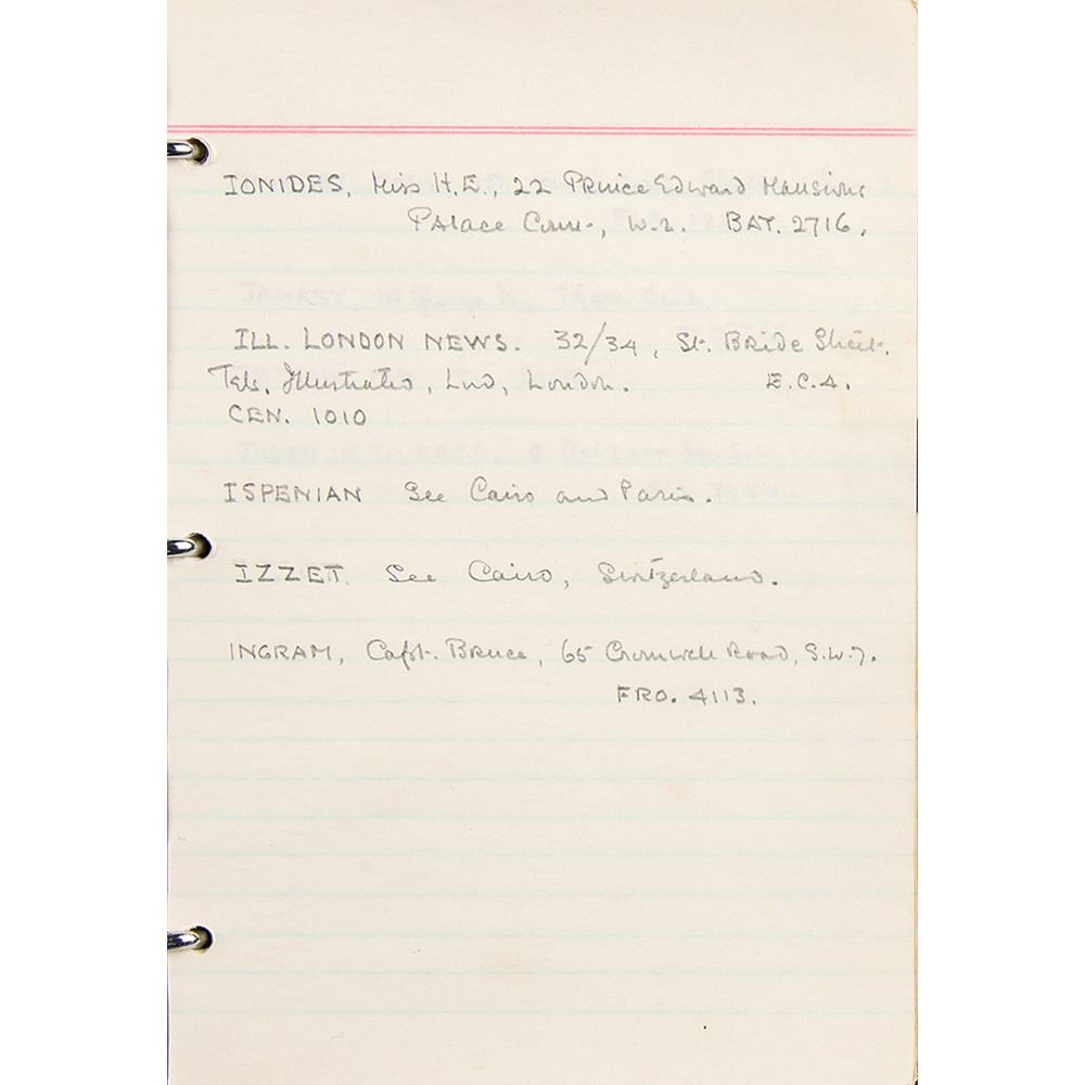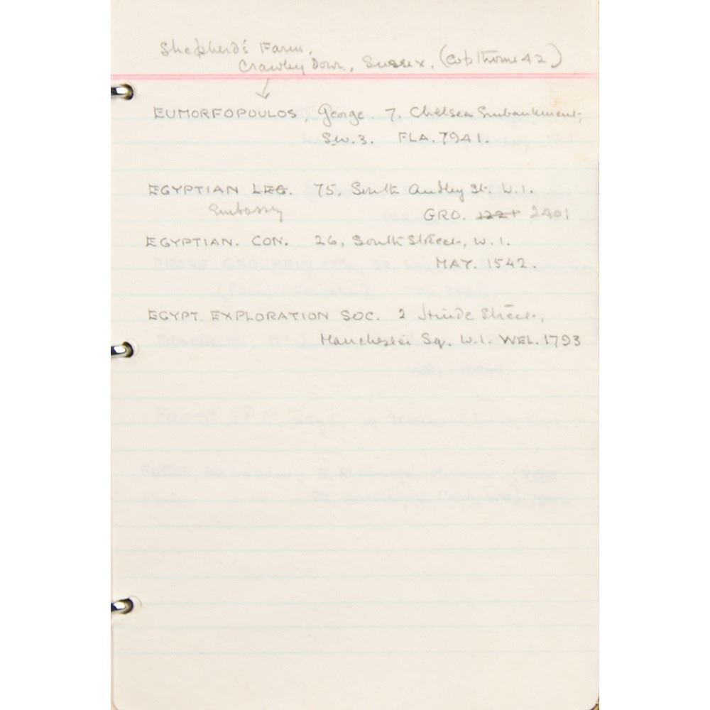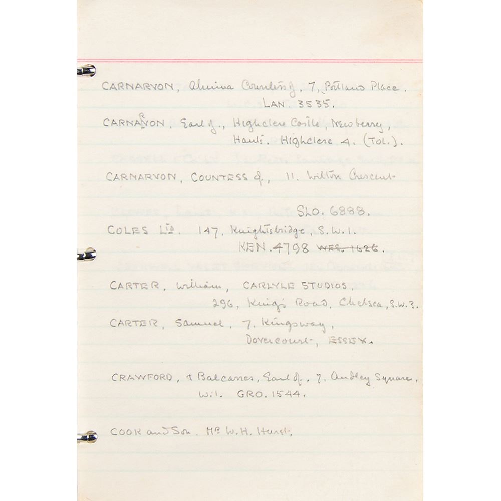 Howard Carter's personal leatherbound address book, 4.75 x 6.25, filled out in Carter's hand in pencil on 29 pages, recording the names and addresses of various associates. Among the notable names in the book are the Earl of Carnarvon (sponsor of the excavation of King Tut's tomb), William Carter (his brother), the Egyptian Embassy, the Egypt Exploration Society, Helen Ionides, the Illustrated London News, Otto Gutekunst (art dealer), Khawam Bros. (Egyptian antiquities dealers), Robert Mond (chemist and archaeologist), Percy Newberry (Egyptologist), Alexander Scott (chemist and director of scientific research at the British Museum), Spink & Son (auctioneers), and more. In fine condition, with some pages loose and the address label of his nephew, John E. Carter, affixed inside the front cover.