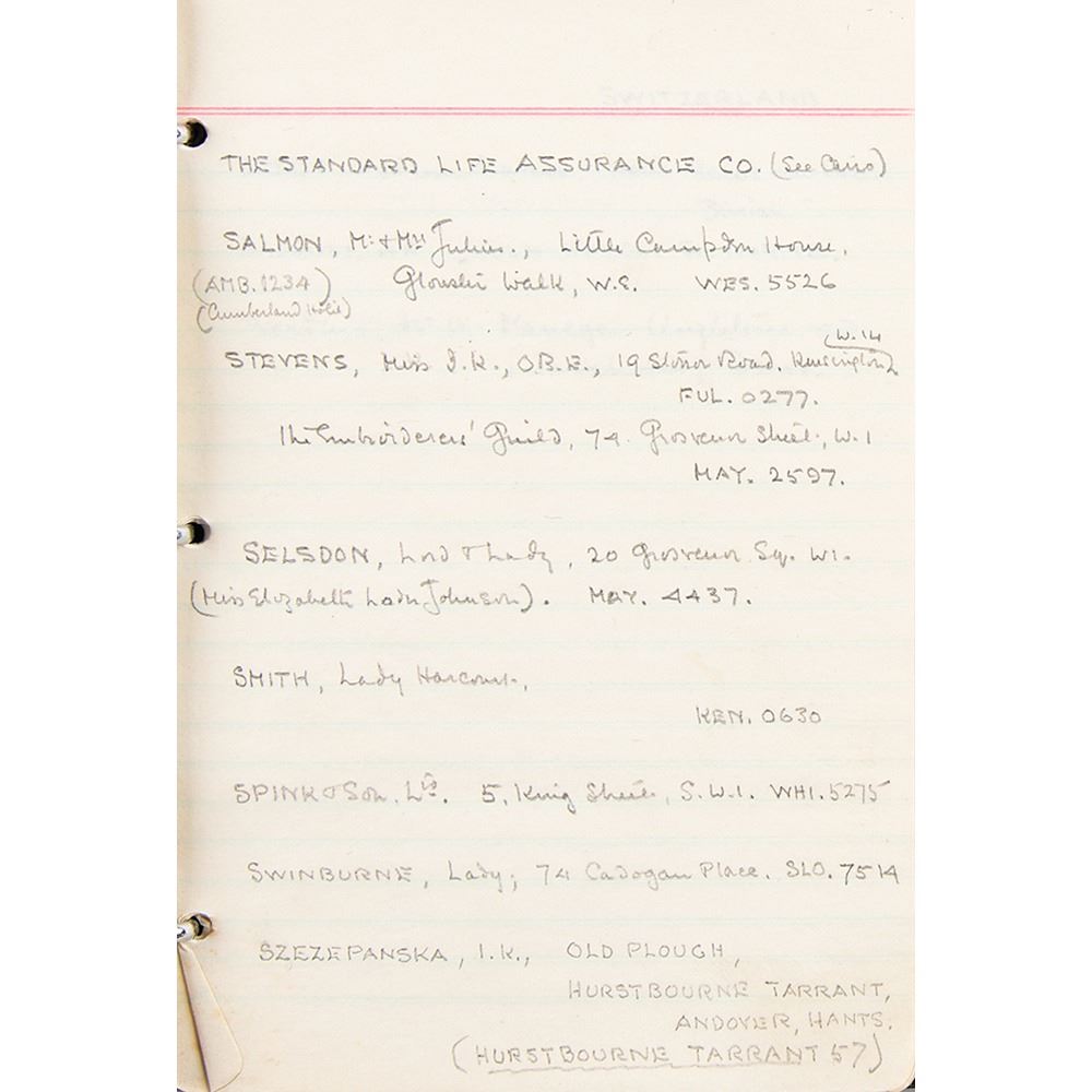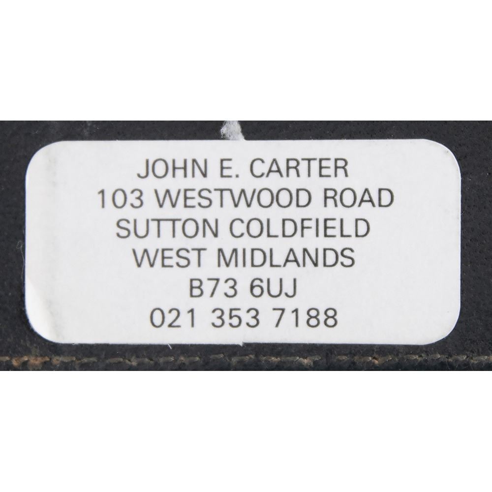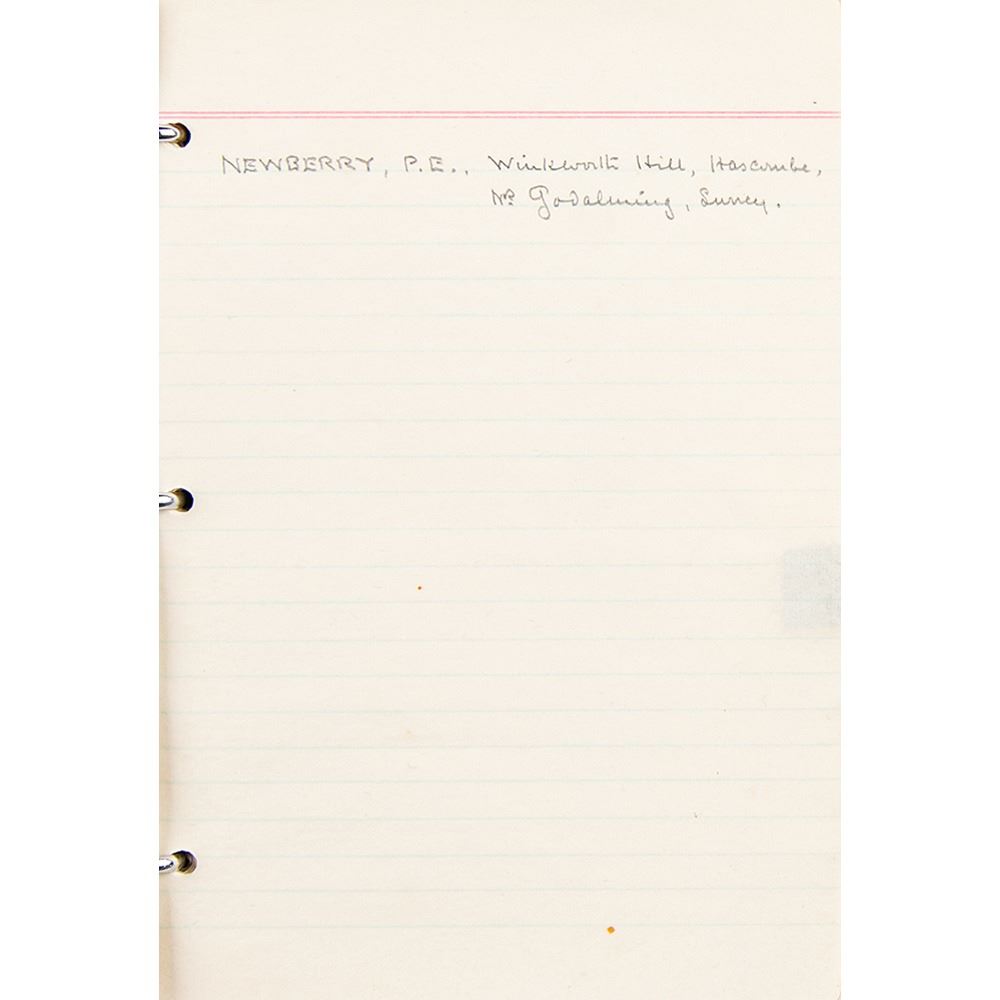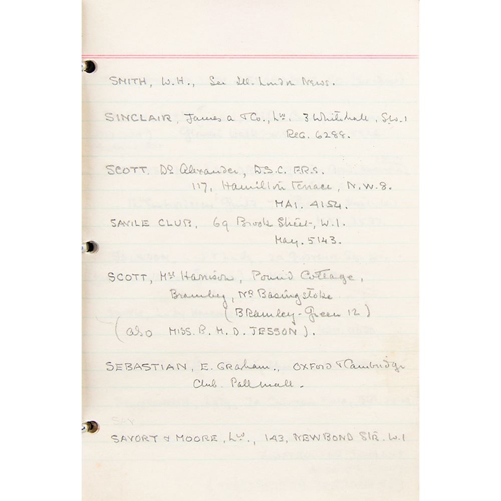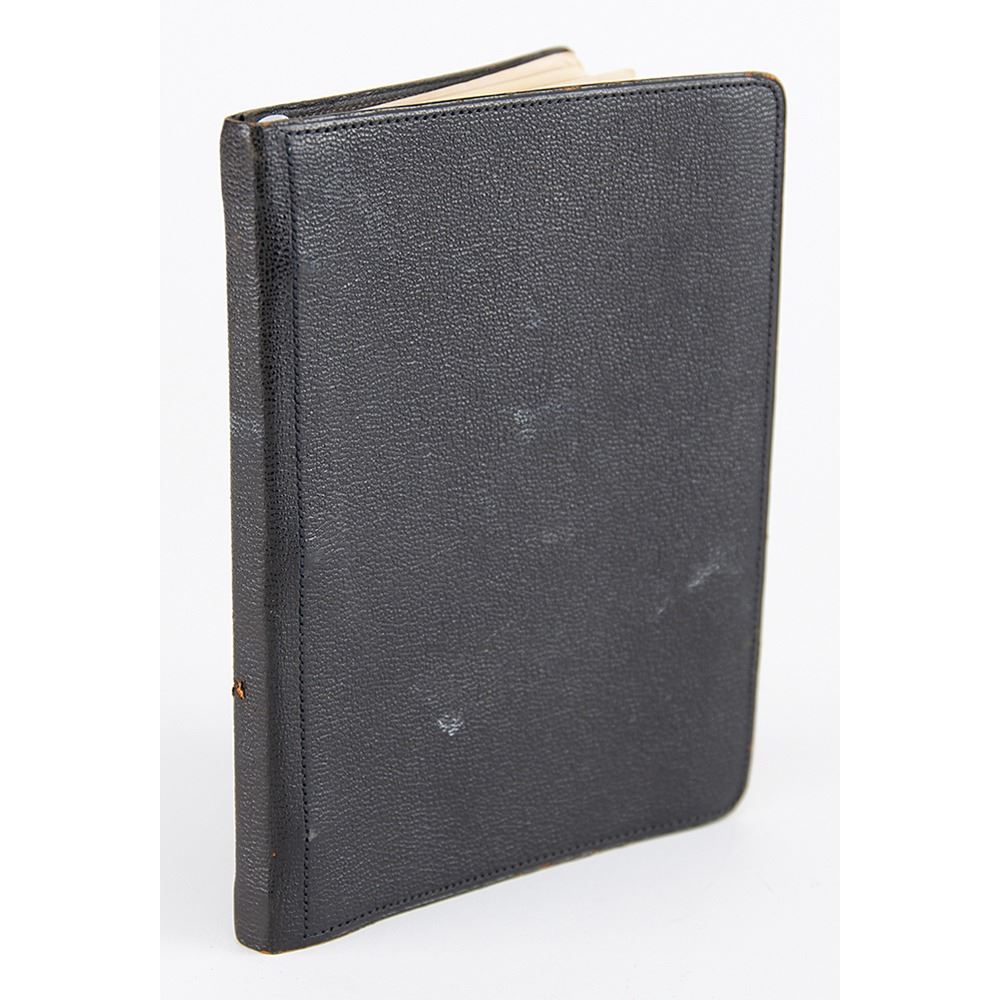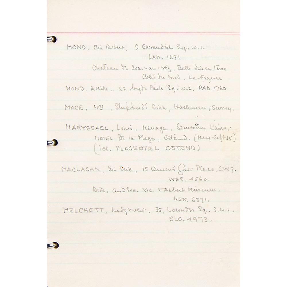 Howard Carter's personal leatherbound address book, 4.75 x 6.25, filled out in Carter's hand in pencil on 29 pages, recording the names and addresses of various associates. Among the notable names in the book are the Earl of Carnarvon (sponsor of the excavation of King Tut's tomb), William Carter (his brother), the Egyptian Embassy, the Egypt Exploration Society, Helen Ionides, the Illustrated London News, Otto Gutekunst (art dealer), Khawam Bros. (Egyptian antiquities dealers), Robert Mond (chemist and archaeologist), Percy Newberry (Egyptologist), Alexander Scott (chemist and director of scientific research at the British Museum), Spink & Son (auctioneers), and more. In fine condition, with some pages loose and the address label of his nephew, John E. Carter, affixed inside the front cover.