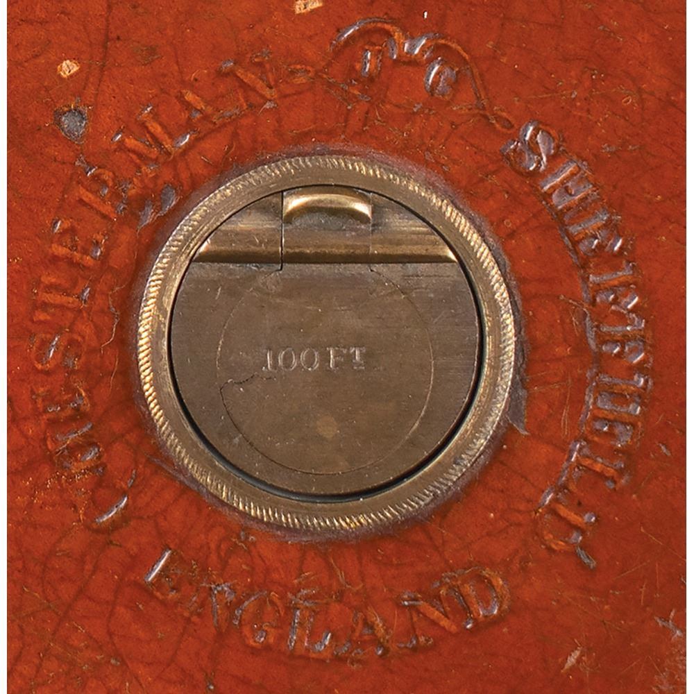 Howard Carter's personally-owned 100-foot measuring tape by Chesterman of Sheffield, England, the fine leather-wrapped case measuring 6˝ in diameter and embossed with the maker's name on both sides. At the side is a brass tag, which is used to draw the tape out; at the center is a brass catch used to wind the tape back in. The tape itself is rather toned, and has clearly been put to much use, with the first dozen numbers worn and reinforced in mapping ink—one can only imagine the journeys it undertook as part of Carter's kit, and what treasures of Egyptian antiquity it might have measured. In overall very good to fine condition, with expected wear from heavy use and scuffing to leather.