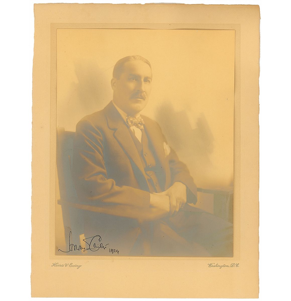 British archaeologist and Egyptologist (1874–1939) whose 1922 discovery of the tomb of Tutankhamun in Egypt’s ‘Valley of the Kings’ proved to be one of the signal events in the history of archaeology. Magnificent vintage matte-finish 7.5 x 9.75 three-quarter-length portrait of Carter sitting in a chair, affixed to its original 9.75 x 12.5 Harris & Ewing photographer’s mount, signed in the lower left in black ink, “Howard Carter, 1924.” In fine condition, with mild silvering to dark areas of the image. In 1924, Carter gave 24 lectures about King Tut in the United States, and spoke in Washington, D. C. on May 8–9, when he almost certainly sat for this portrait at the Harris and Ewing studio. Carter returned to England that summer and returned to Cairo in December. This is the only Howard Carter signed photo we have ever encountered, and its bold signature and large size make it a superlative and probably unique specimen.